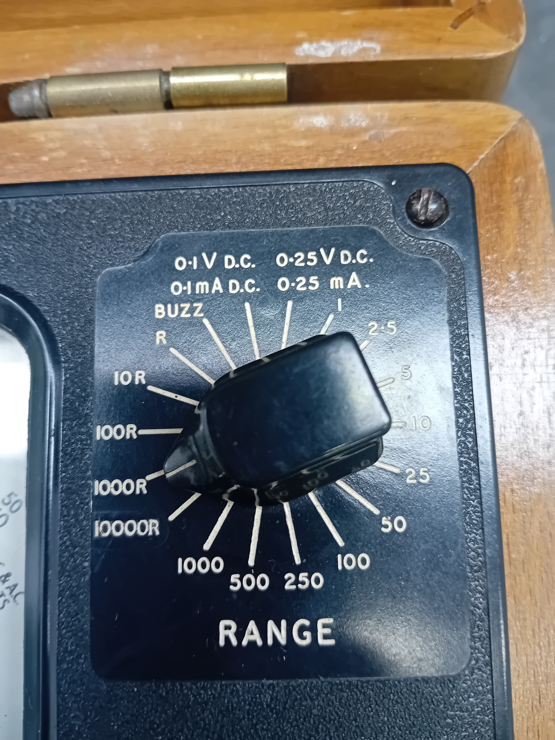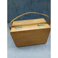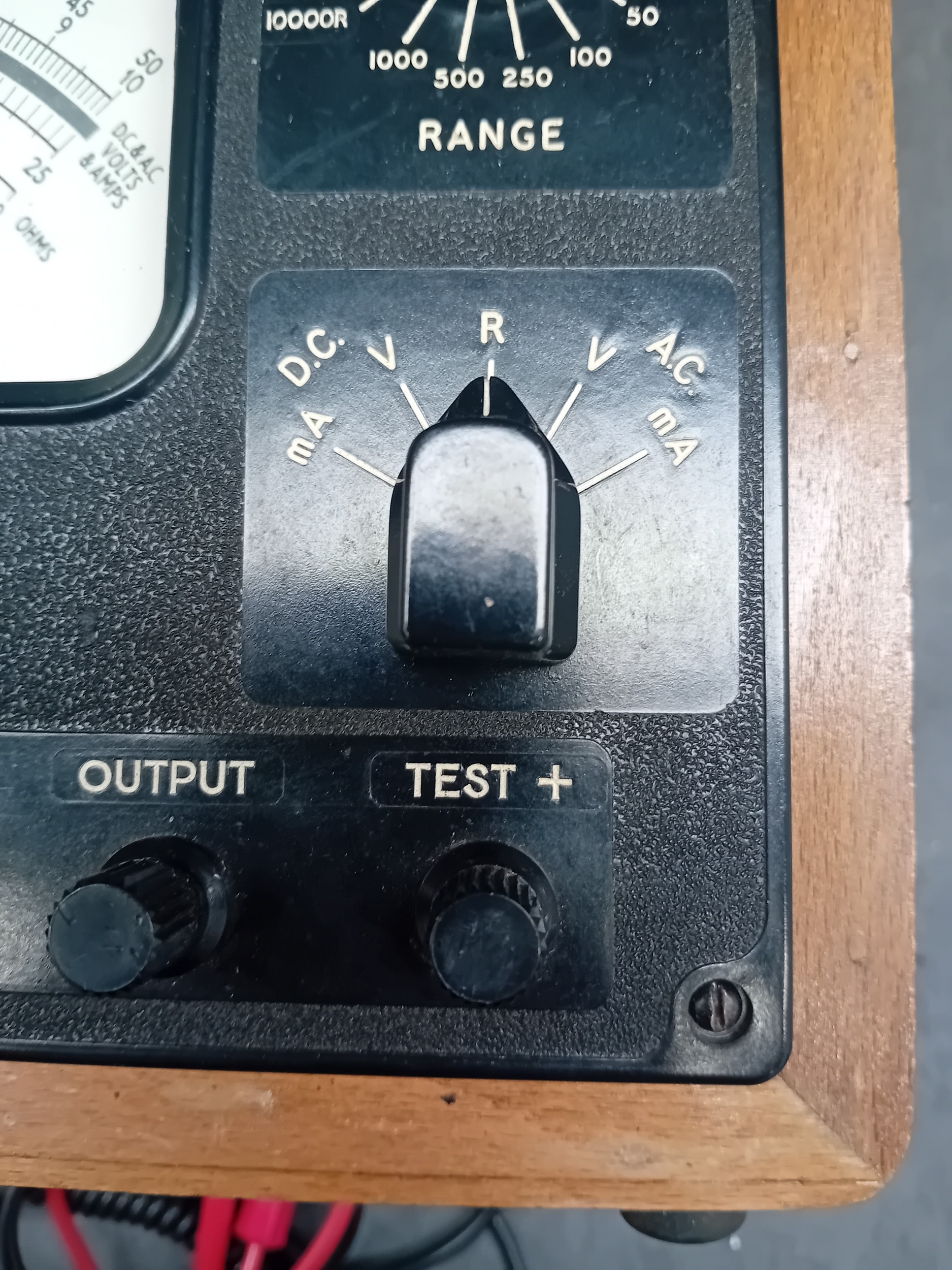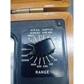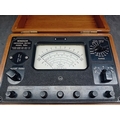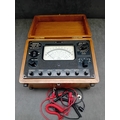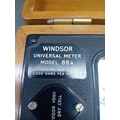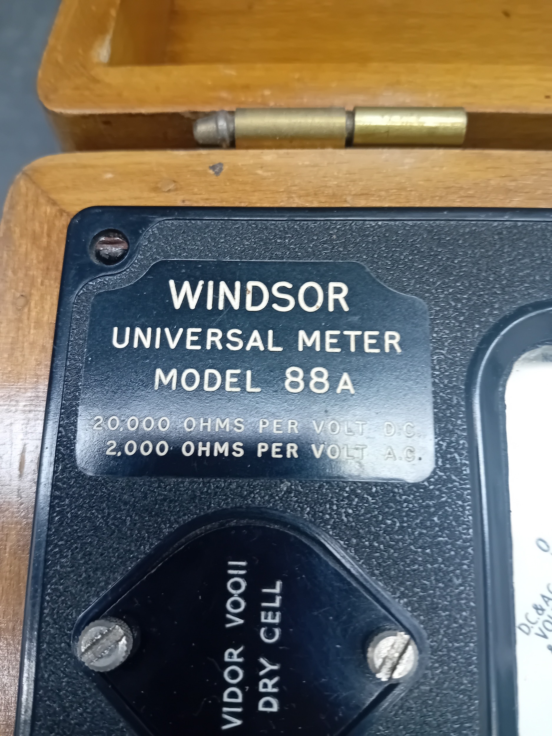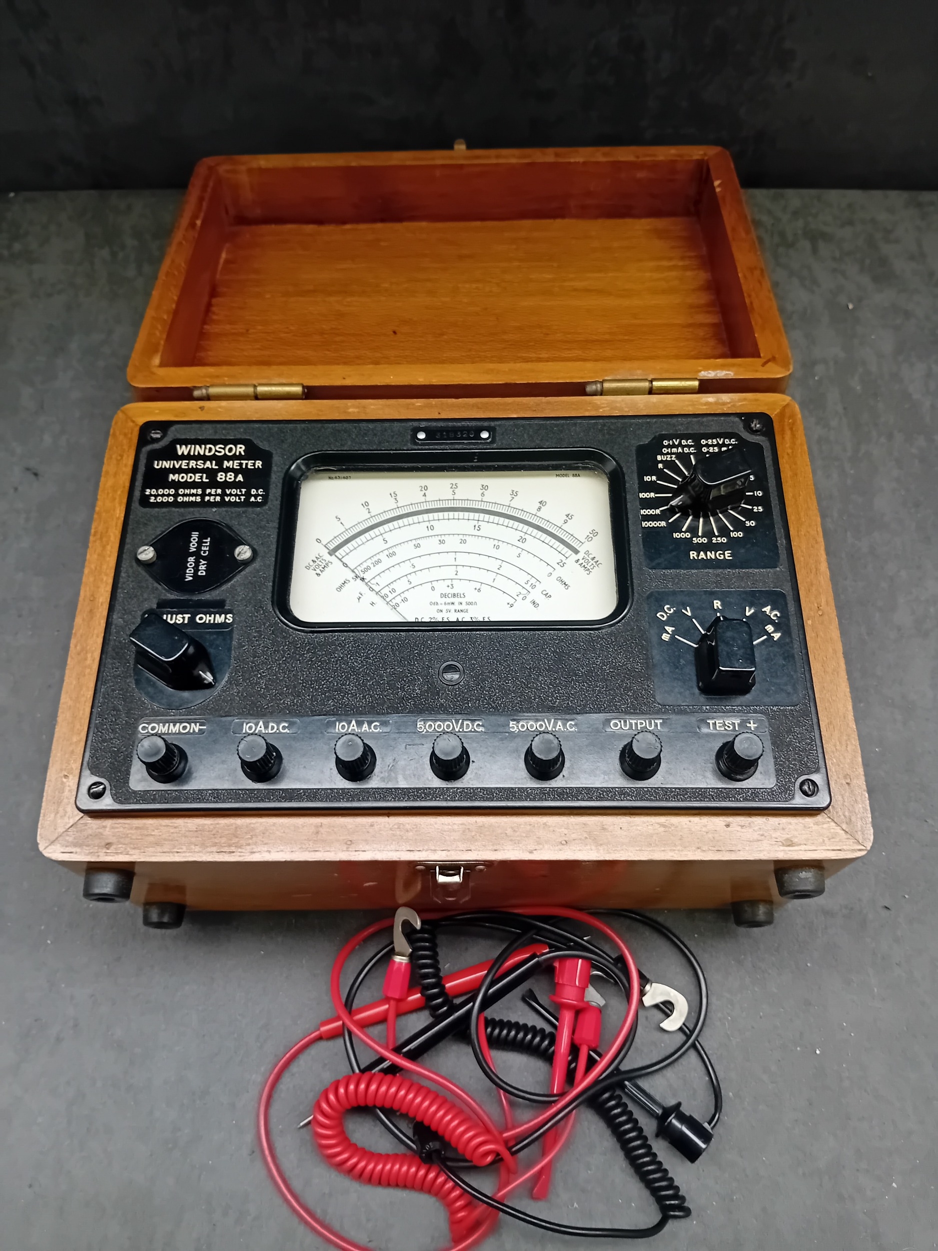 A vintage Windsor Universal Meter, Model 88A, presented in a hinged, lacquered wooden carrying case with brass-toned metal hardware. The instrument is accompanied by red and black coiled test leads. The meter itself features a dark, likely bakelite or phenolic, front panel with an analog dial displaying scales for DC Volts & Amps, AC Volts & Amps, Ohms, and Decibels. Key visible markings include "WINDSOR UNIVERSAL METER MODEL 88A, " "20,000 OHMS PER VOLT D.C., " "2,000 OHMS PER VOLT A.C., " and "VIDOR VOQII DRY CELL" on a battery compartment cover. A serial number "318320" is located above the main dial. Multiple black plastic selector knobs are present for "ADJUST OHMS, " "RANGE" (with various voltage, current, and resistance settings), and function selection (DC V/mA, R, AC V/mA). Labeled input terminals include "COMMON, " "10A.D.C., " "5000V.D.C., " "OUTPUT, " and "TEST +". The overall aesthetic is consistent with a mid-20th-century electronic testing instrument.