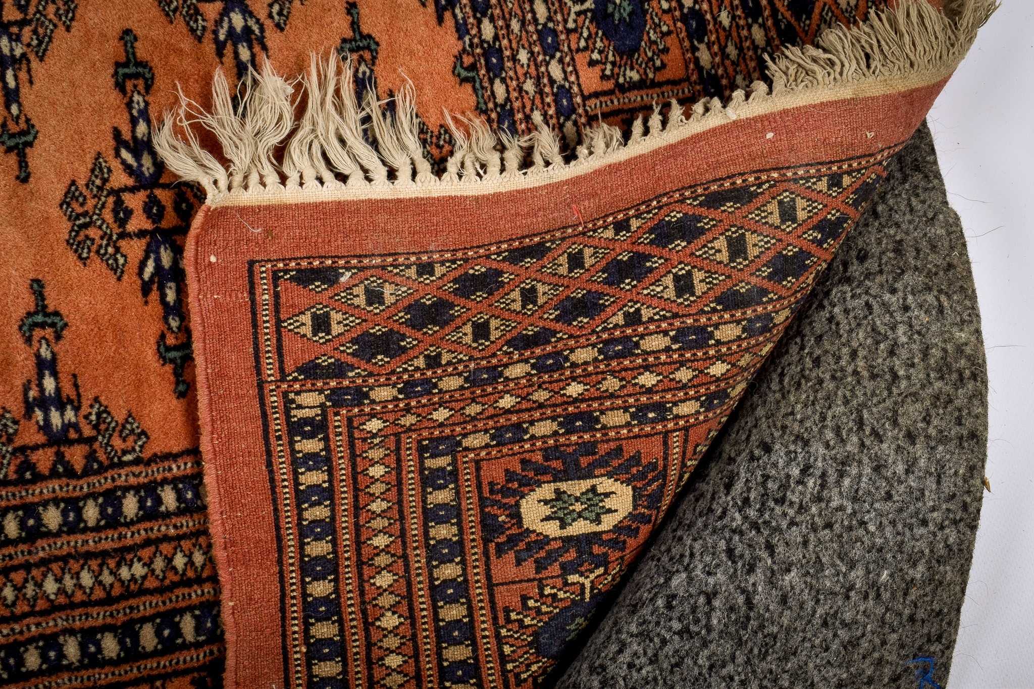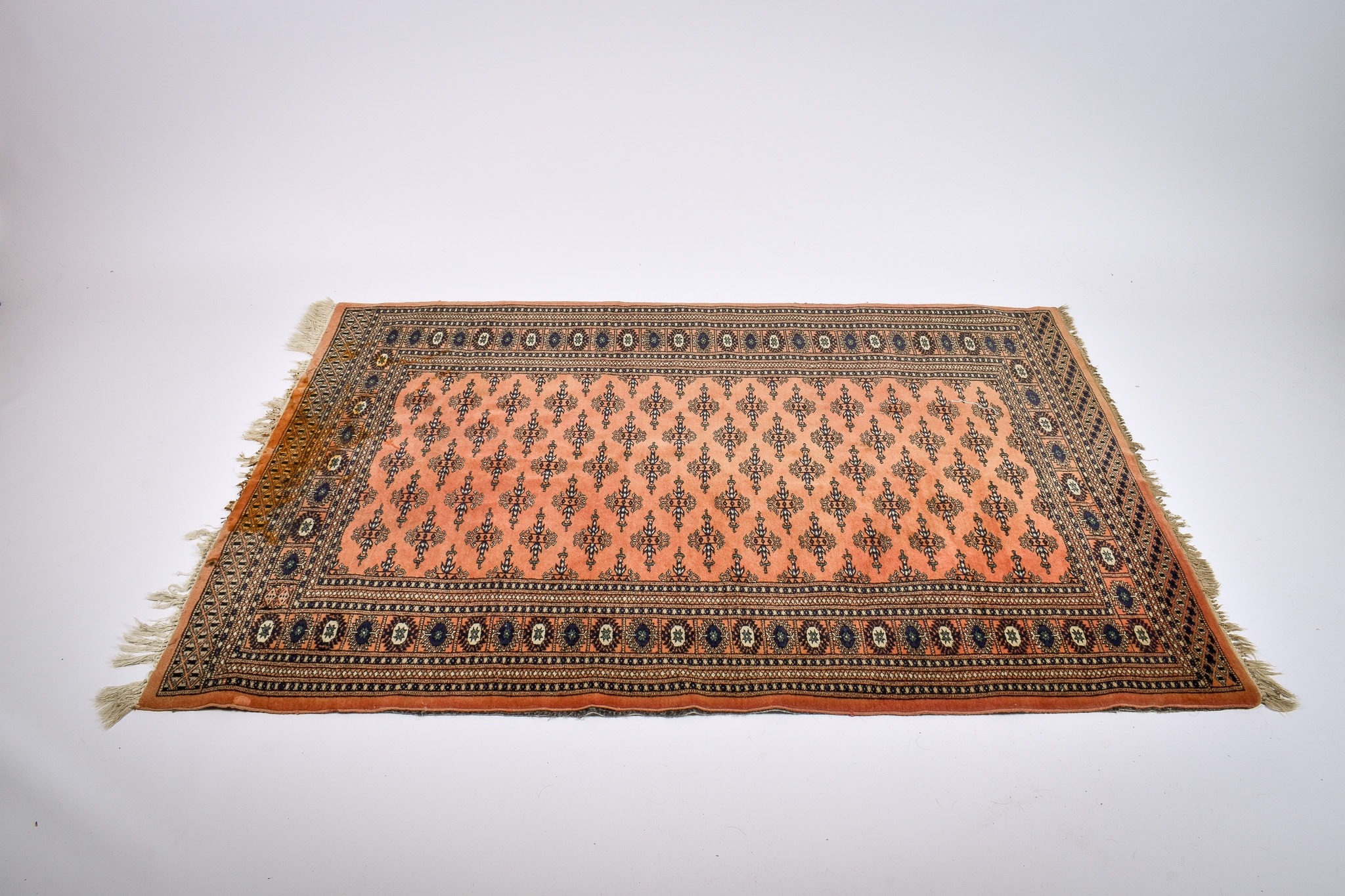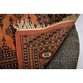 A Persian style wool rug on a cinnamon ground. Having multiple geometric borders with traditional stylized central design. 175cm x 129cm