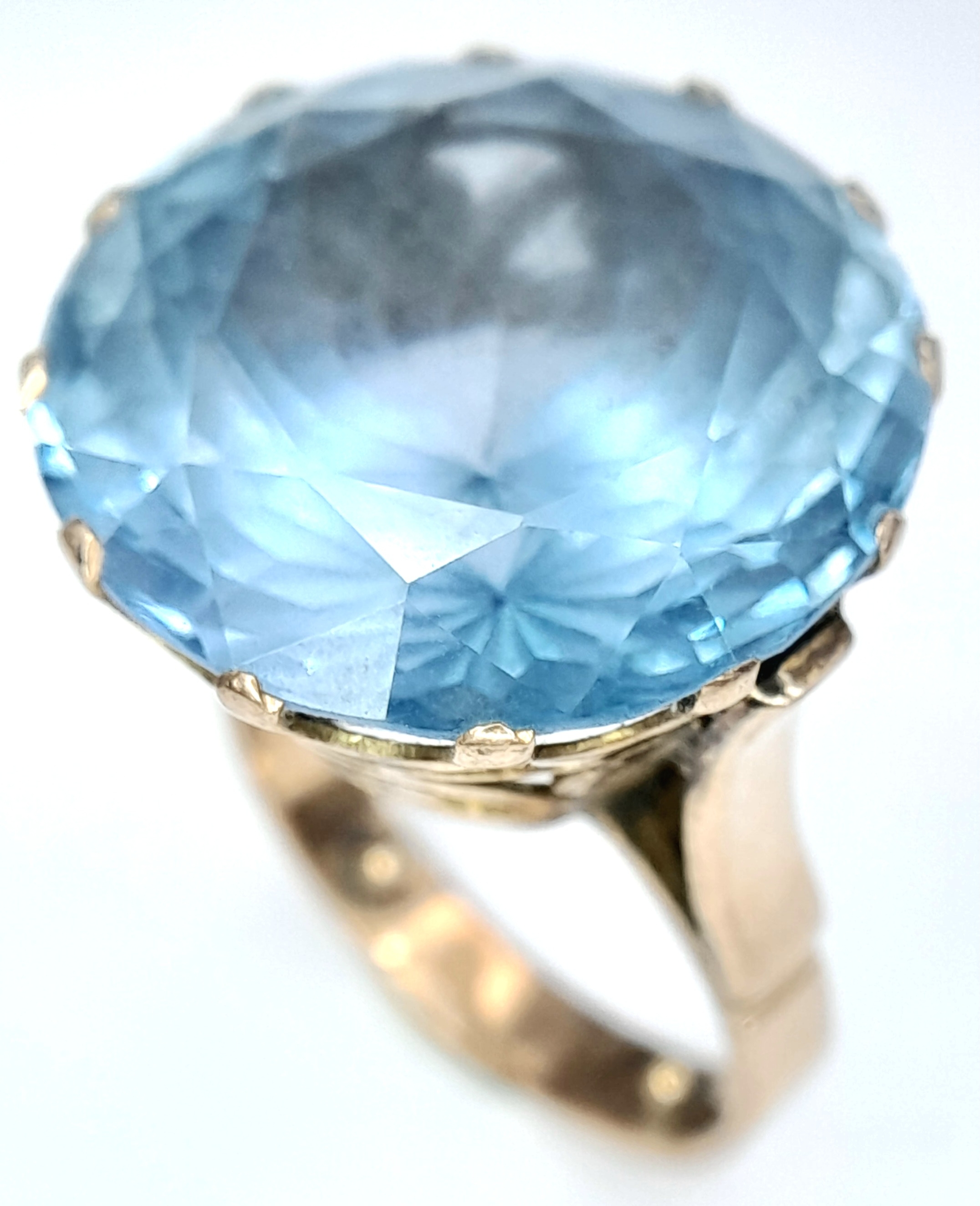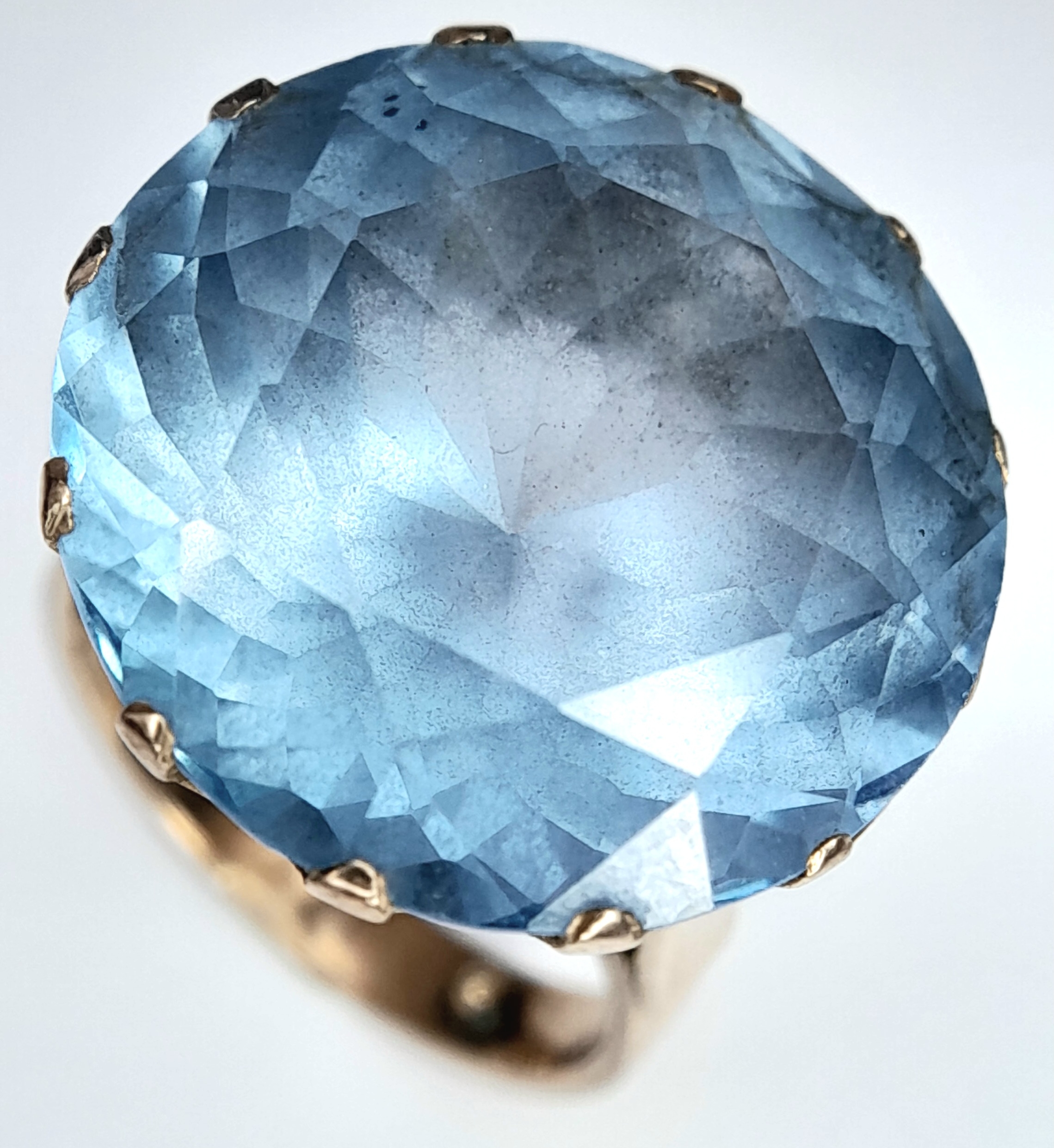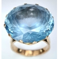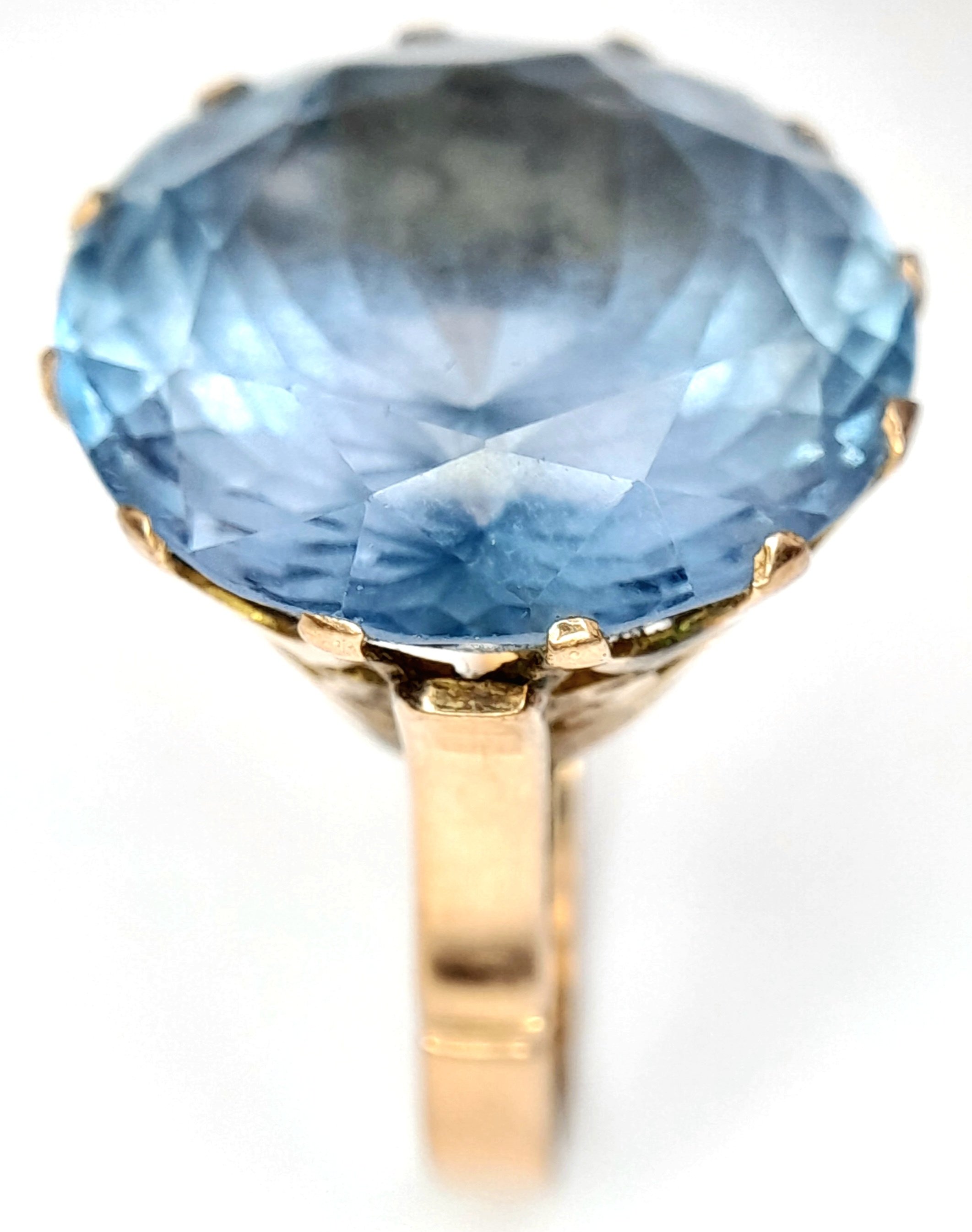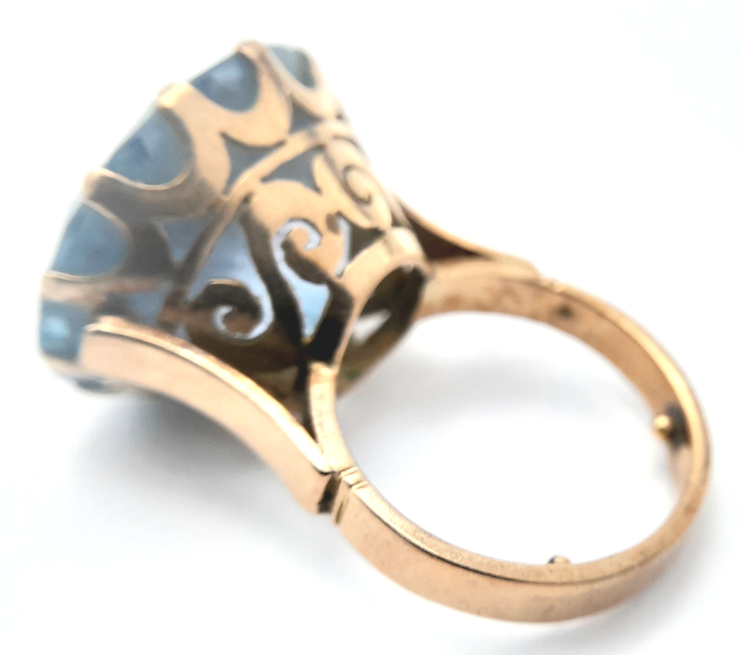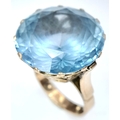 A Gorgeous Vintage 14K Yellow Gold Large Aquamarine Cocktail Ring. A c.25ct beautifully faceted round cut centre stone which catches the light perfectly. 10.1g total weight.