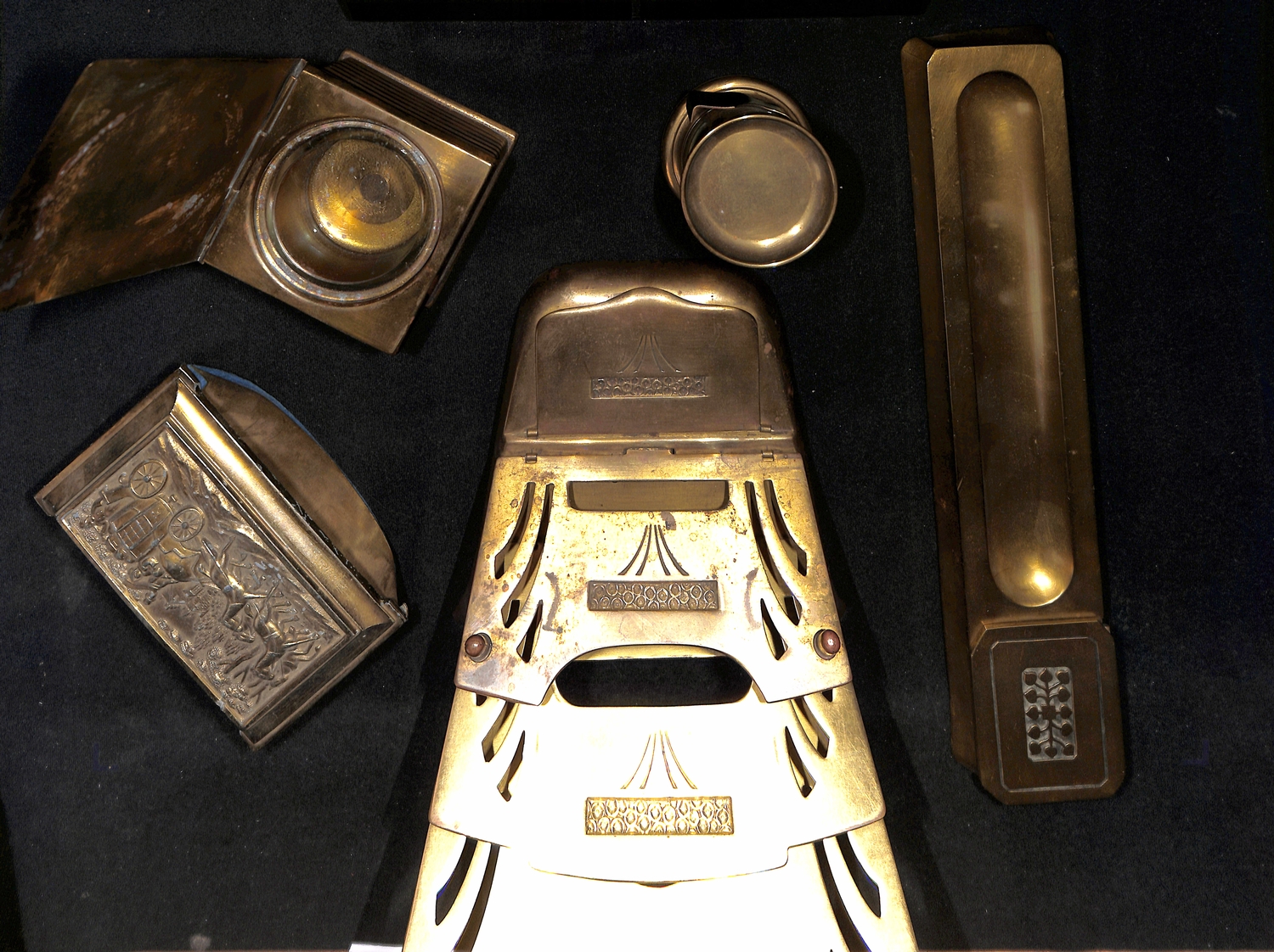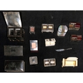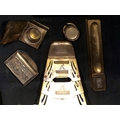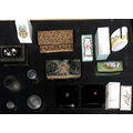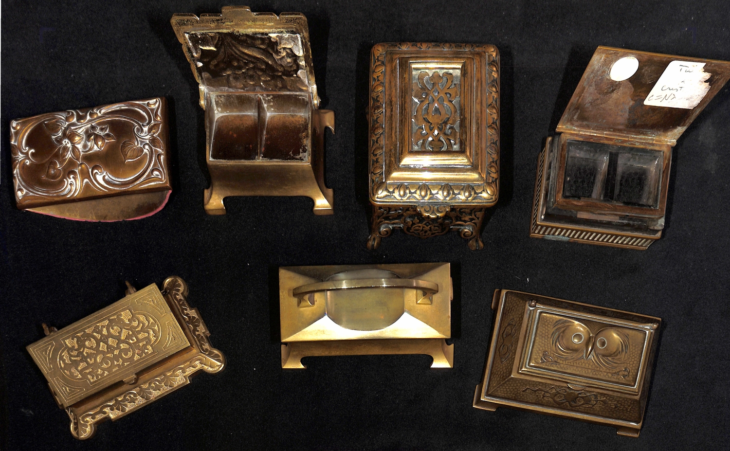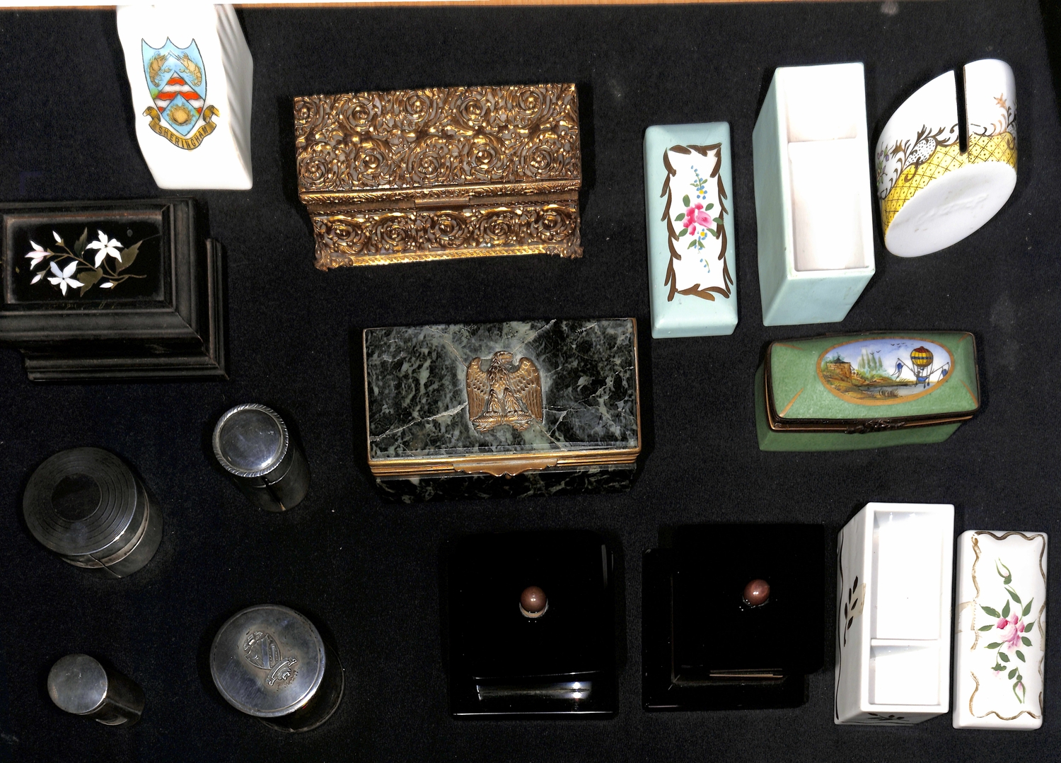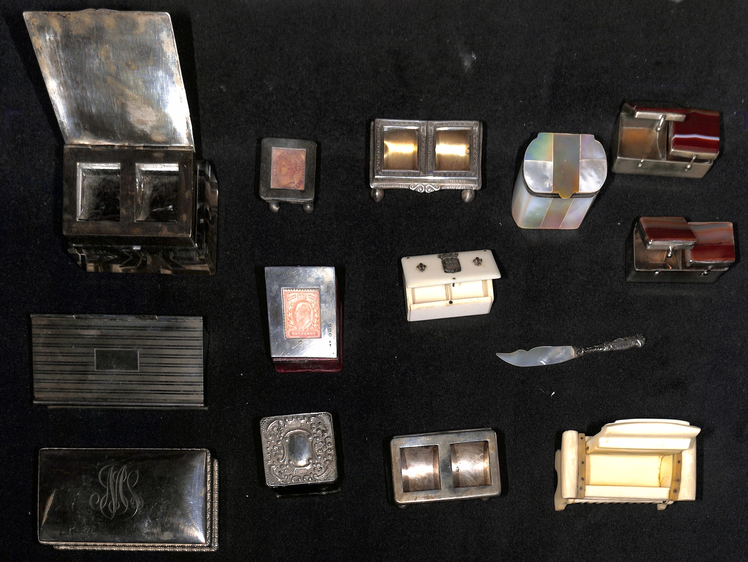 Stamp Boxes. Various stamp boxes (32), stamp coil dispensers (5), blotters (2) and a paper knife, including items made of silver (12, four hallmarked), brass, agate, marble, bone, ivory, glass, ceramics, mother of pearl, wood or leather, some American, an interesting collection. (40).