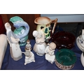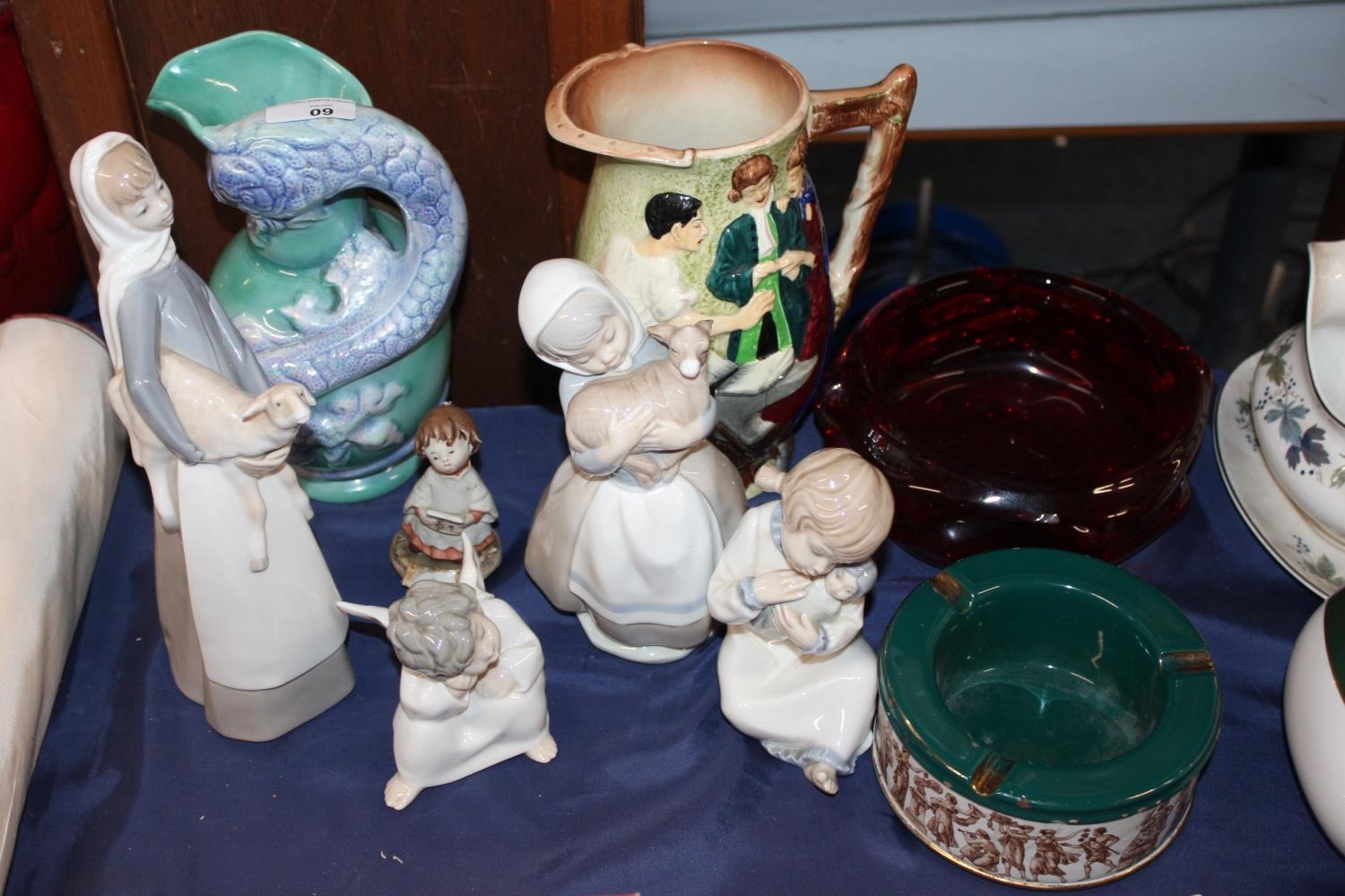 Burgess & Leigh Ltd Burleigh Ware 'The Runaway Marriage A Romantic Couple Being Married by Black Smith of Gretna Green' 22cm tall, Royal Art Pottery of England lustre dragon jug, Whitefriars style garnet red glass bowl, Lladro and Nao figures etc.