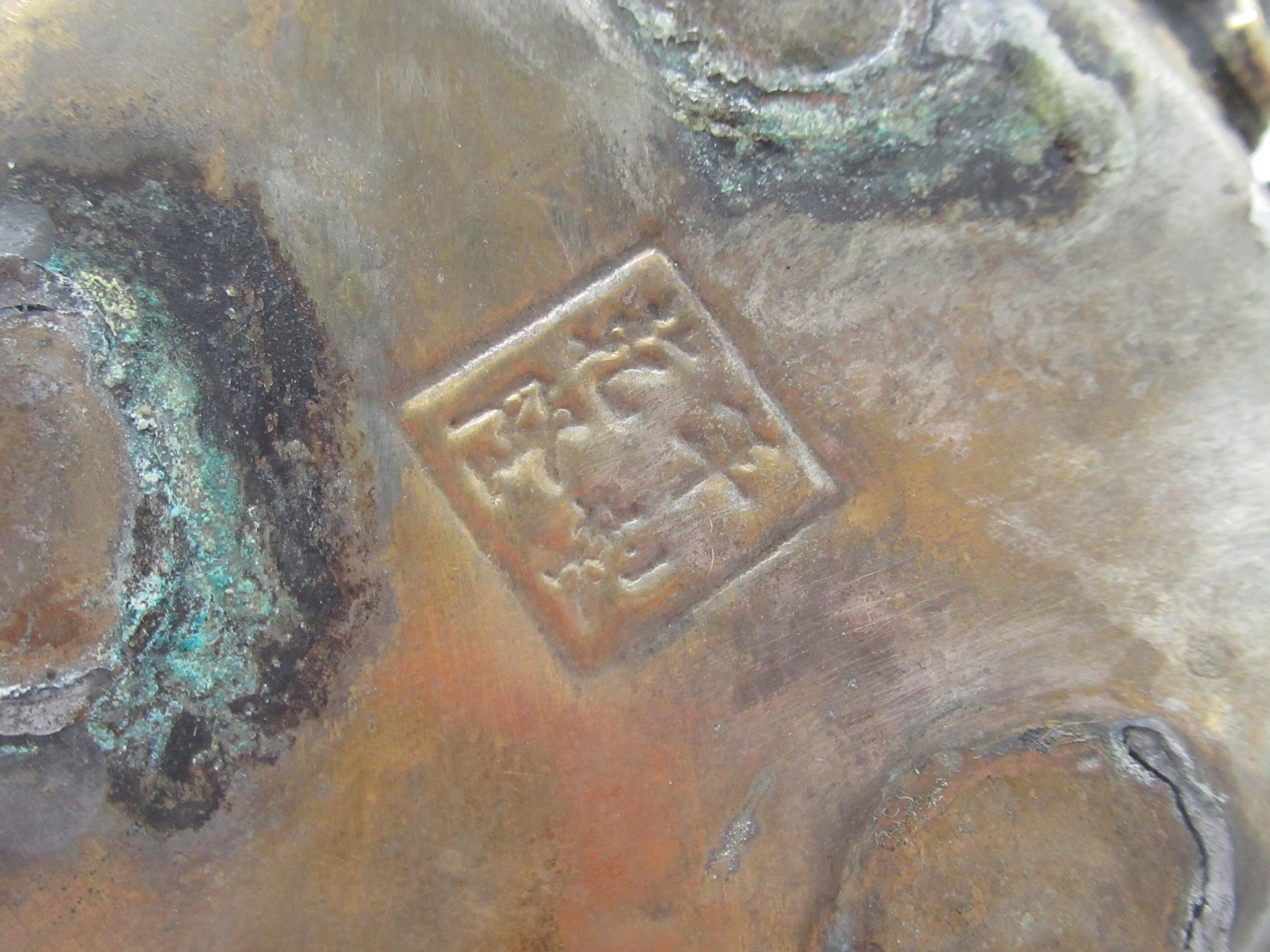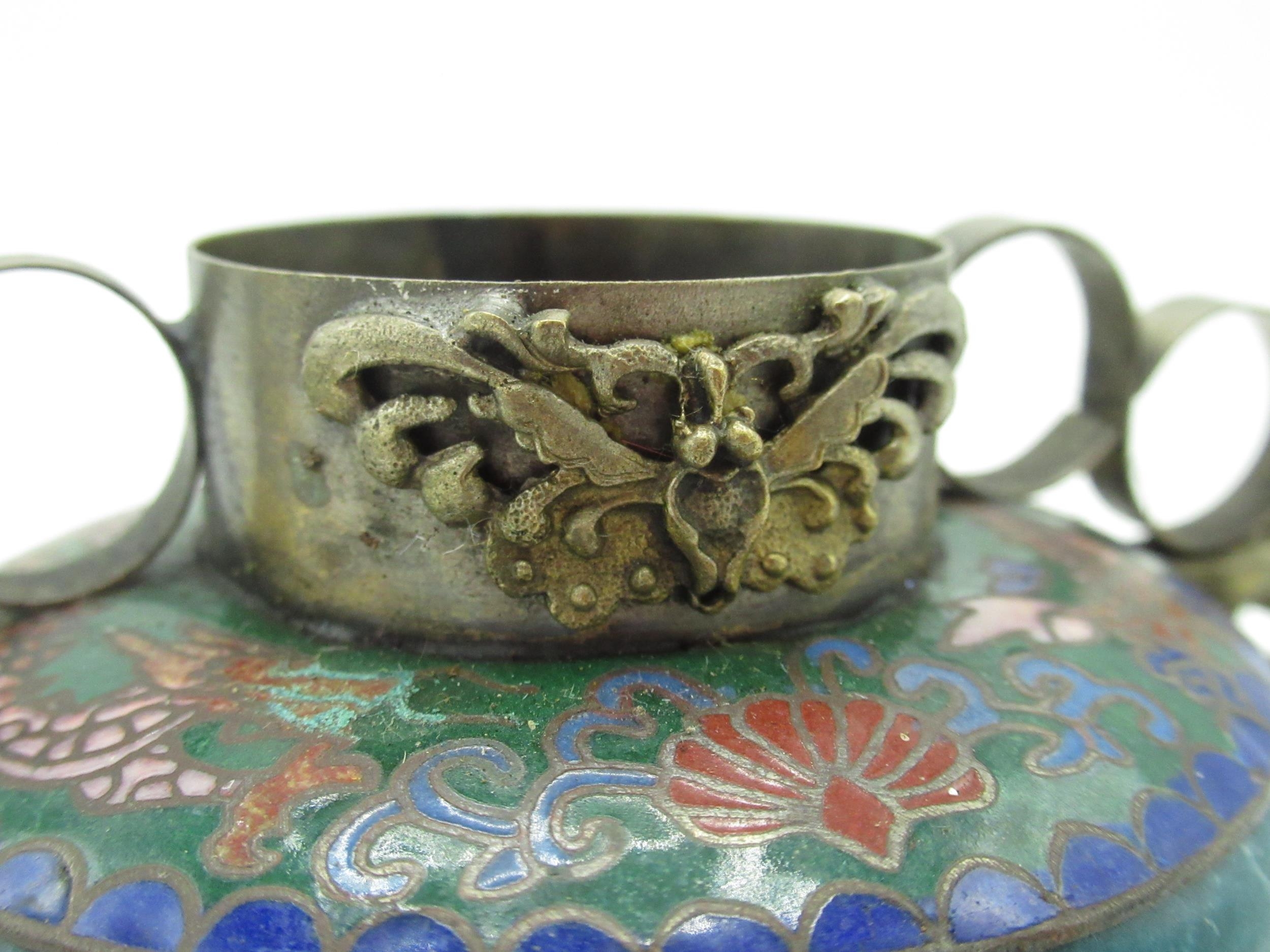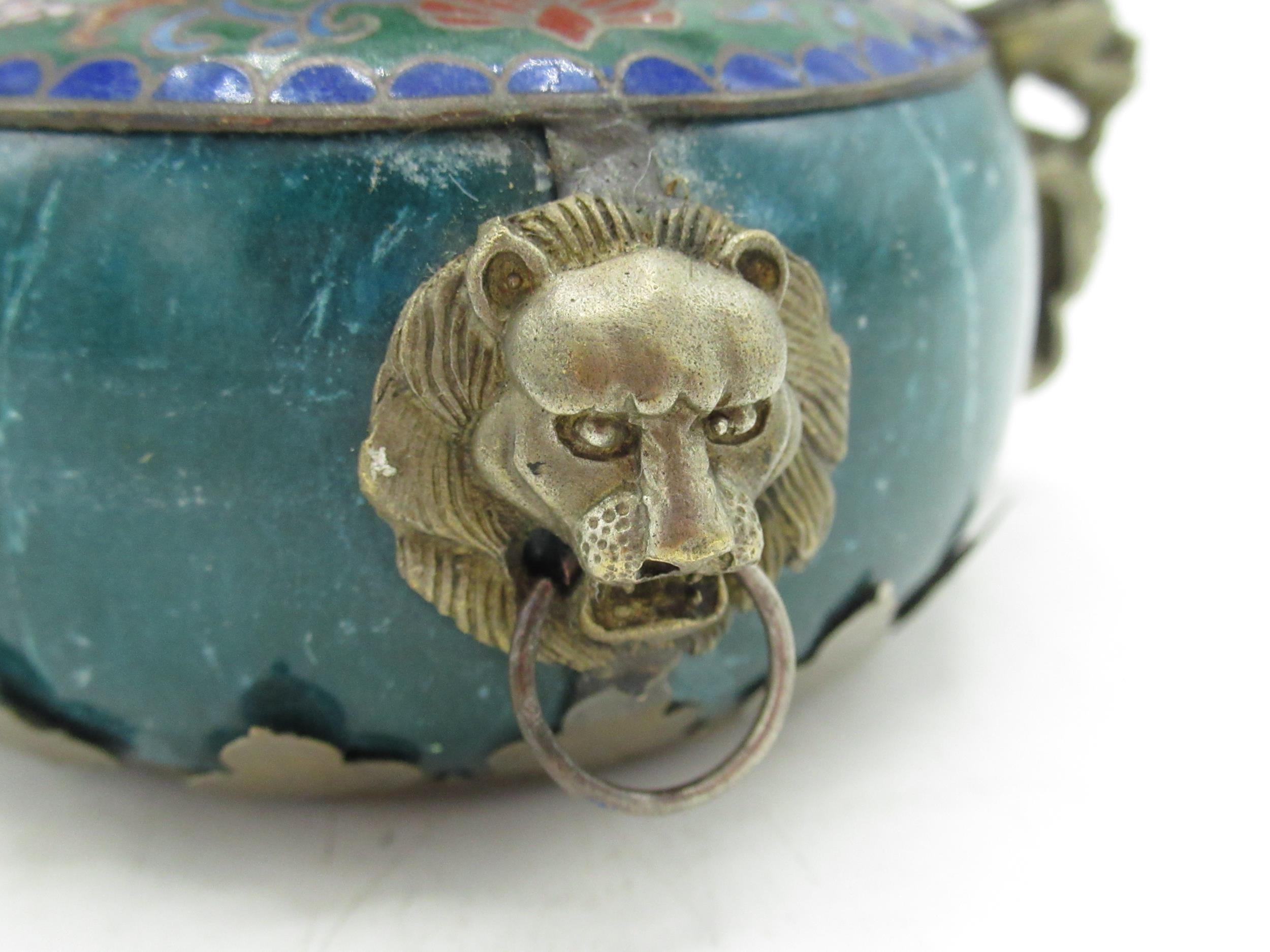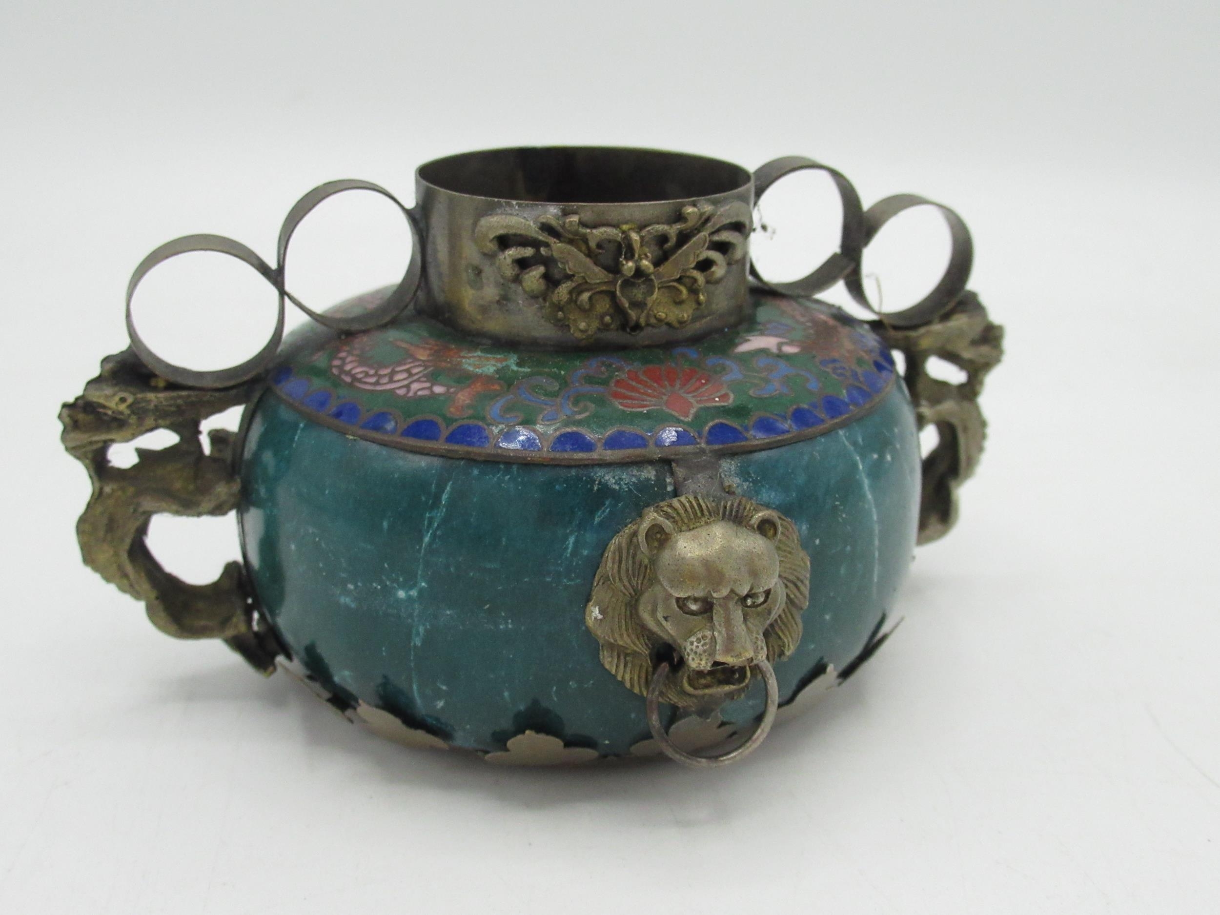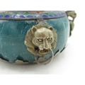 Small Chinese cloisonné bowl with brass lions head masks, dragon shaped handles, four digit signature to base H6cm