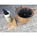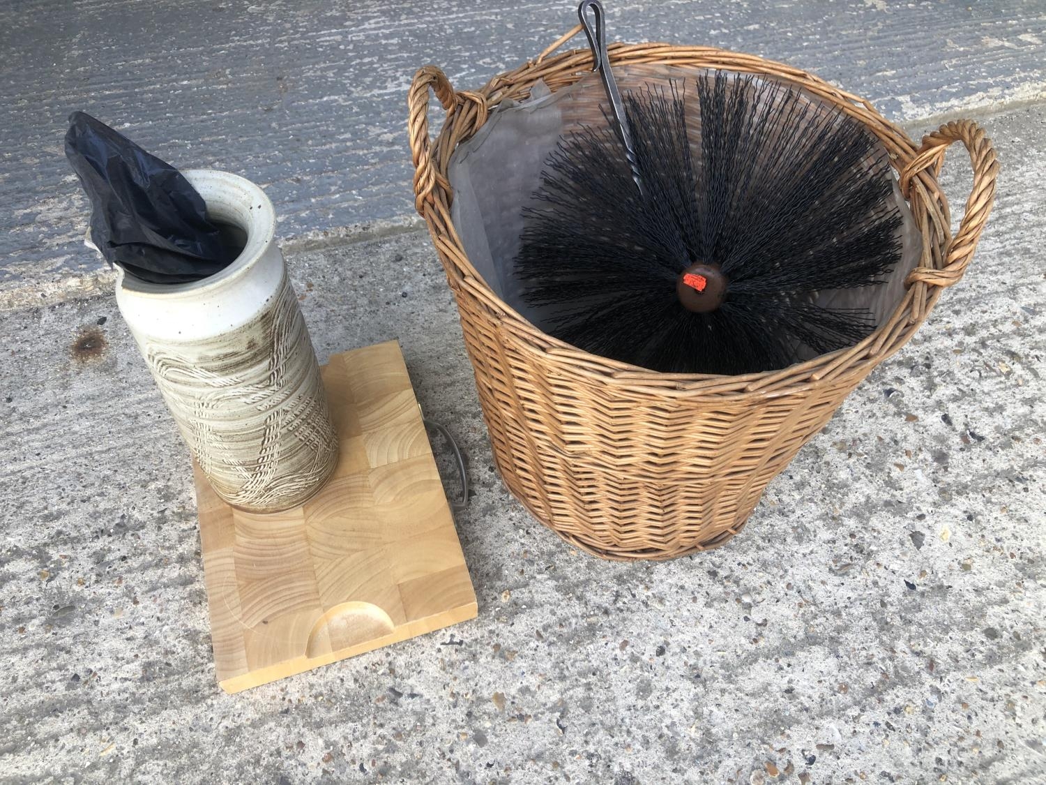 Wicker basket, chopping board and vase