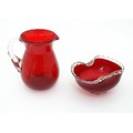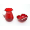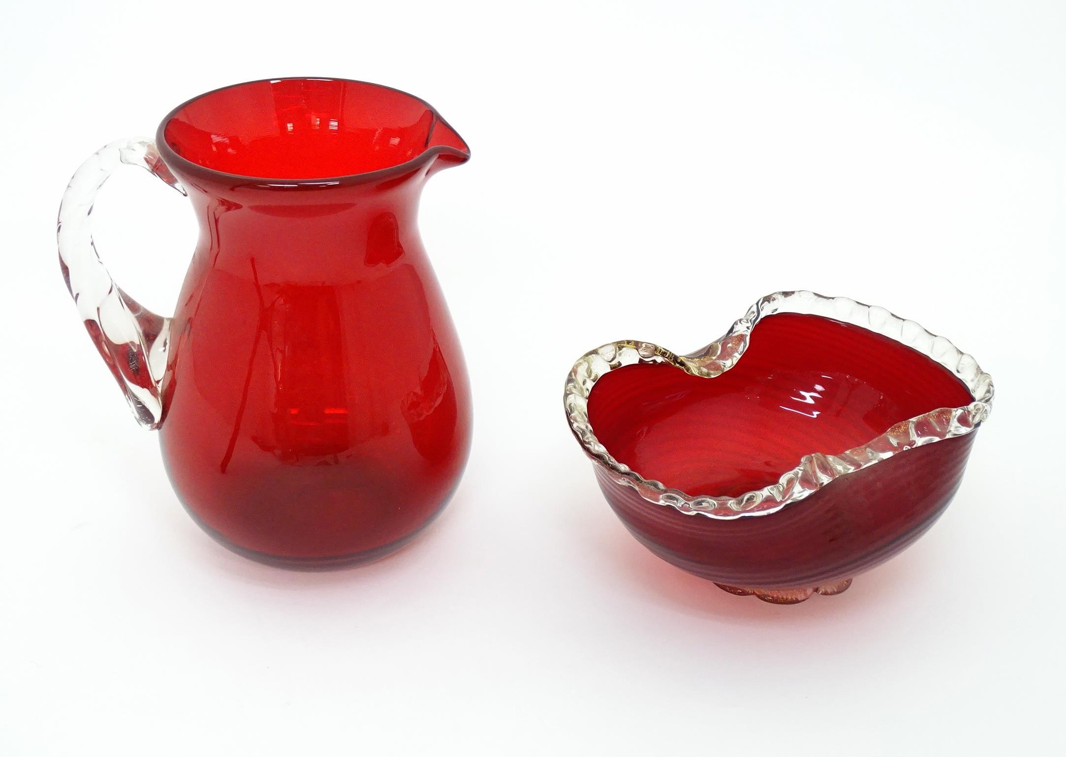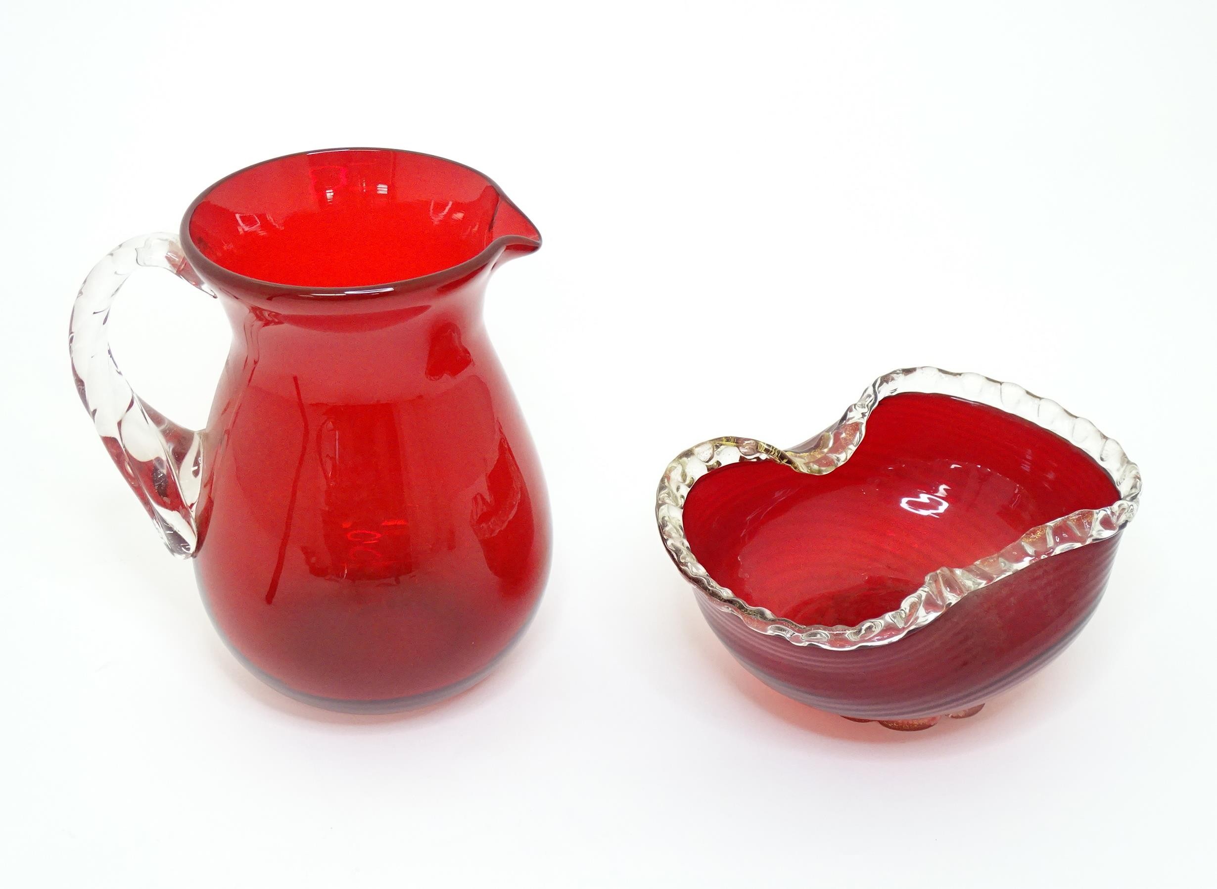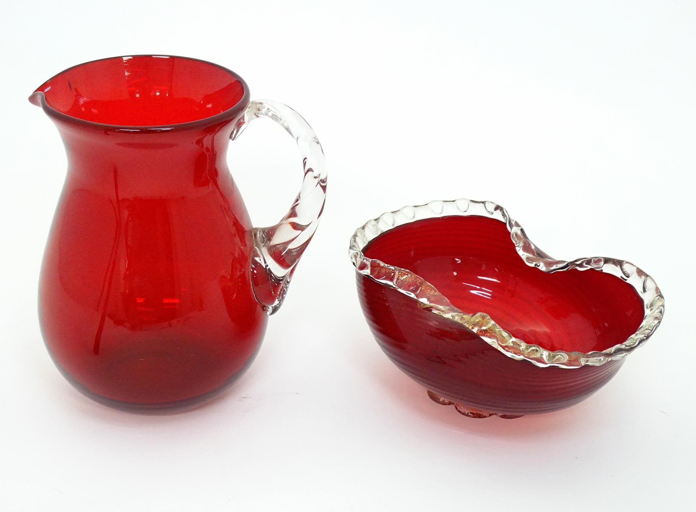 Two items of glassware comprising a red glass water jug with clear glass handle, and a red glass bowl with clear foot and rim with gold fleck detail, in the Murano style. Jug approx. 8 1/4" high (2)