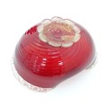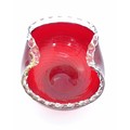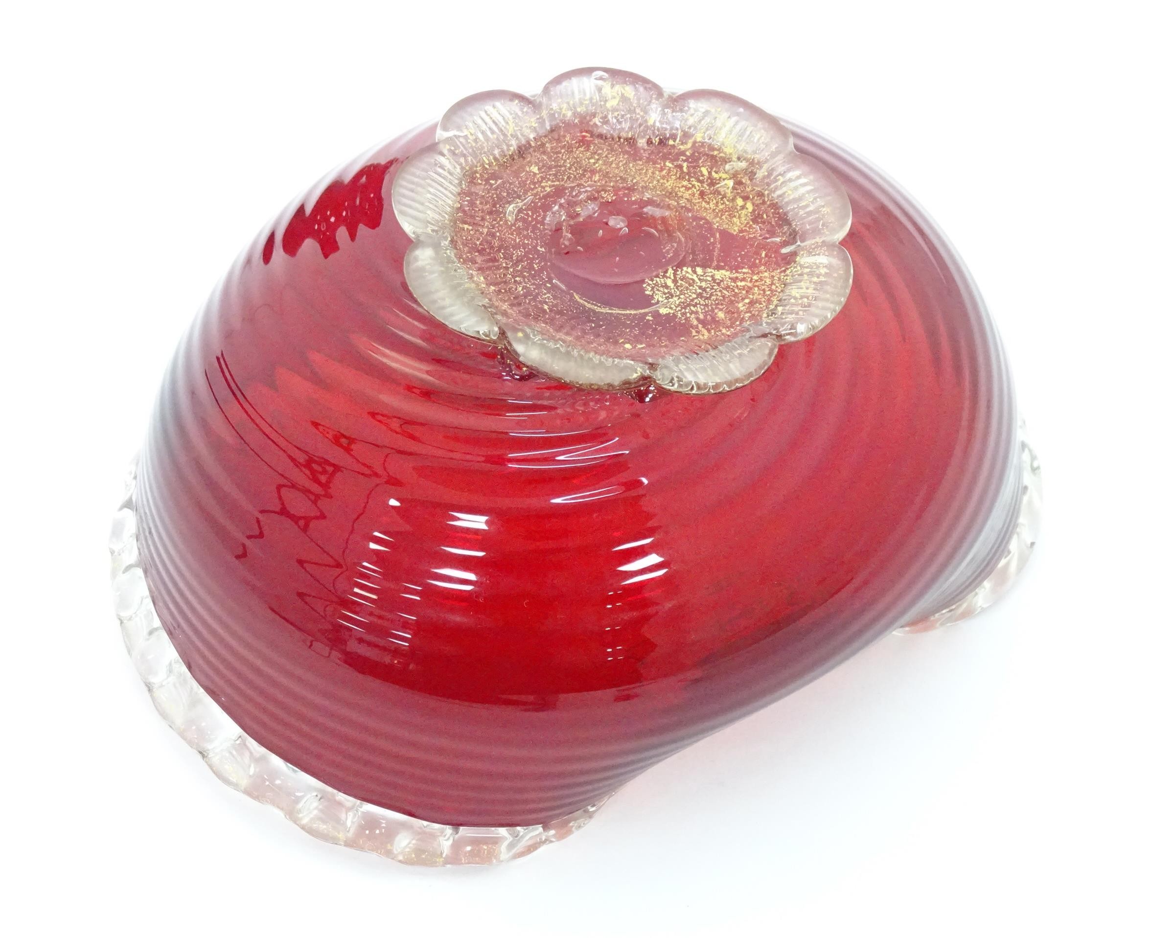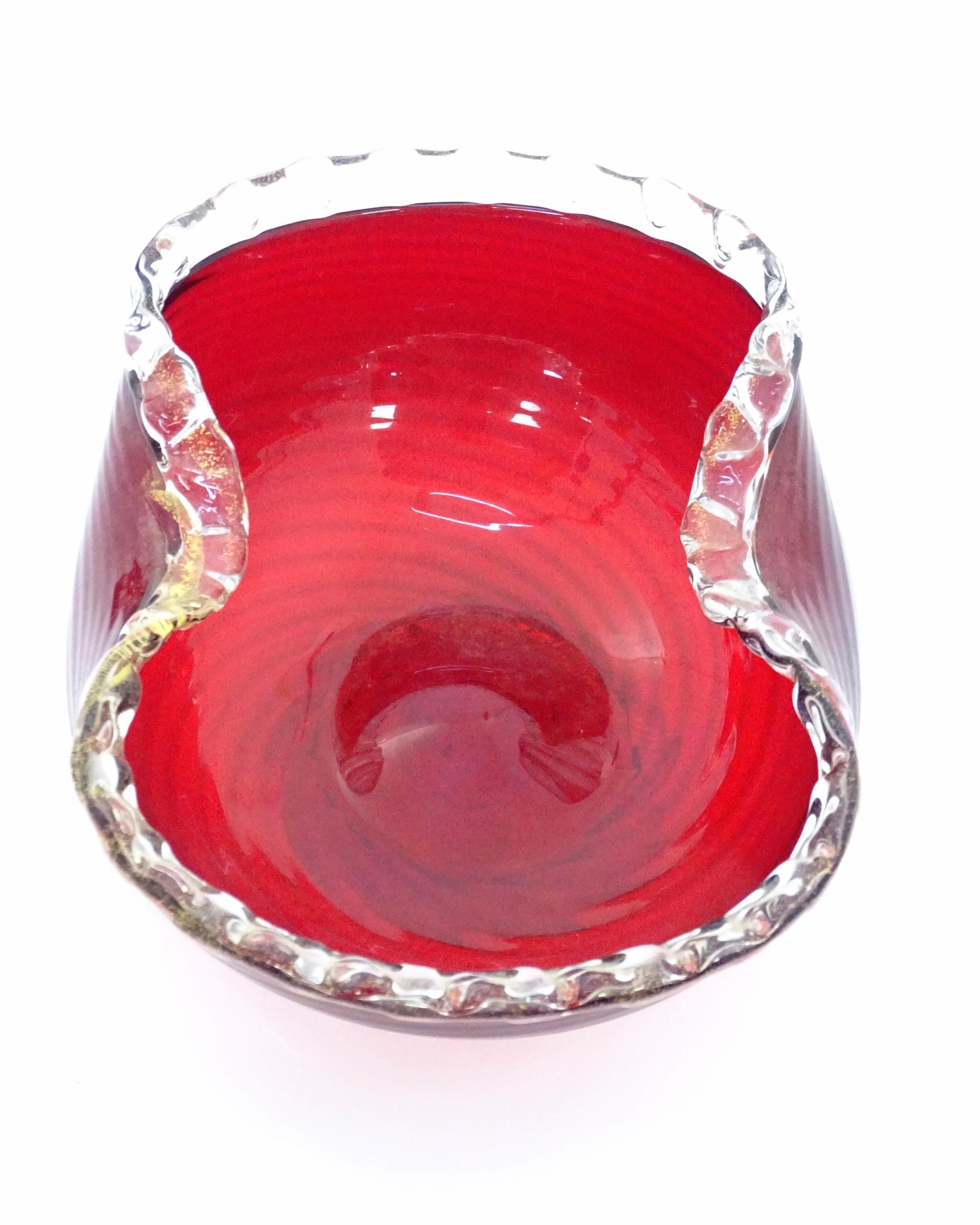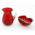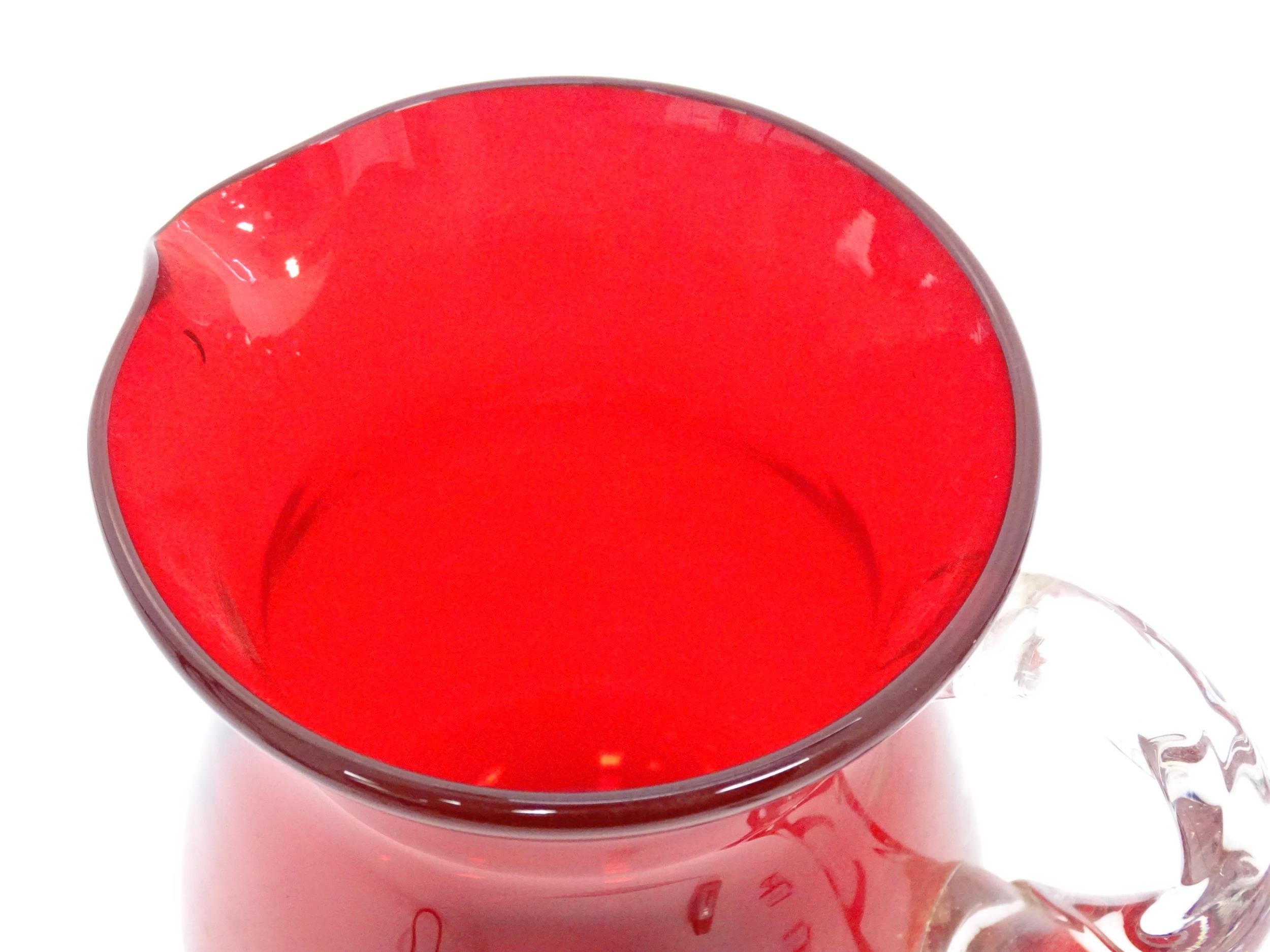 Two items of glassware comprising a red glass water jug with clear glass handle, and a red glass bowl with clear foot and rim with gold fleck detail, in the Murano style. Jug approx. 8 1/4" high (2)