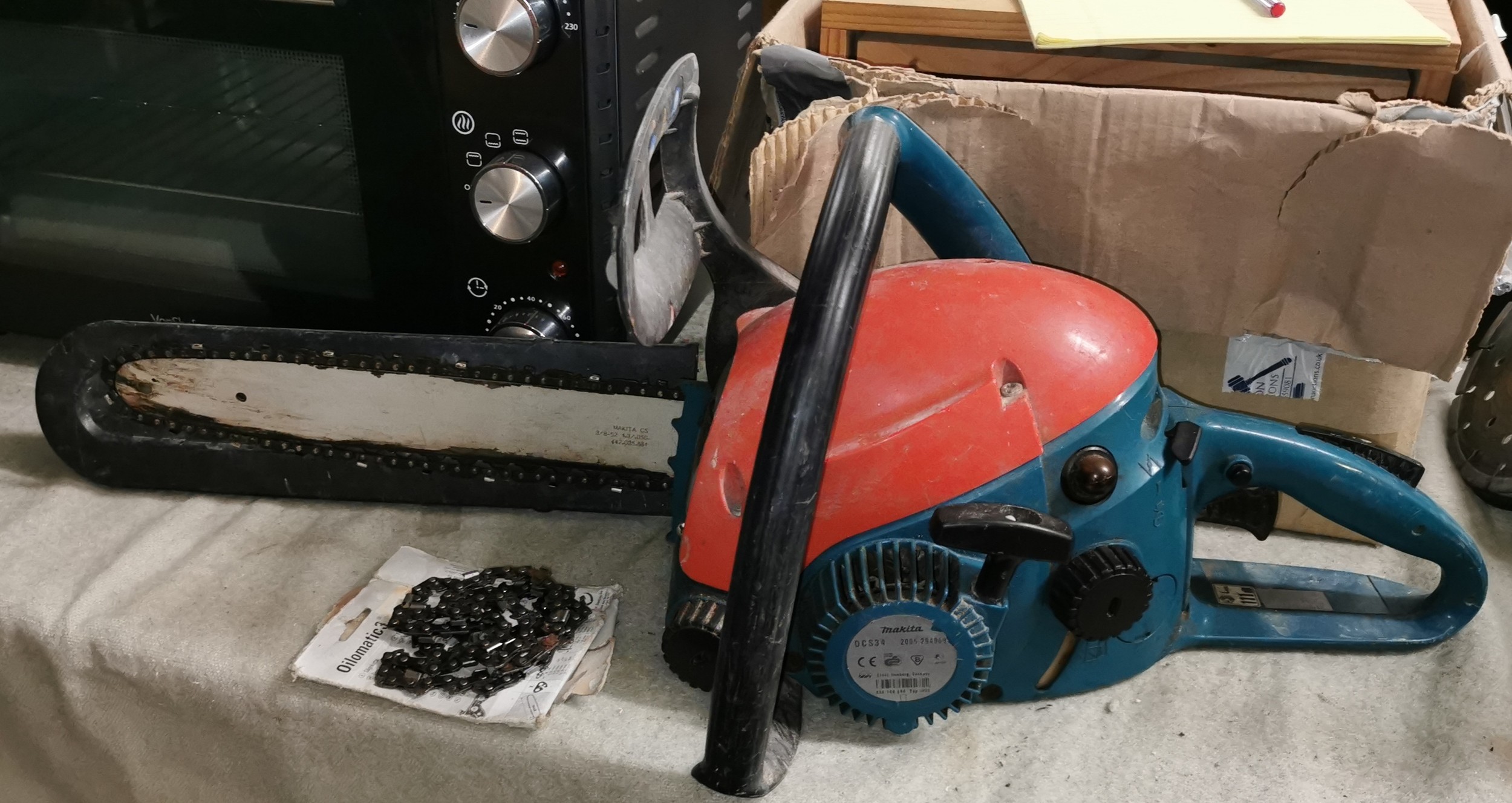 Makita DCS34 petrol chainsaw with spare blade in good working order