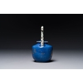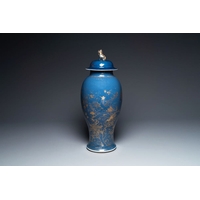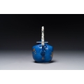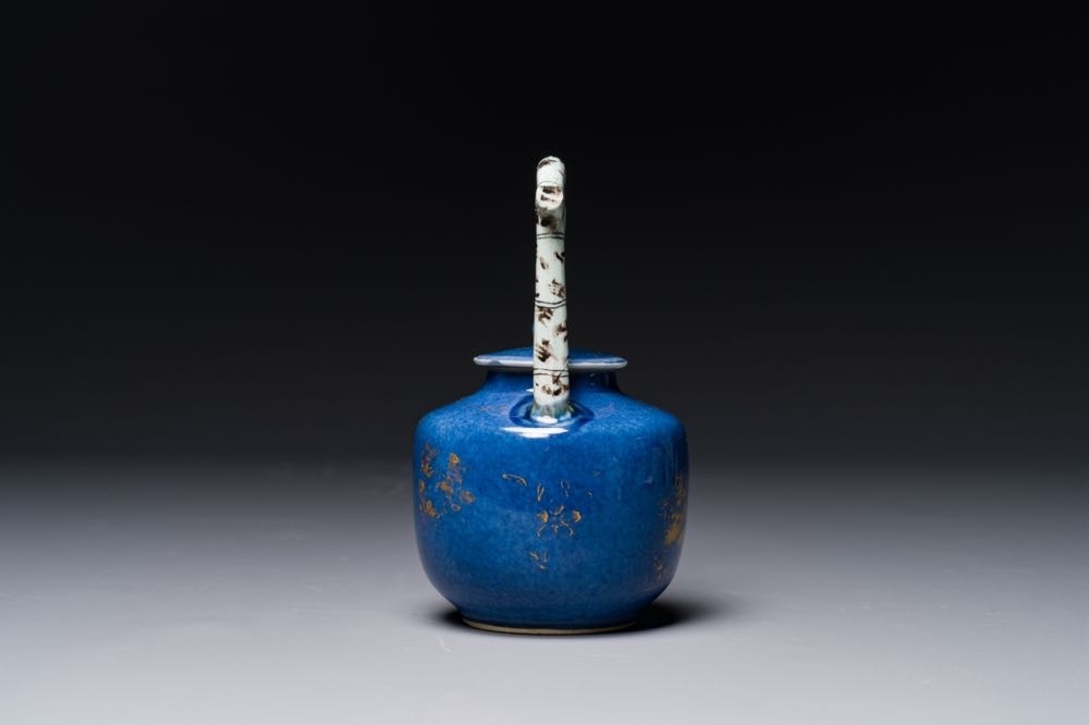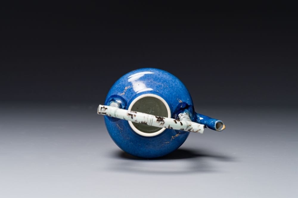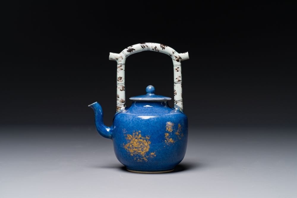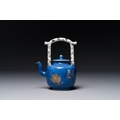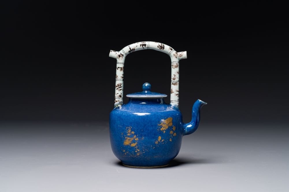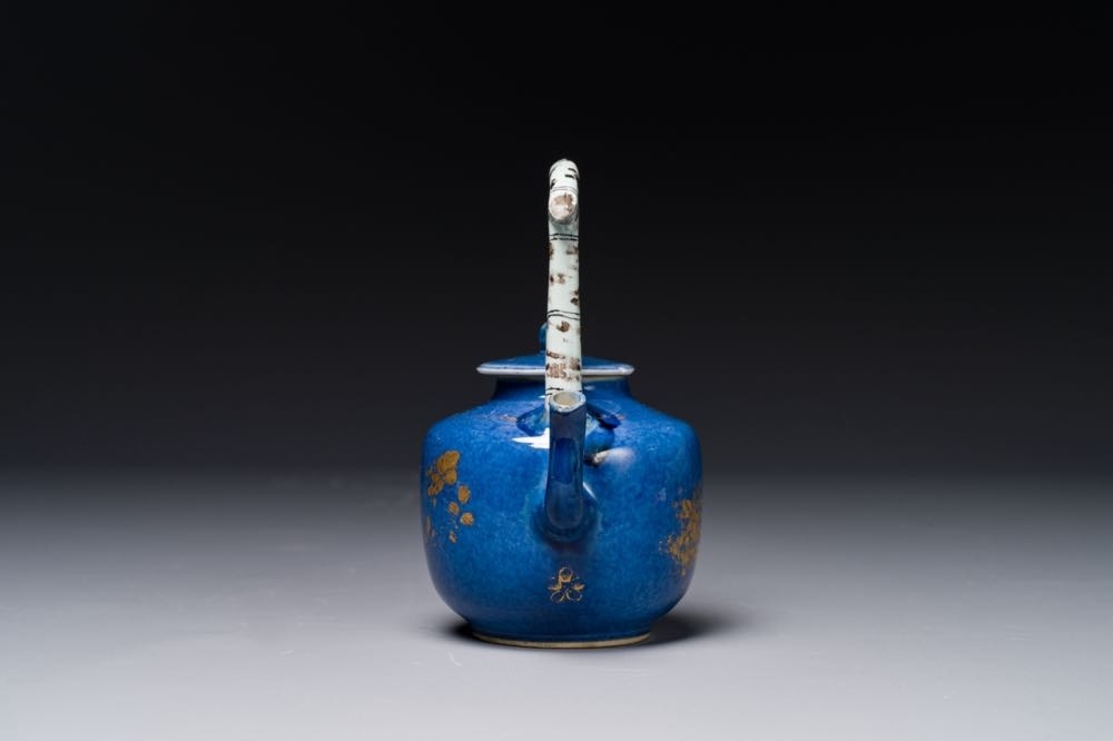A Chinese gilt-decorated powder-blue teapot and cover with a faux-bamboo handle, Kangxi