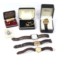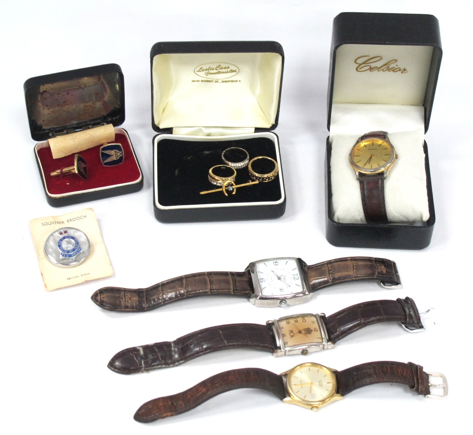 Watches and Collectables, including four gents’ watches (Citizen, Sekonda etc), with gold-plated rings, brooches and boxed cufflinks, etc:- One Tray.