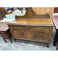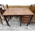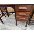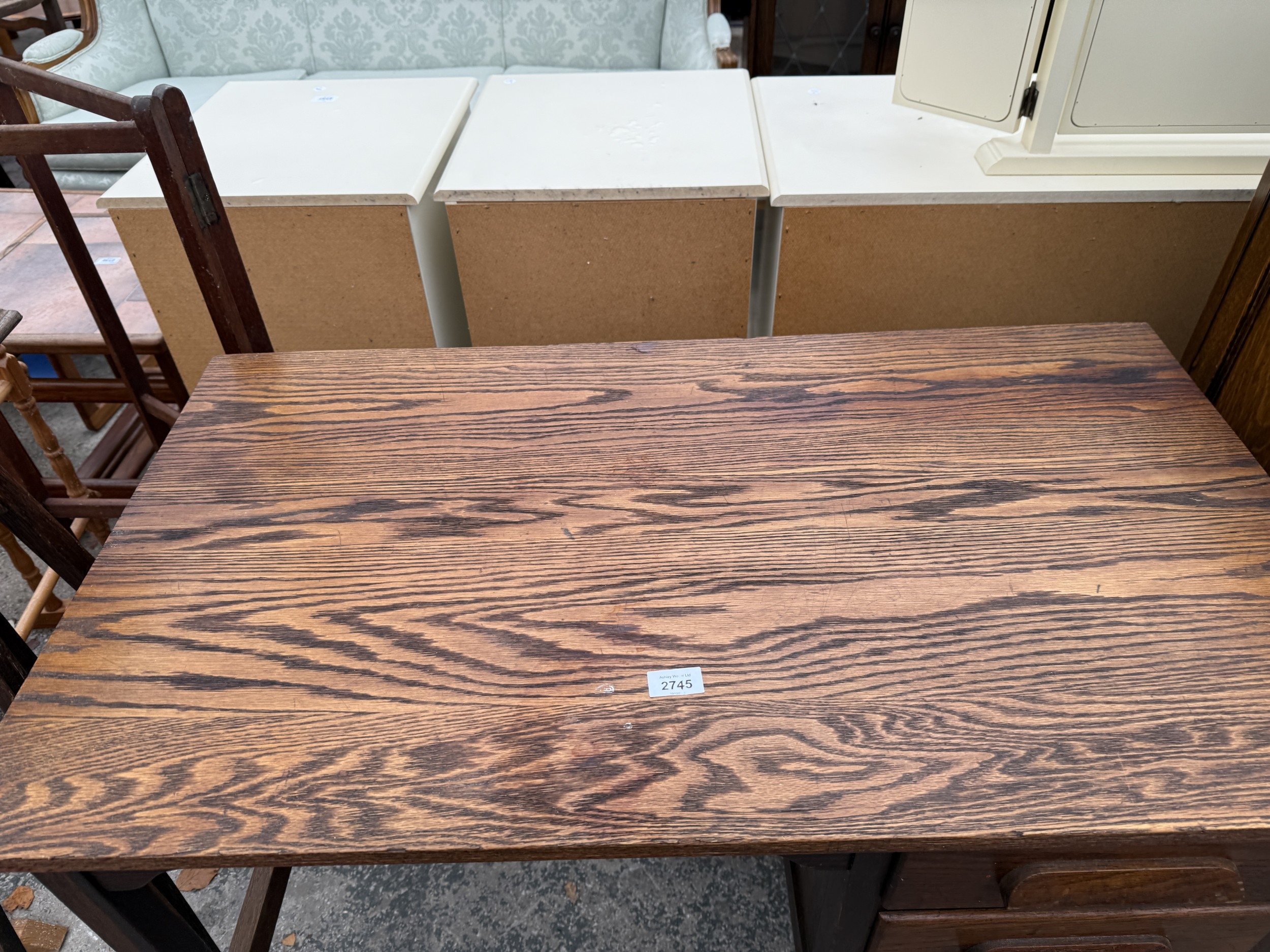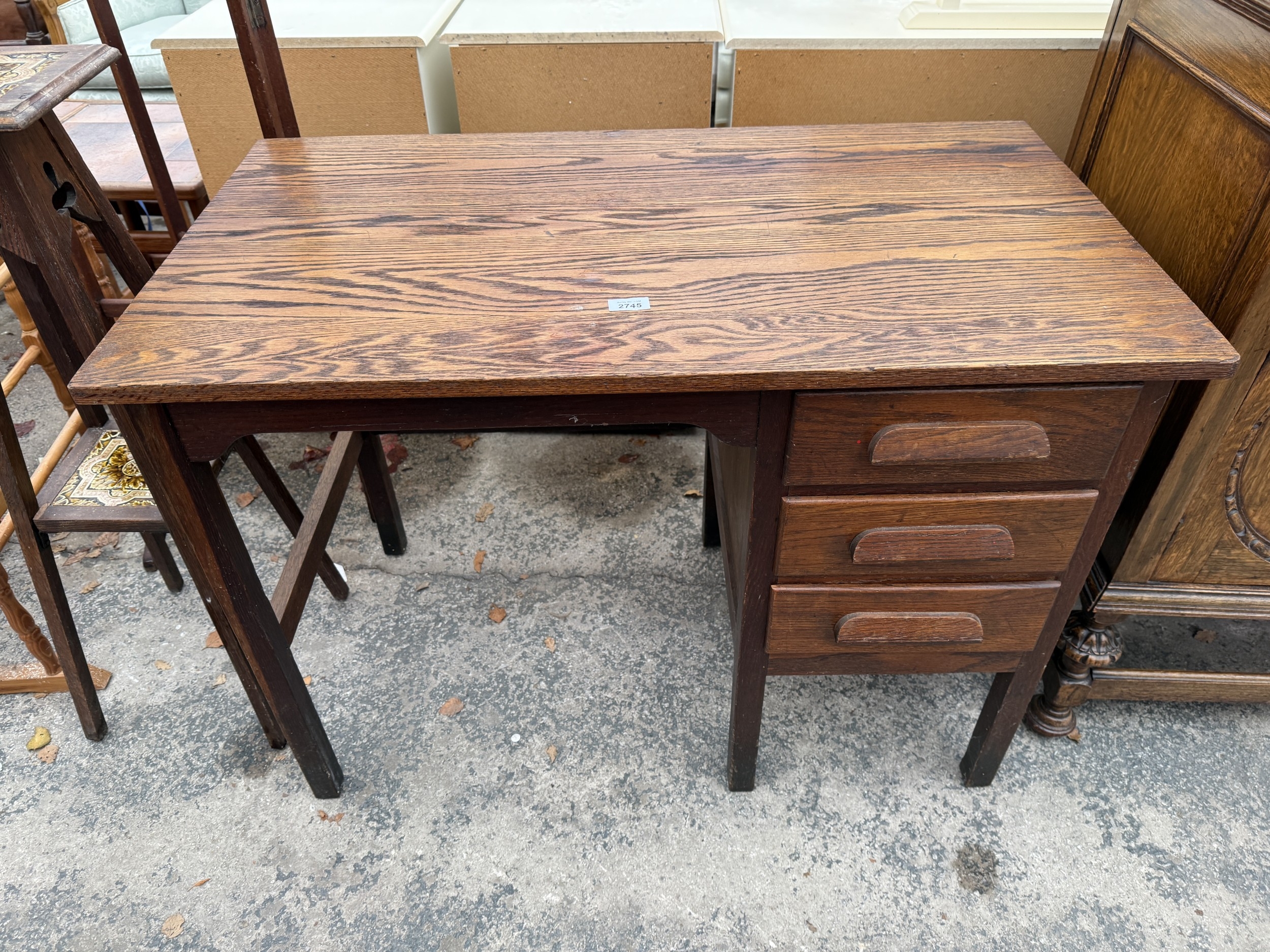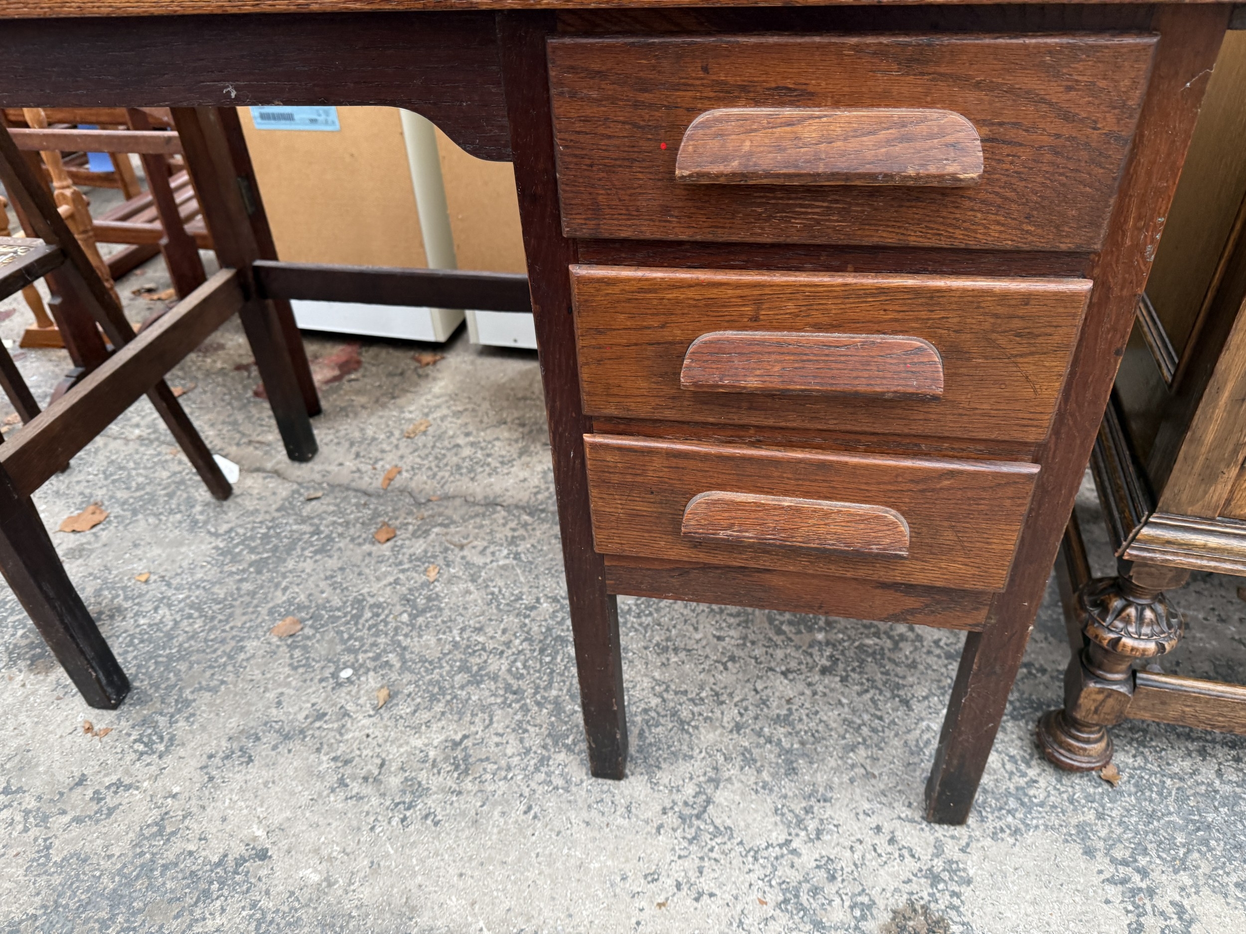 A MID 20TH CENTURY OAK SINGLE PEDESTAL DESK ENCLOSING THREE DRAWERS, 39" X 21.5"