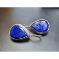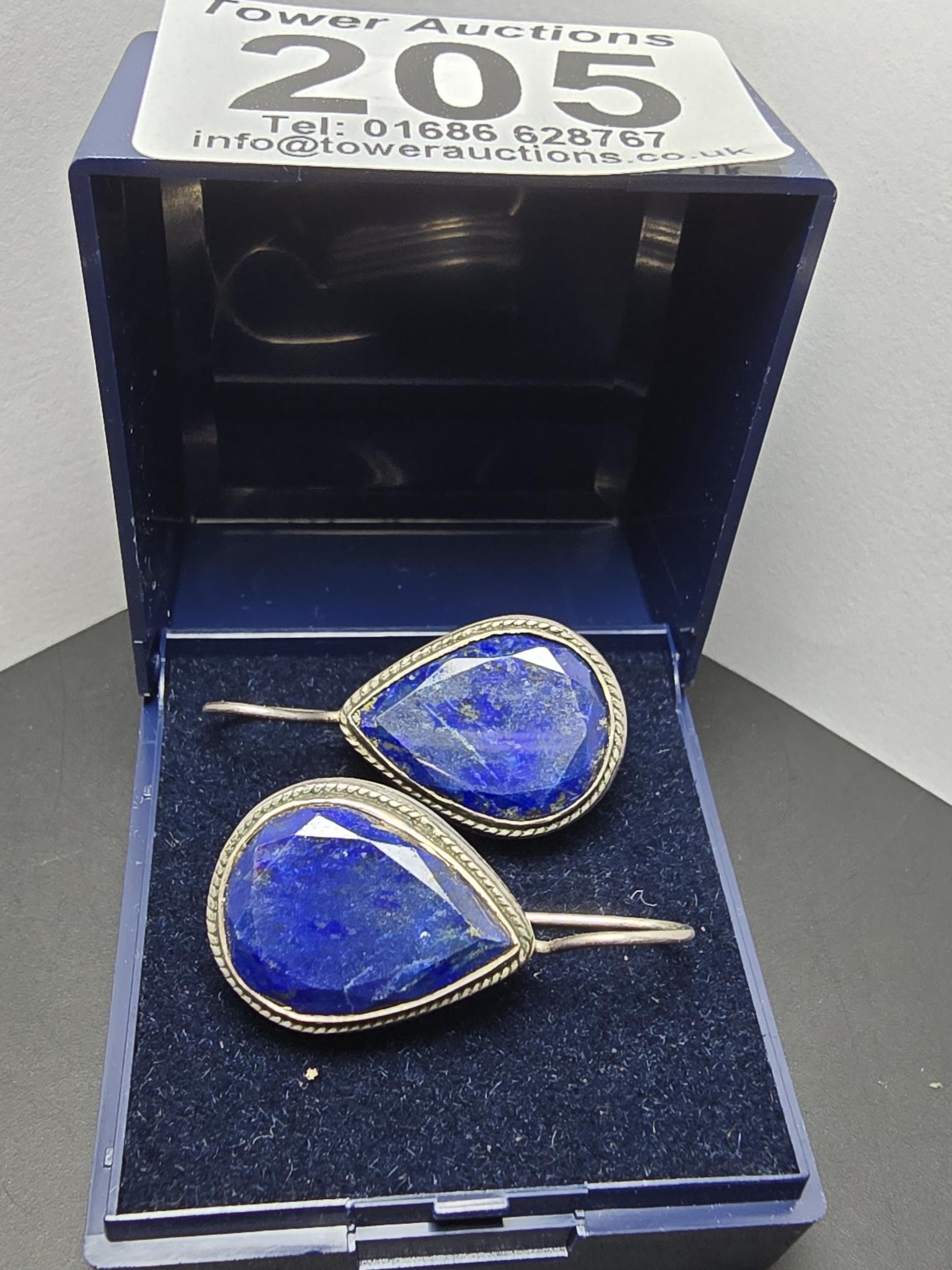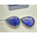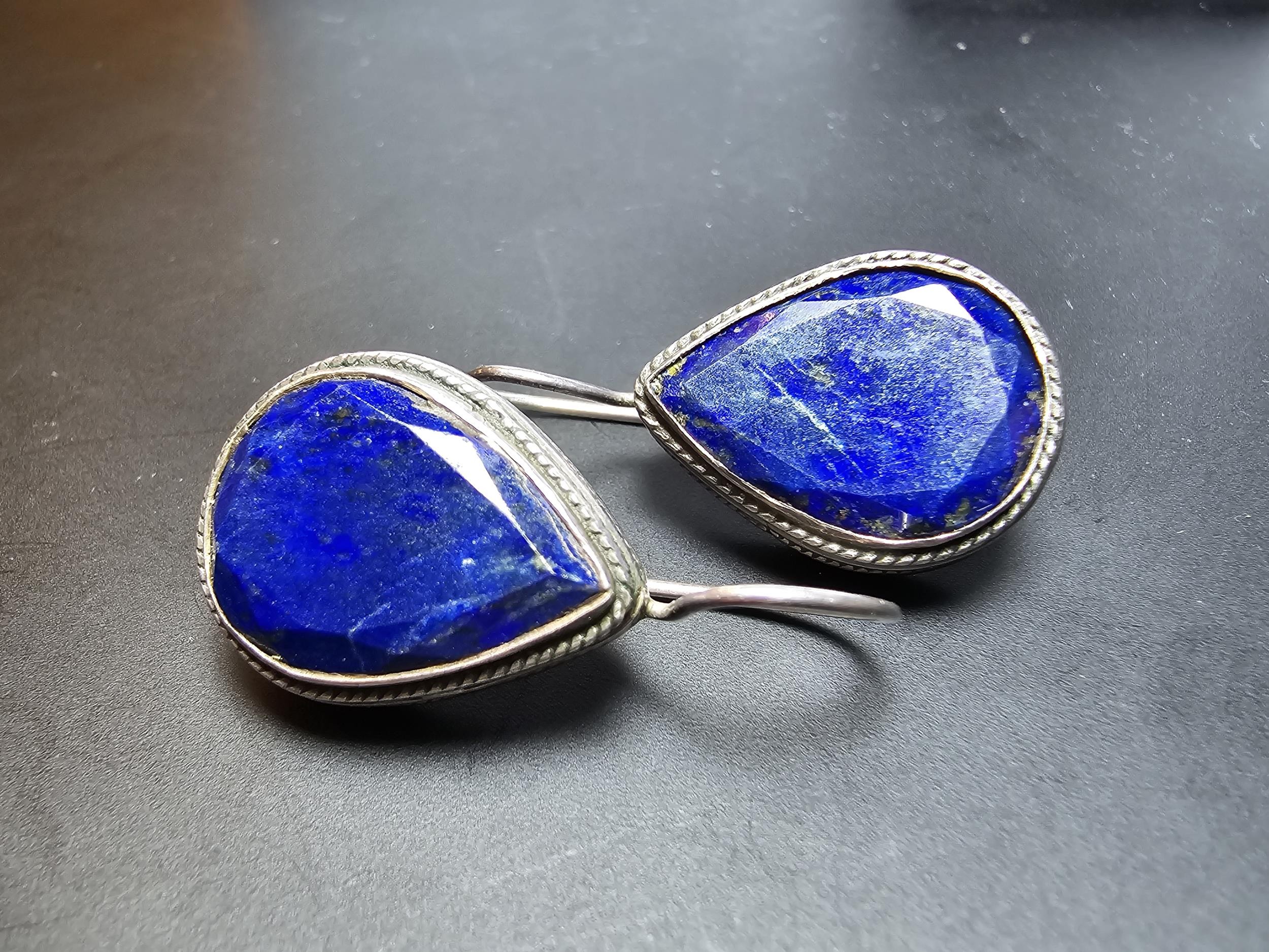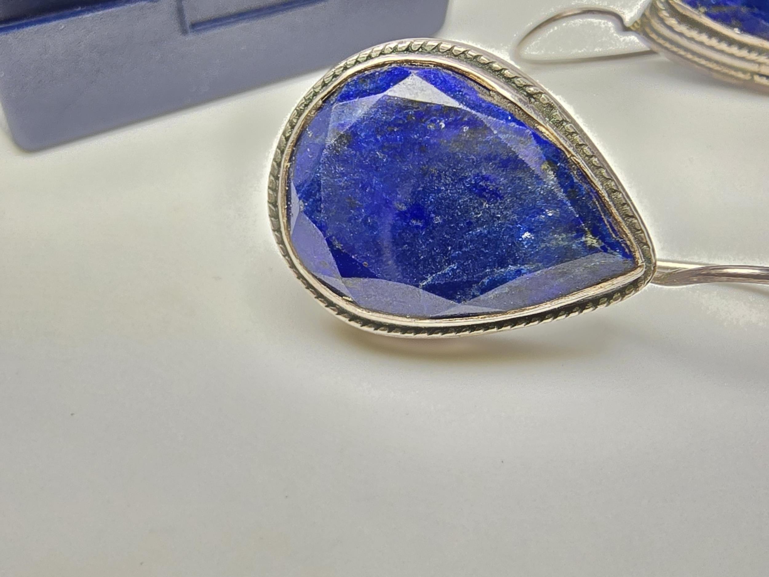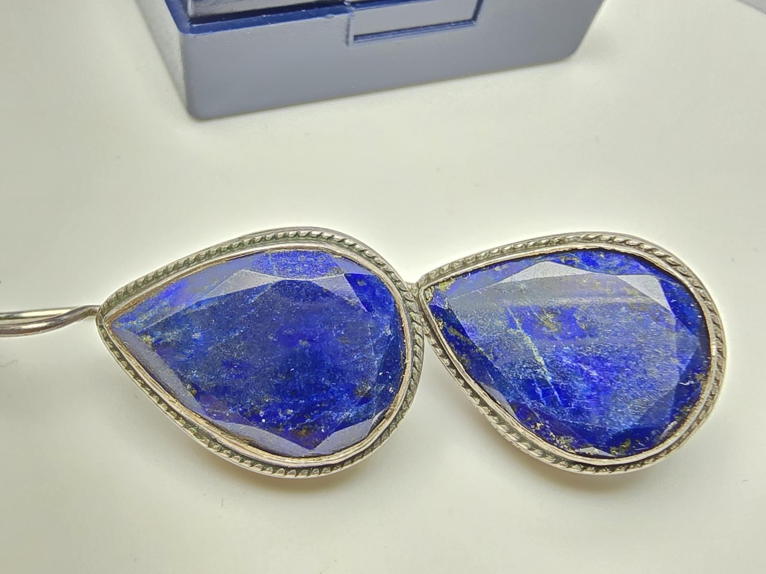 A good large vintage par of sterling silver earrings inset with teardrop shaped faceted lapis lazuli stones presenting a vibrant blue colour with golden specks, in excellent clean condition and boxed. Height of the earrings is 20mm, width of 15mm.