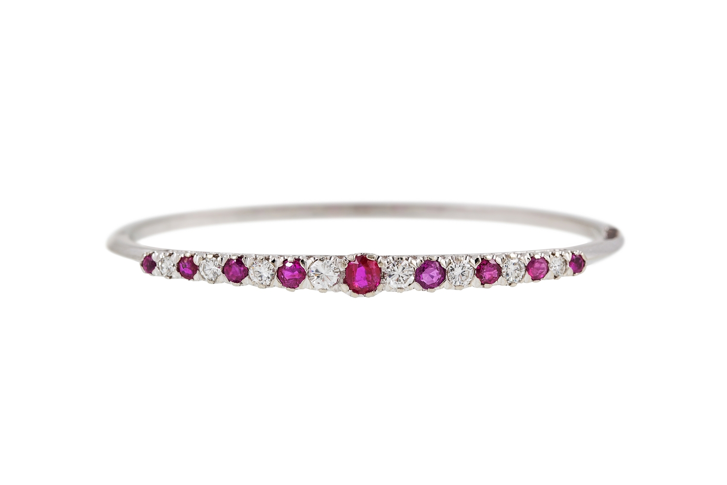 A RUBY AND DIAMOND BANGLE, set with brilliant cut diamonds and circular rubies, mounted in 18ct white gold. Estimated: weight of rubies: 1.10 ct, diamonds; 0.95 ct, colour and clarity; G, VVS