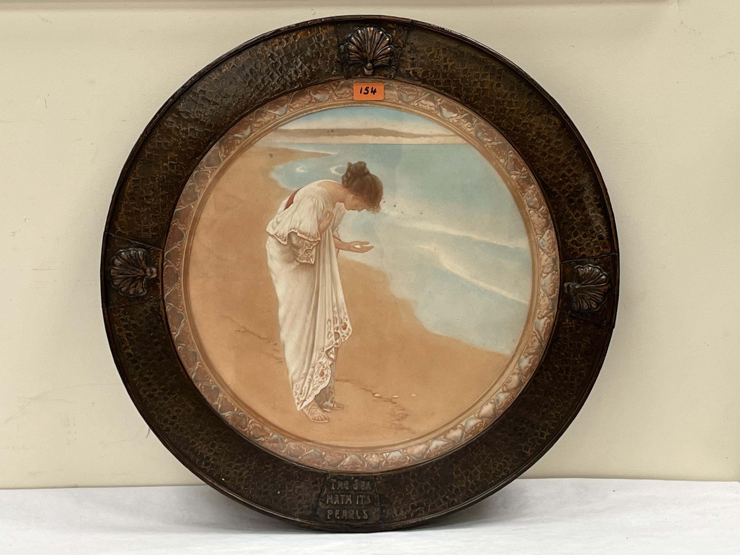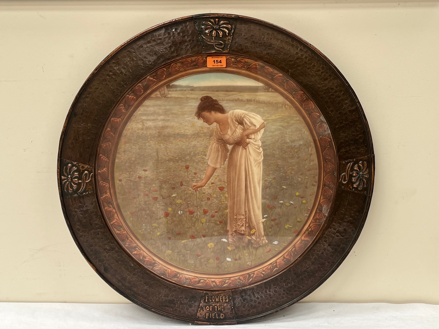 A pair of early 20th century prints 'Flowers of the Field', 'The Sea hath its Pearls', the Arts and Crafts shell moulded planished copper frames embossed with titles. The frames 26' diam.