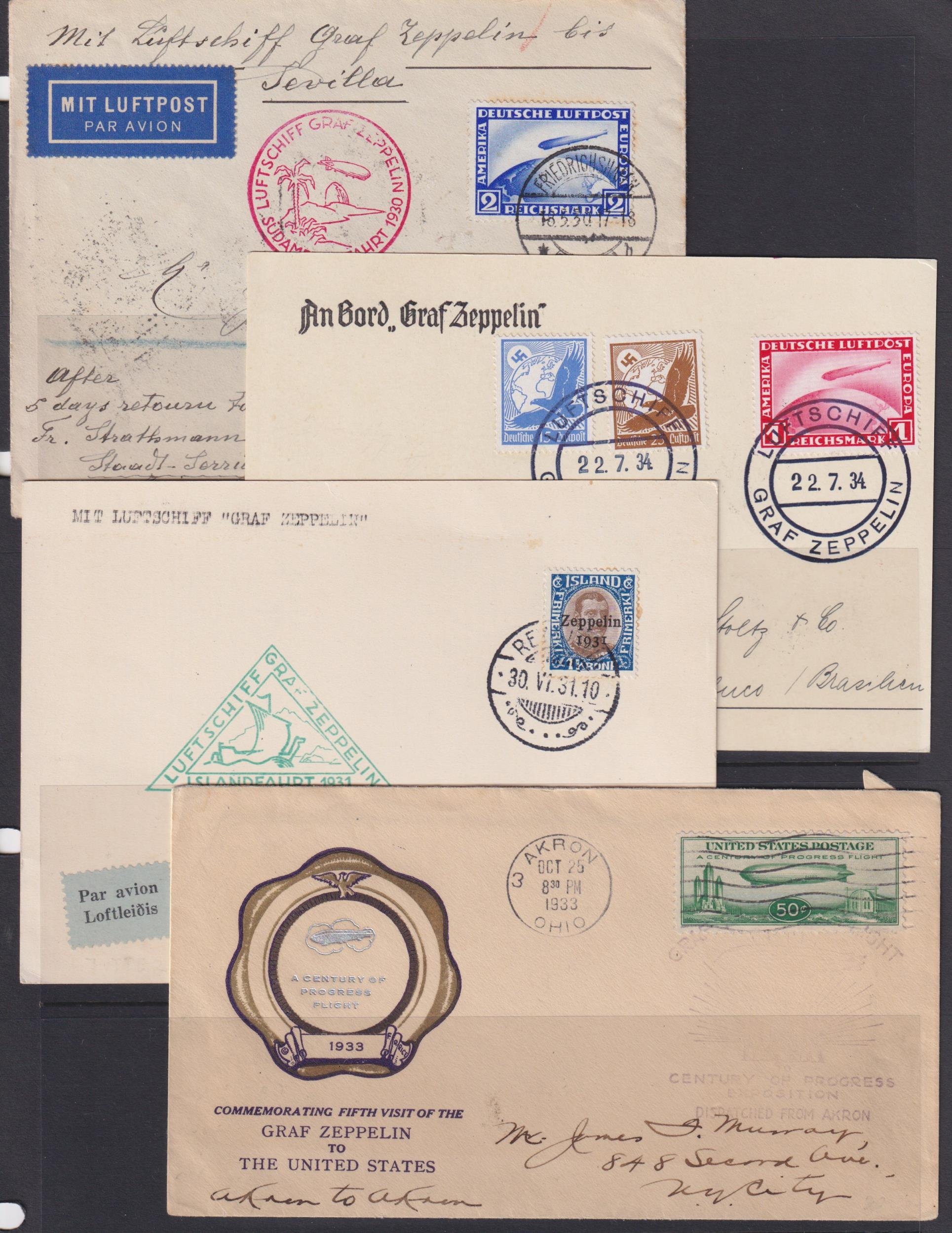 1924/34 Zeppelin collection comprising 38 covers or cards written up on pages, all different, mostly transatlantic, including 1928 USA to Germany (5), Germany to USA (2), 1929 Round the World and 1930 South America flight, 1931 Iceland, 1933 USA 50c Zeppelin Century of Progress Exhibition, various 1934 flights and a group from Brazil.