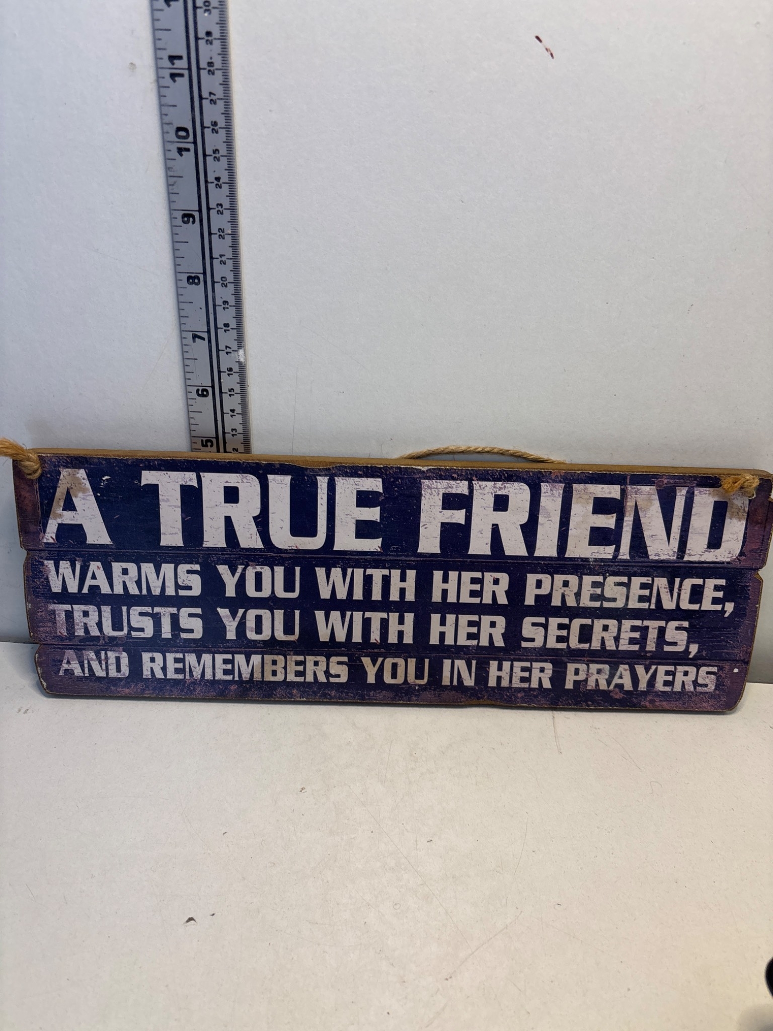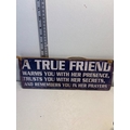 Wooden sign with purple background and white text saying 'A True Friend warms you with her presence, trusts you with her secrets, and remembers you in her prayers'. Includes a string for hanging.