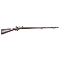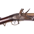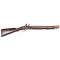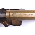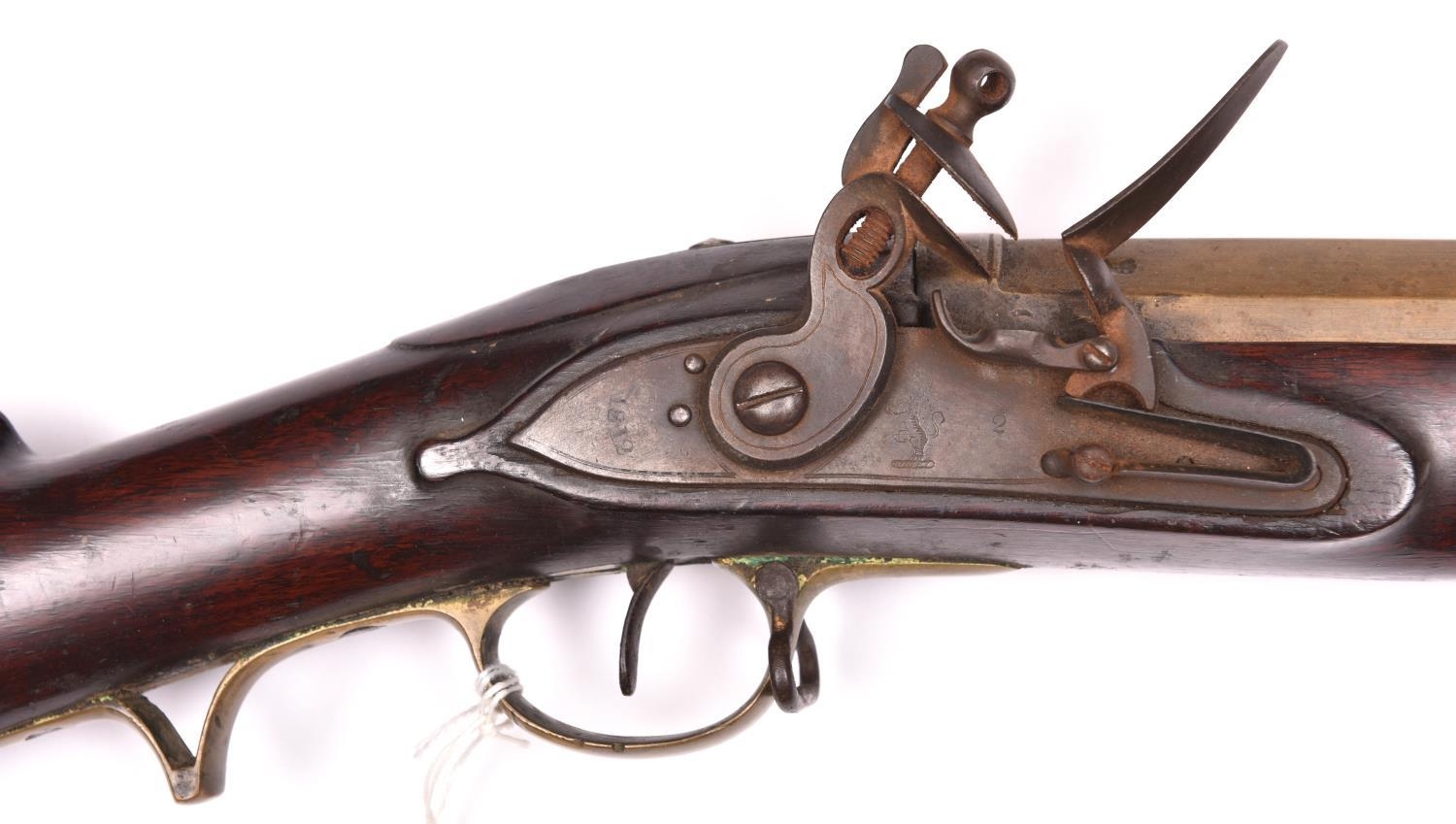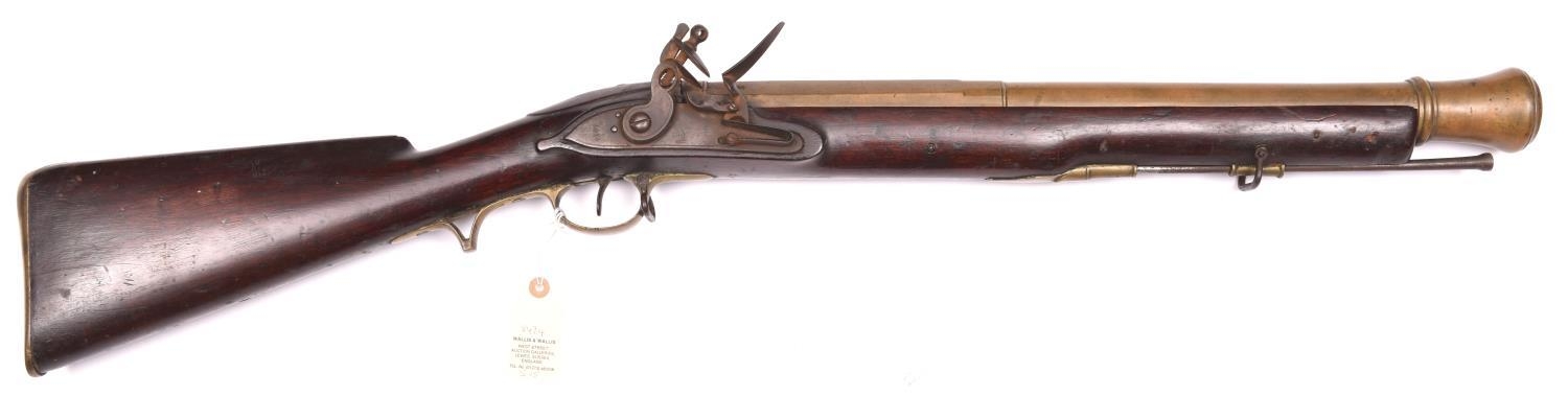 A rare East India Company brass-barrelled flintlock large pattern musketoon, 39" overall, part octagonal barrel 22½” with bell mouth muzzle having a bore of 1½”, the breech engraved with E.I.C. heart mark and “WILSON 1770”, and bearing Tower private proofs, maker’s poincon “RW”, and an Indian inscription on the left flat; the flat Light Infantry small pattern lock having typical “pot-bellied” ring-neck cock and bearing lion rampant mark, date 1812, and crown over “2” inspector’s mark; the walnut stock having cheek-rest on the butt, no hole for swivel mount, late type brass mounts including Baker’s pattern trigger guard with spurred grip, butt-plate tang stamped “98/L.I./37”, iron ramrod, and sling swivels. Good working order and condition, an untouched piece. (the lock very slightly worn). The barrel is from the “large” musketoon as listed in contemporary E.I.C. inventories, as opposed to the “small” musketoon, and the original old-style stock would have had the high hand-rail, probably provision for a swivel, and Sea Service pattern brass mounts. It was brought up-to-date in 1812 with the more modern type of stock and mounts and the small size Light Infantry musket lock. This appears to be of a distinct type not specifically listed “Small-Arms of the East India Company, 1600-1856” by D.F. Harding. At quite a late date it was advocated that musketoons should be used on East Indiamen for firing down from the tops of the rigging, hence having no need for the swivel. See Front cover. £3,200-3,500