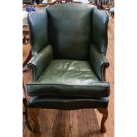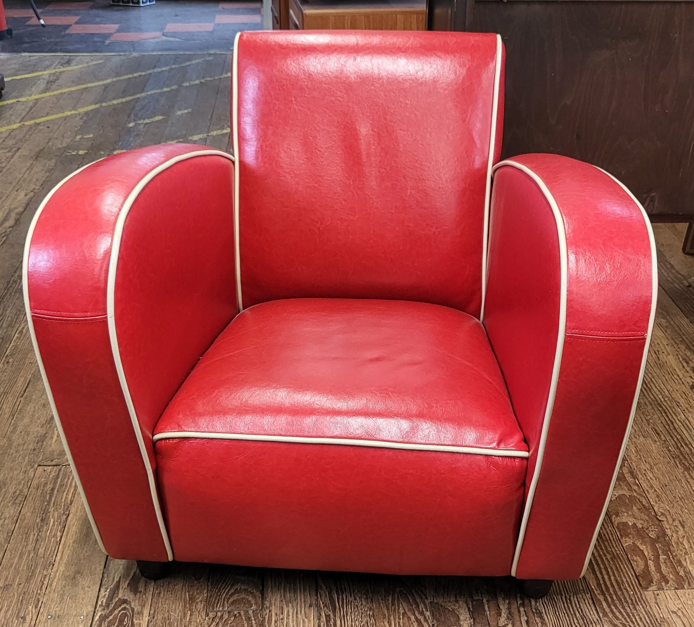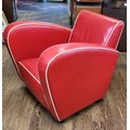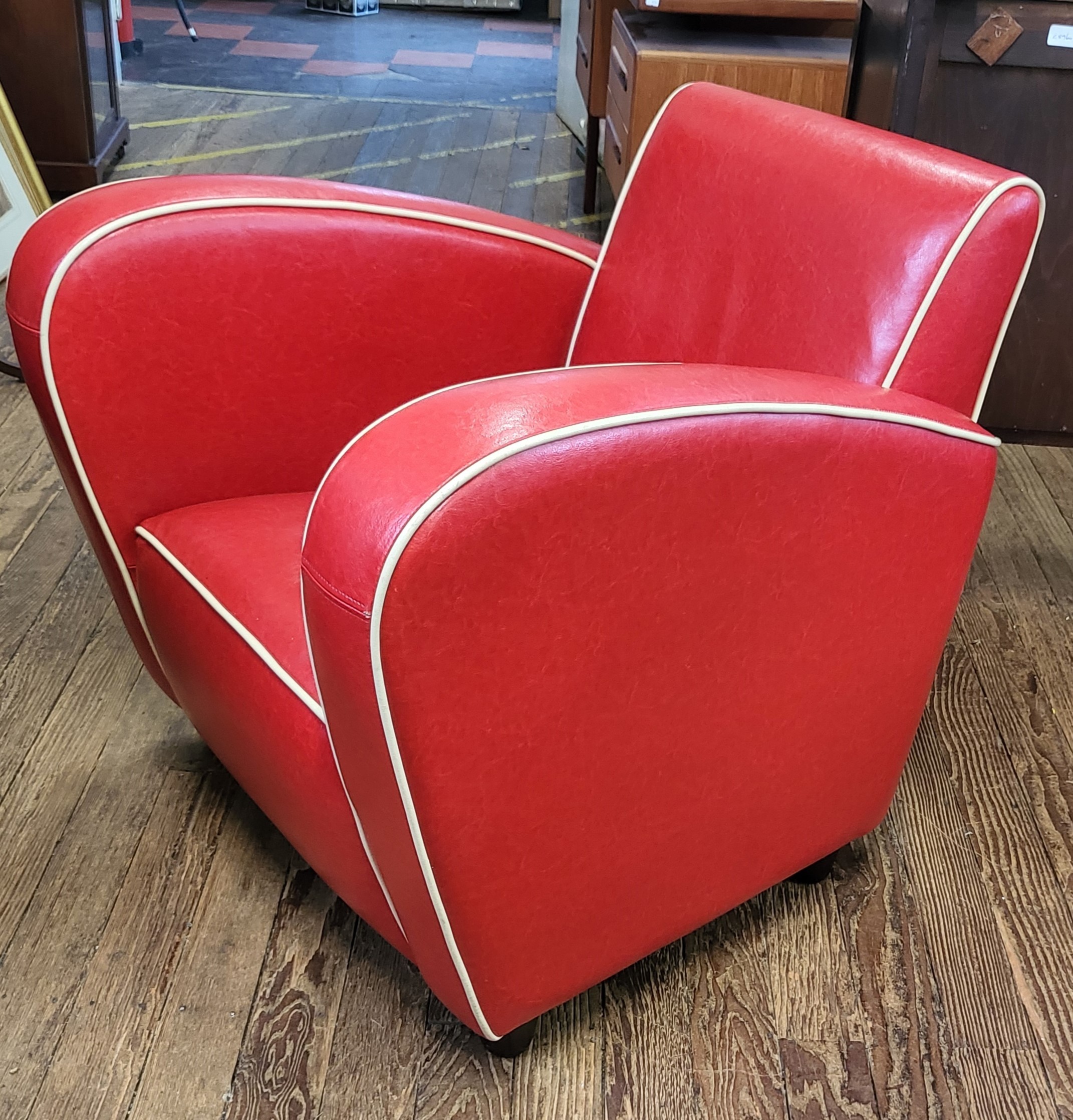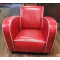 An Art Deco style club chair in red leather with cream piping. 78 x 78 x 84cm.