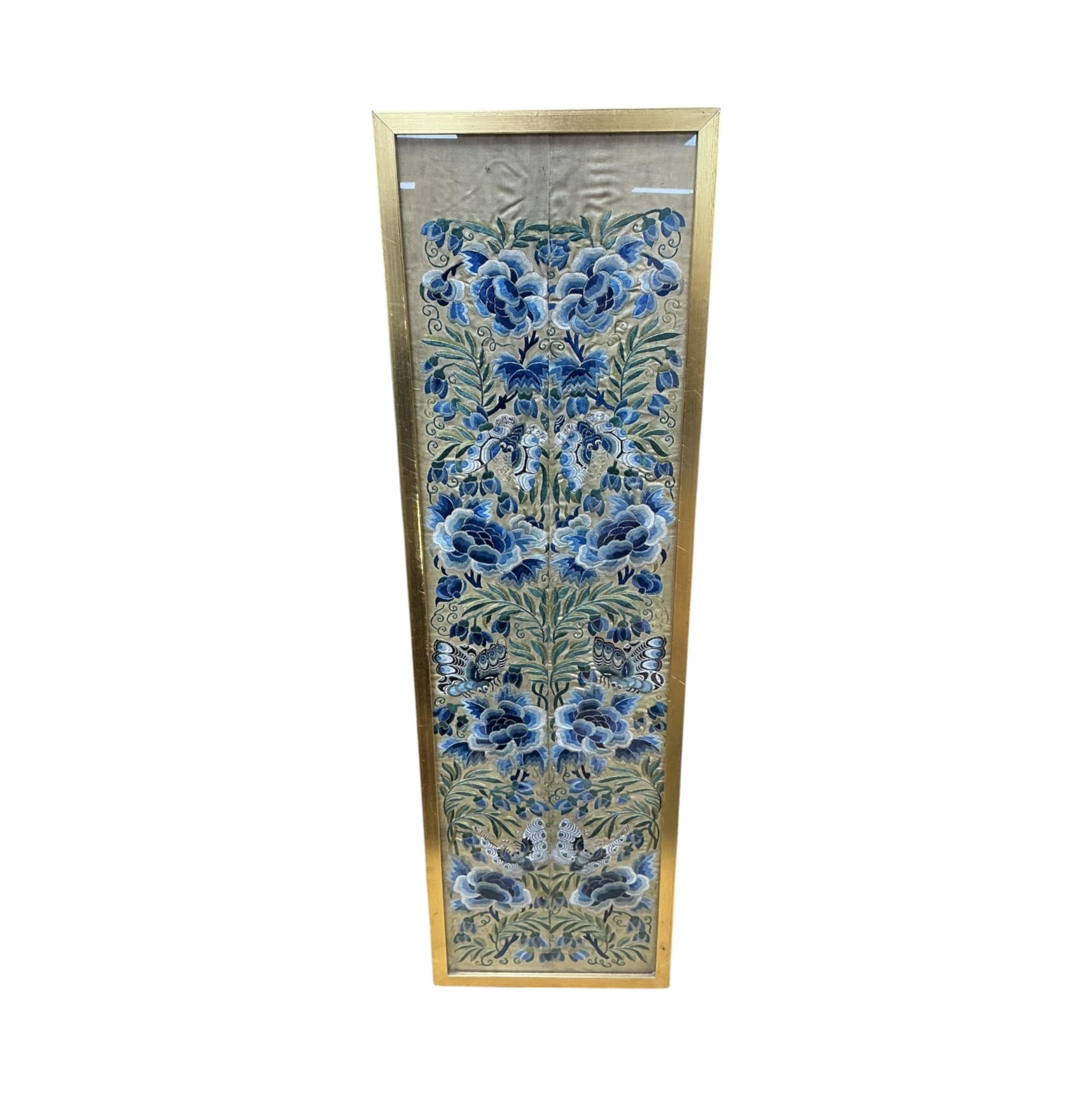 A Chinese silk sleeve panel embroidered with butterflies and flowers, framed, 63 x 17cm