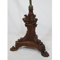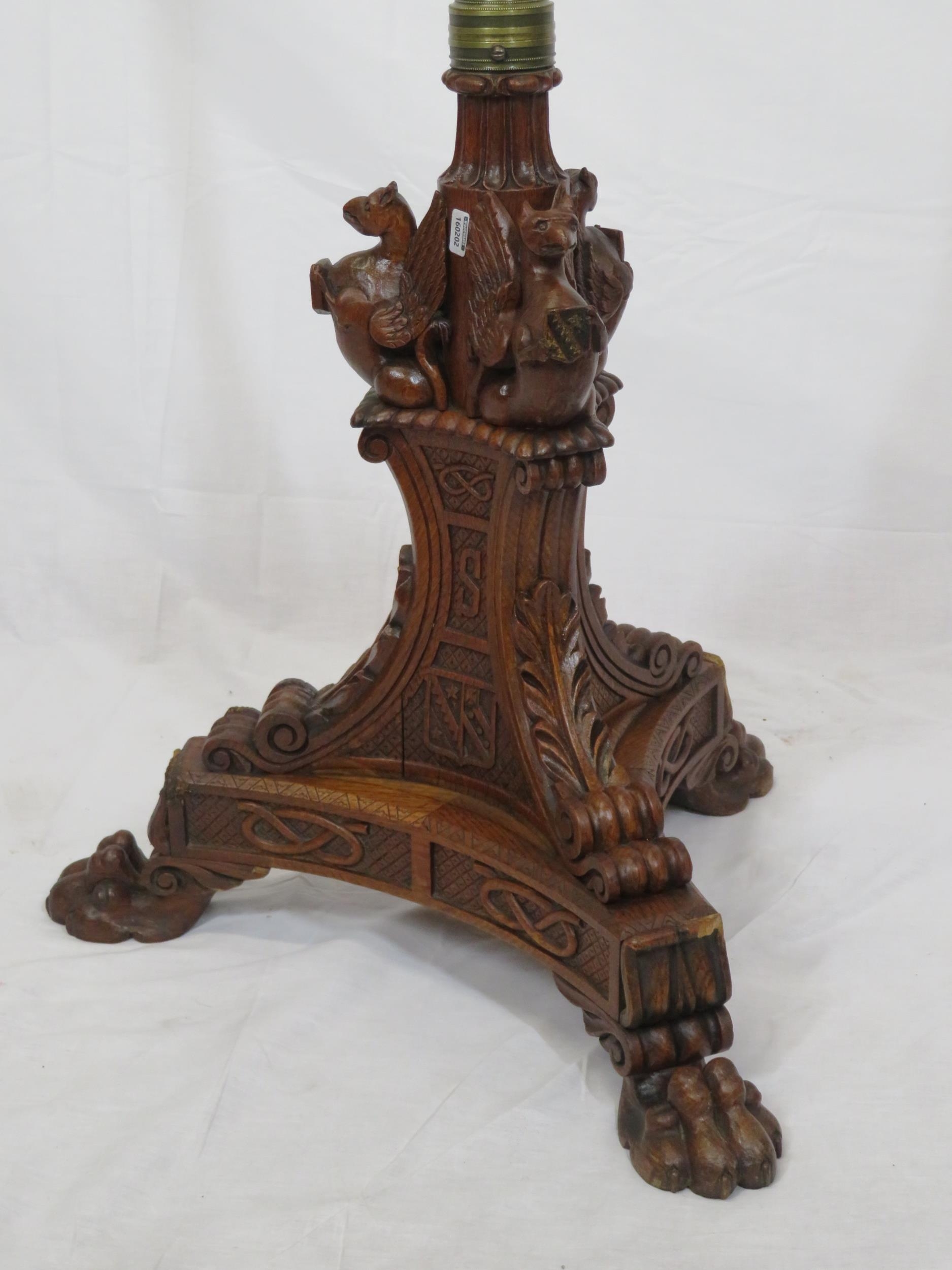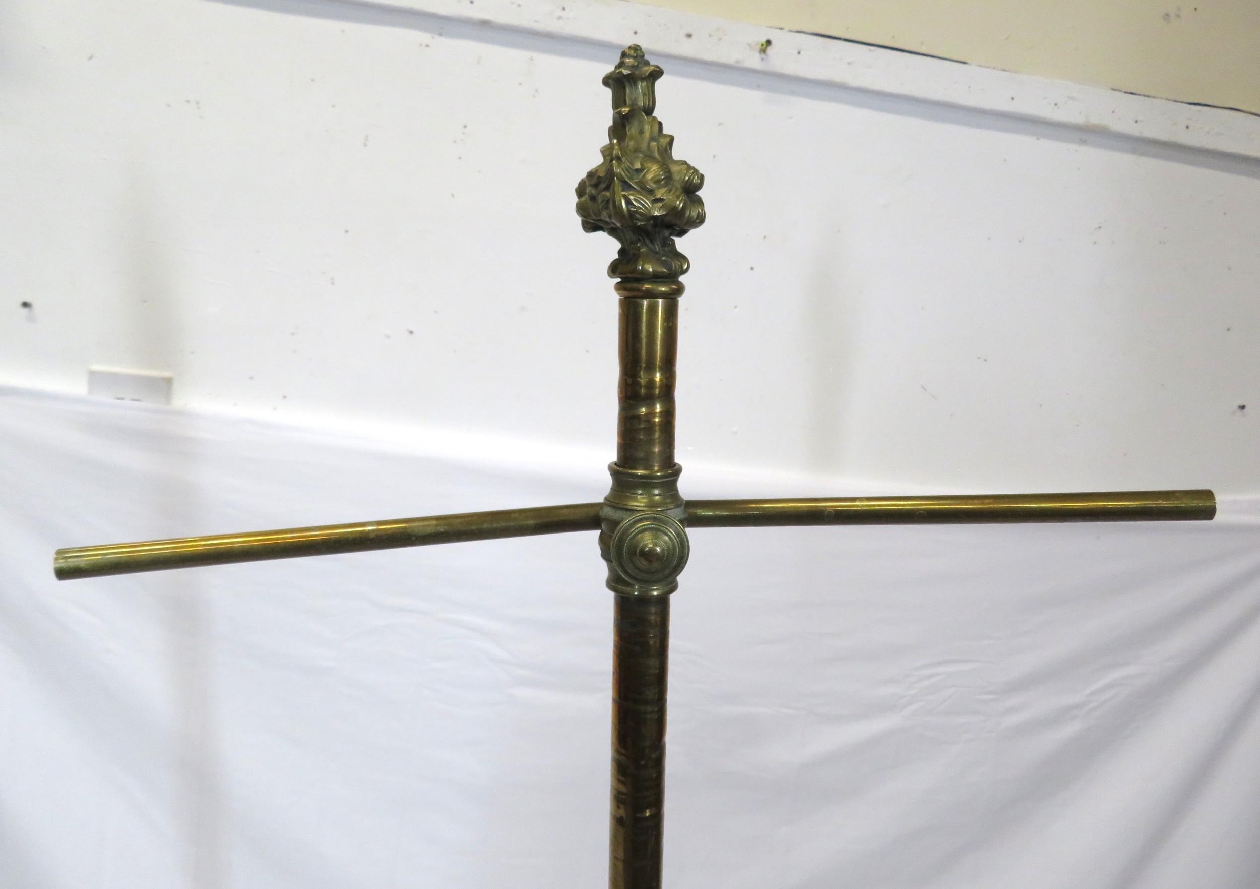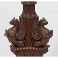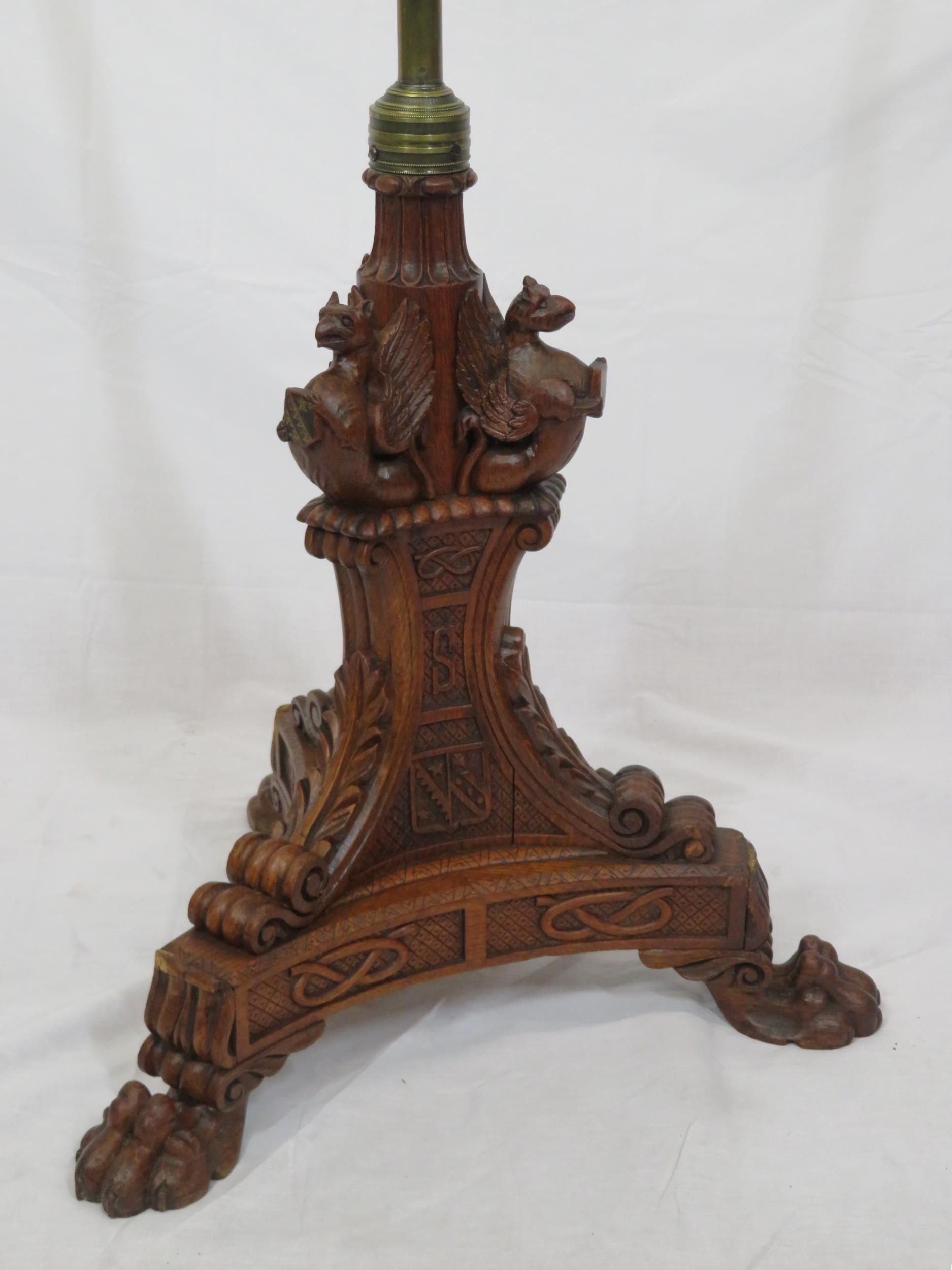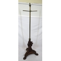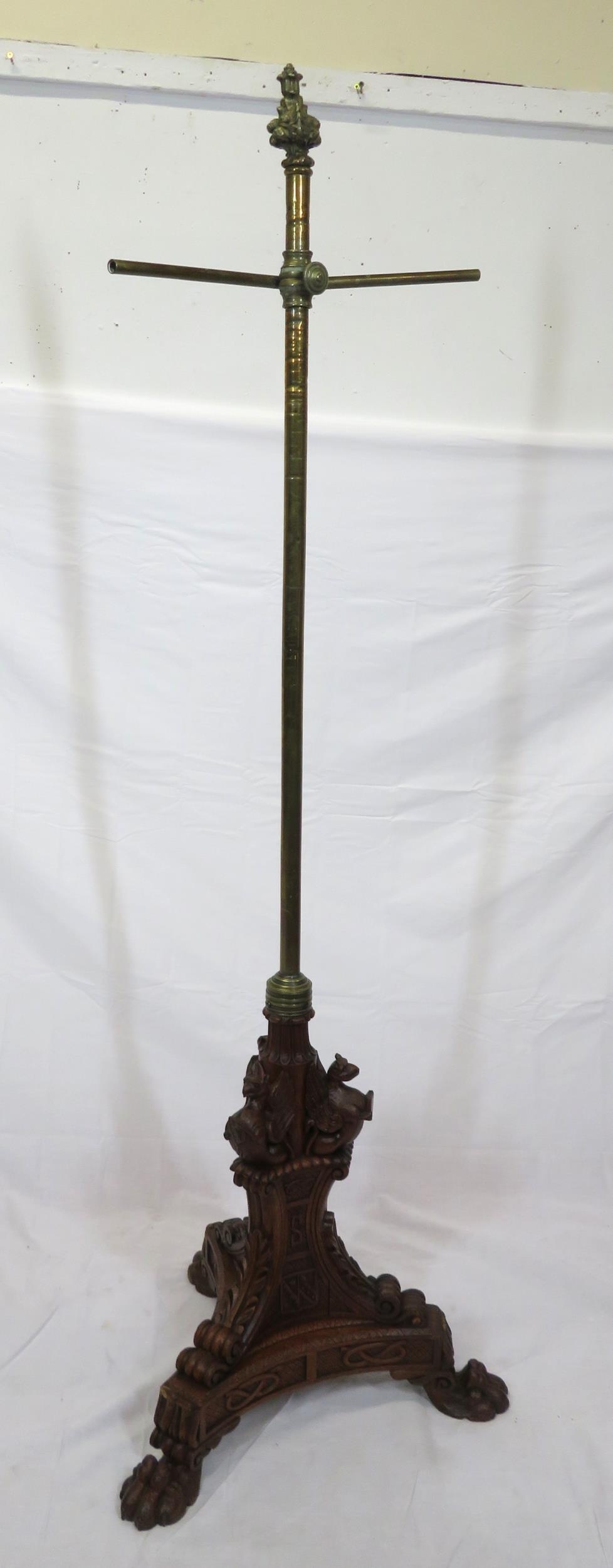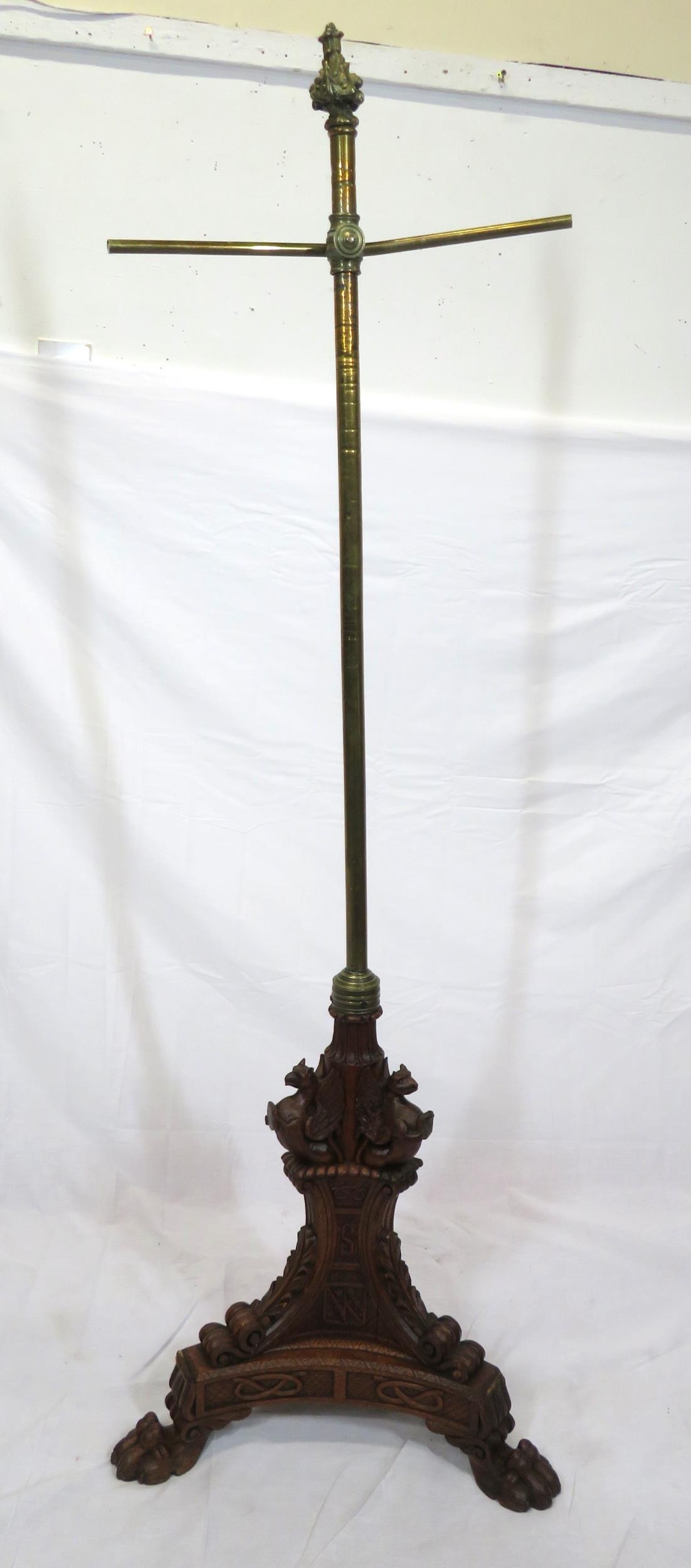 Pugin style brass & timber garment stand with adjustable top, carved gargoyles with shields, on shaped base with lionclaw feet