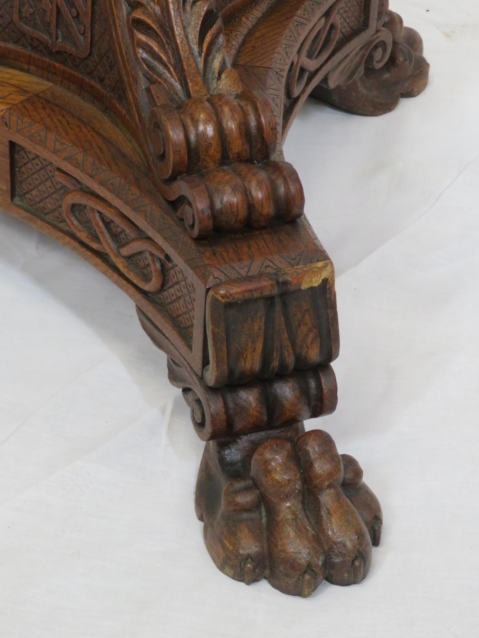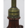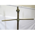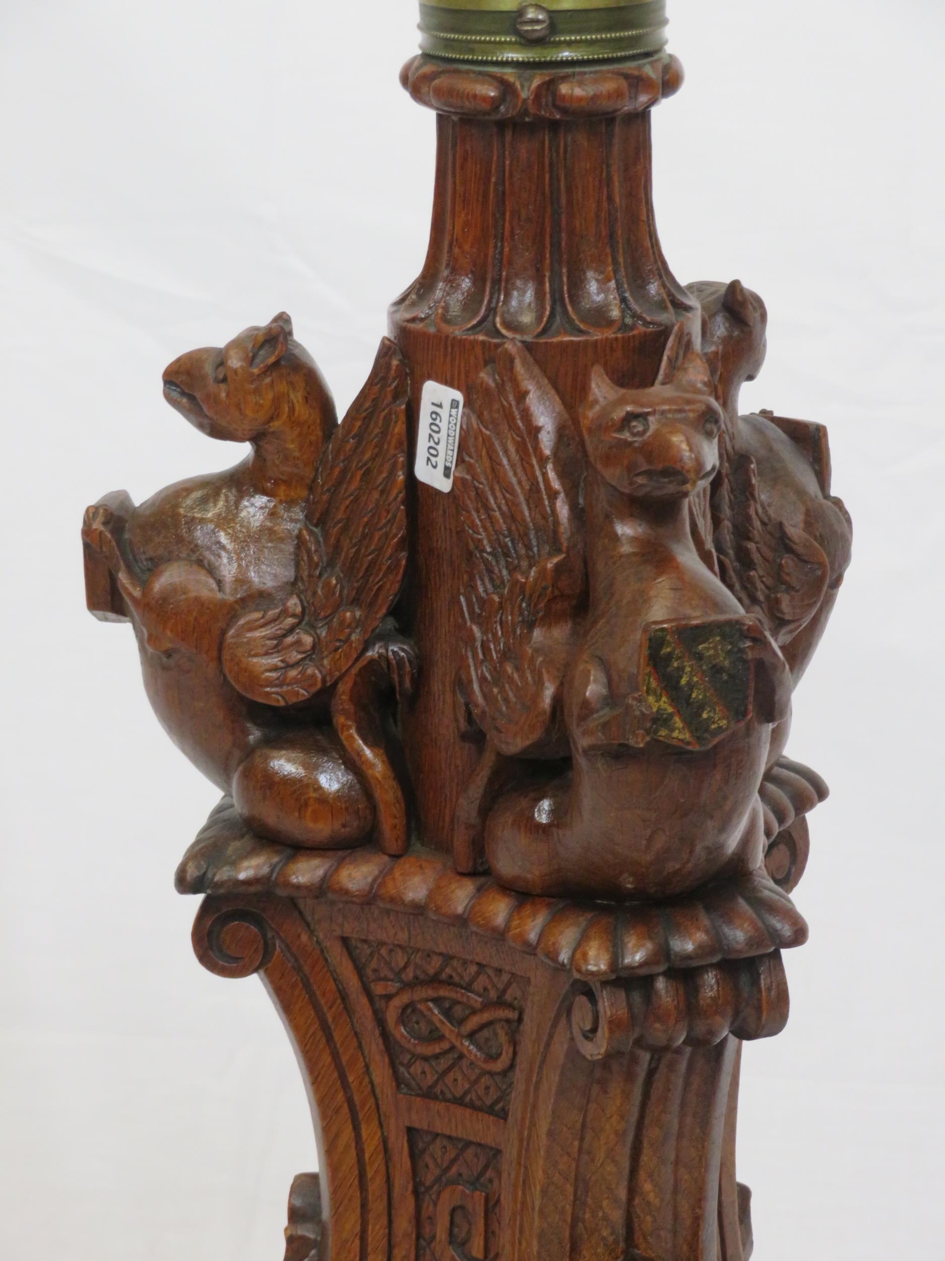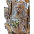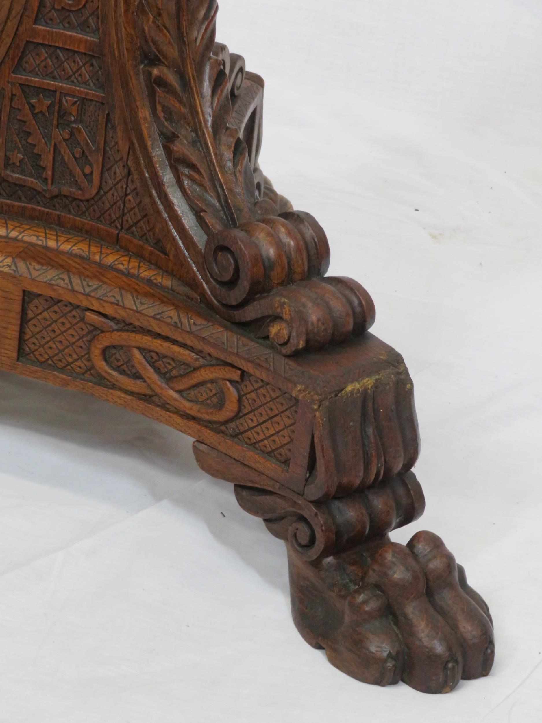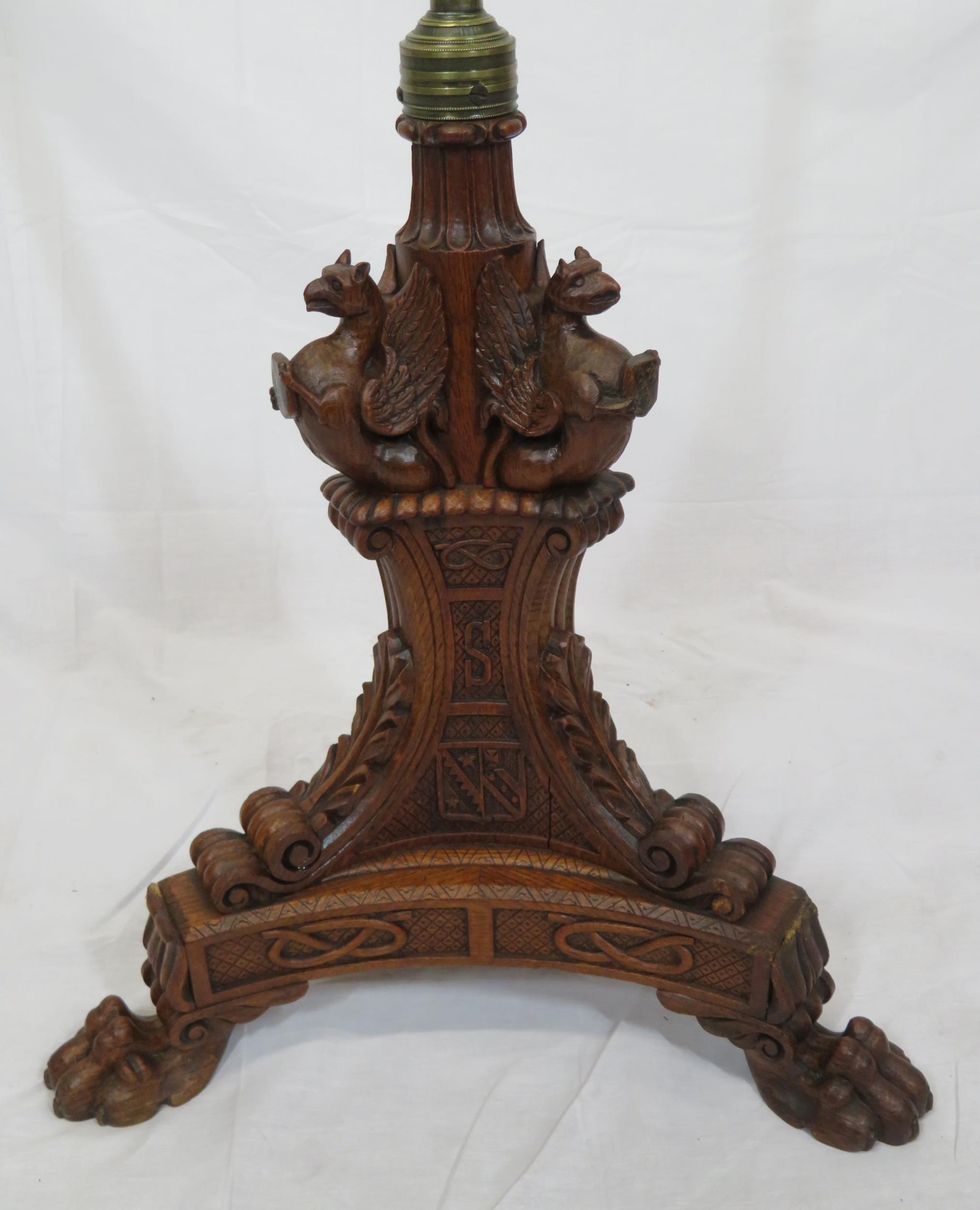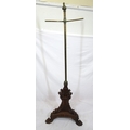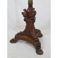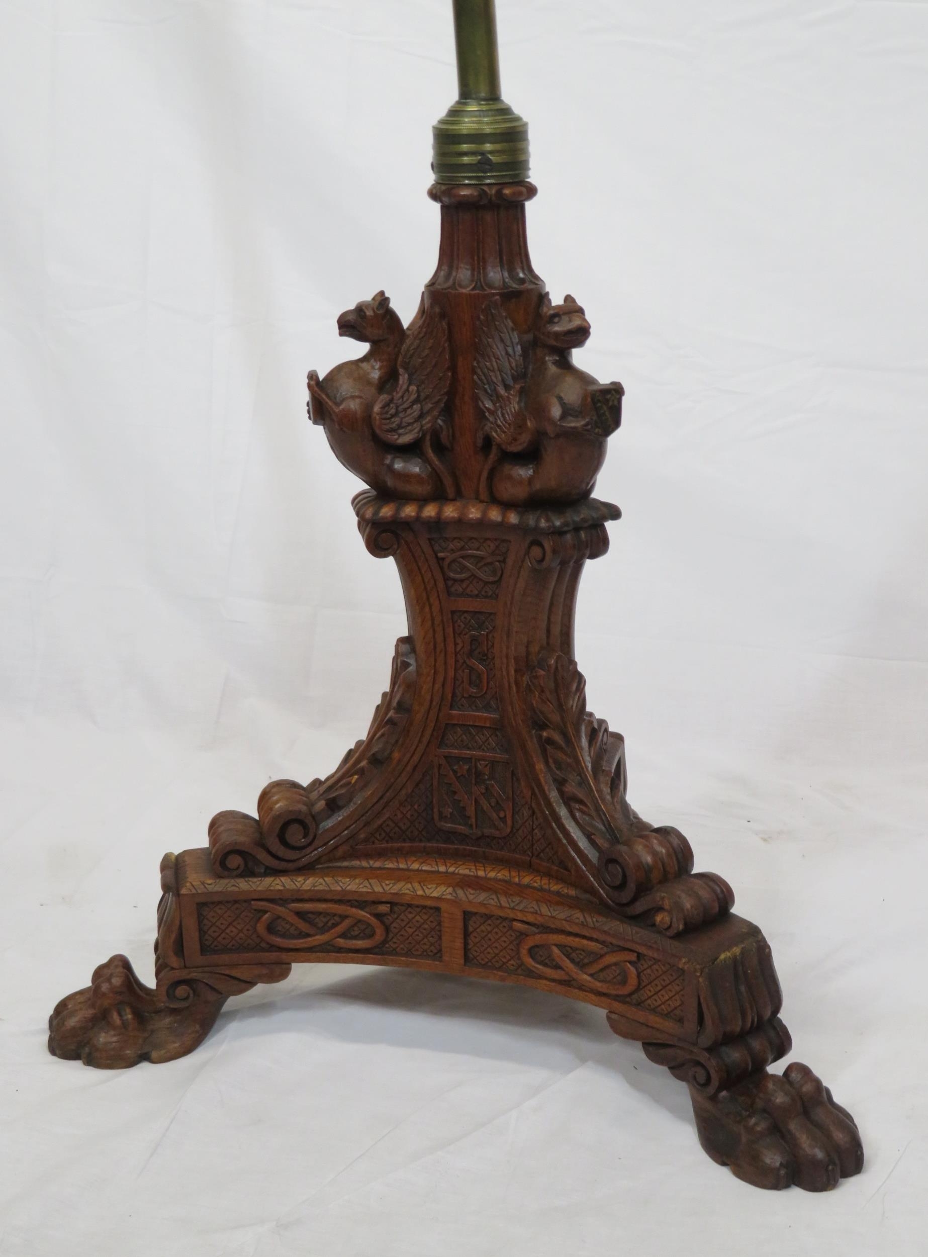 Pugin style brass & timber garment stand with adjustable top, carved gargoyles with shields, on shaped base with lionclaw feet