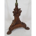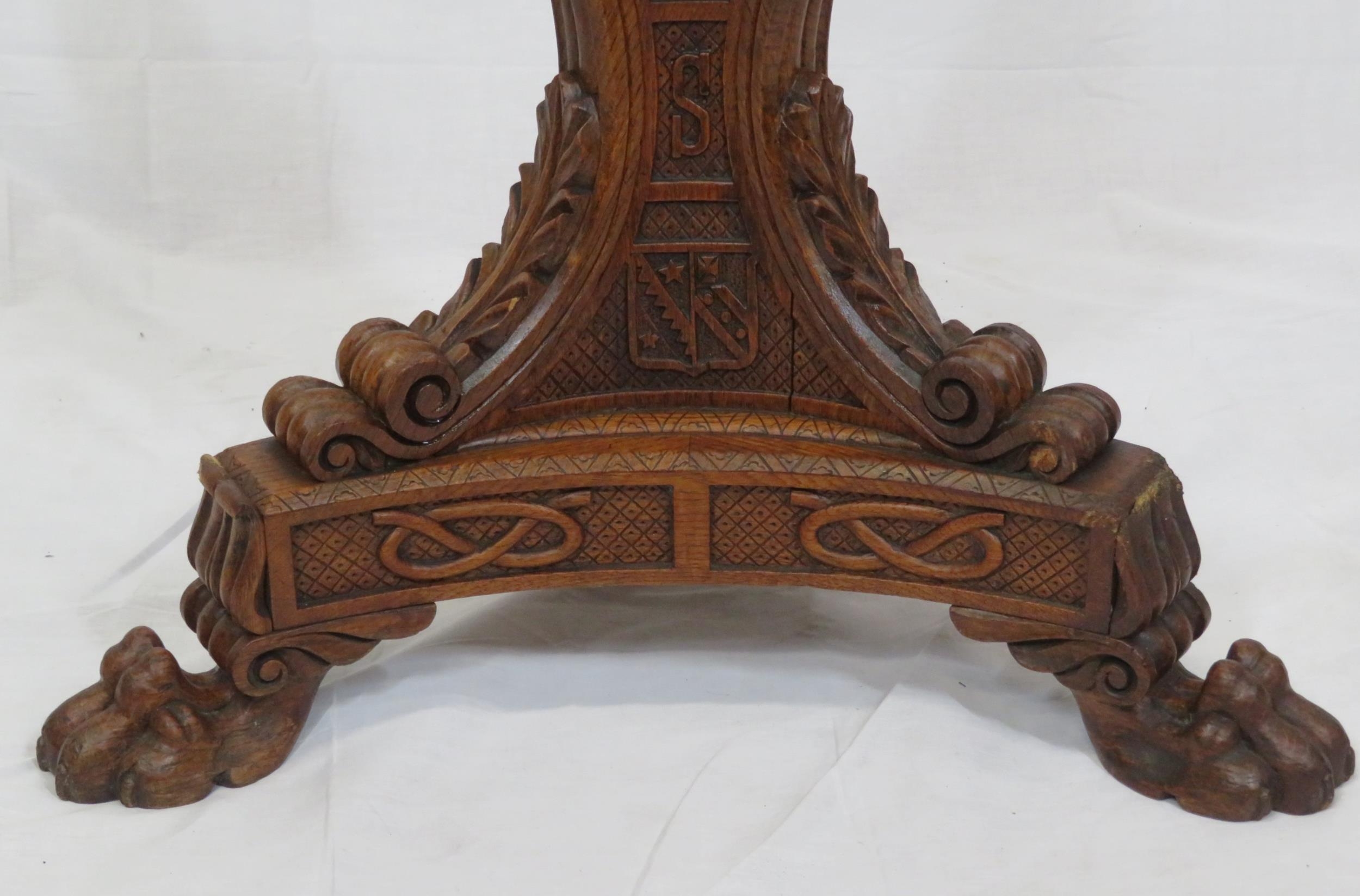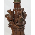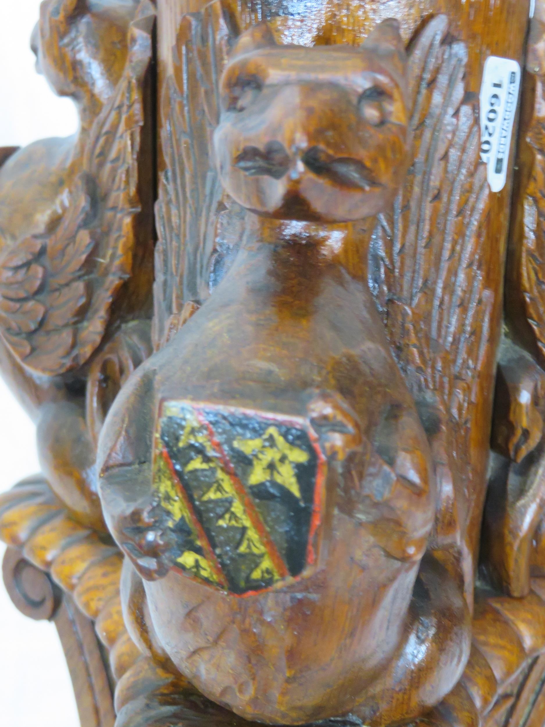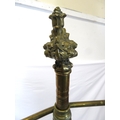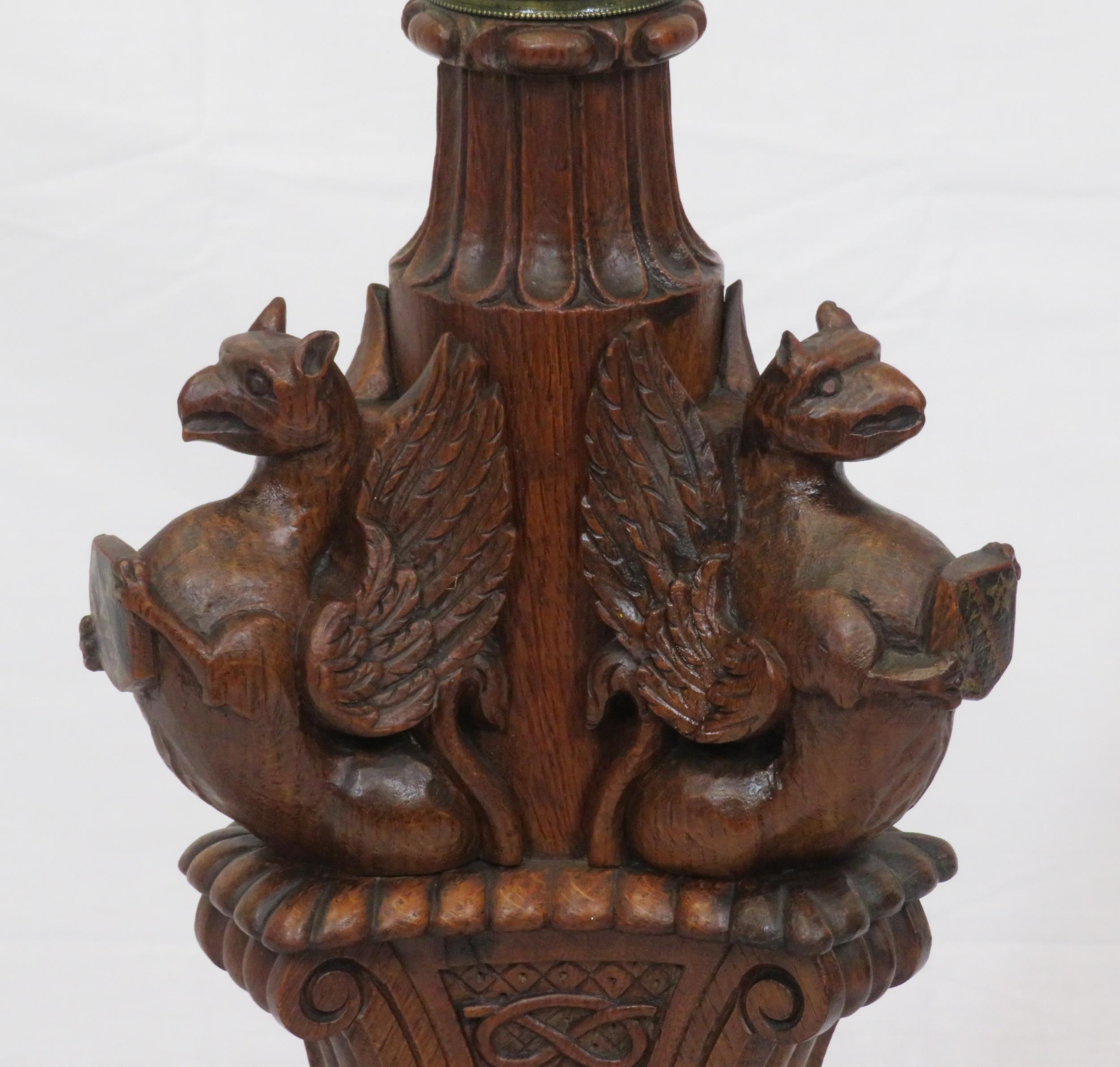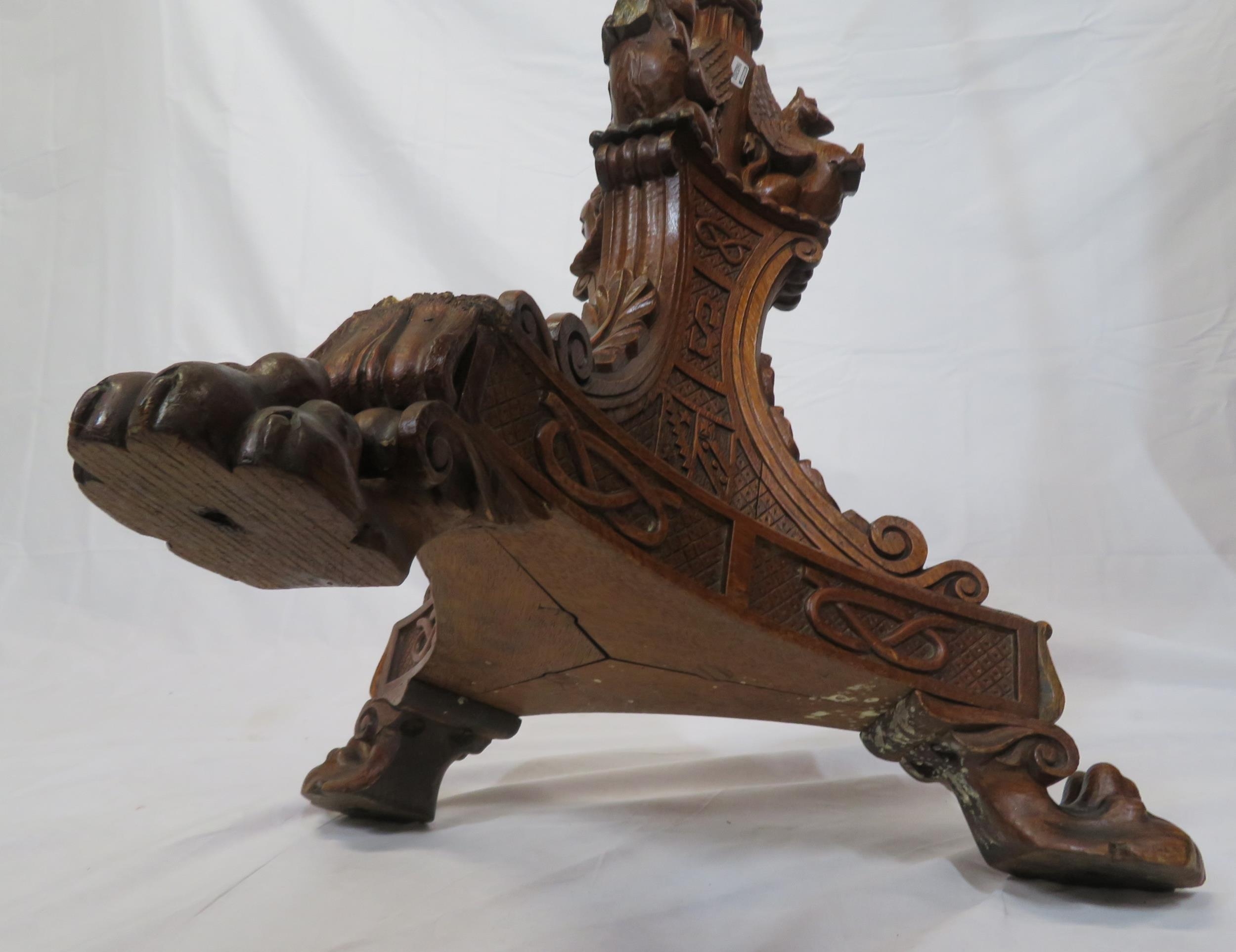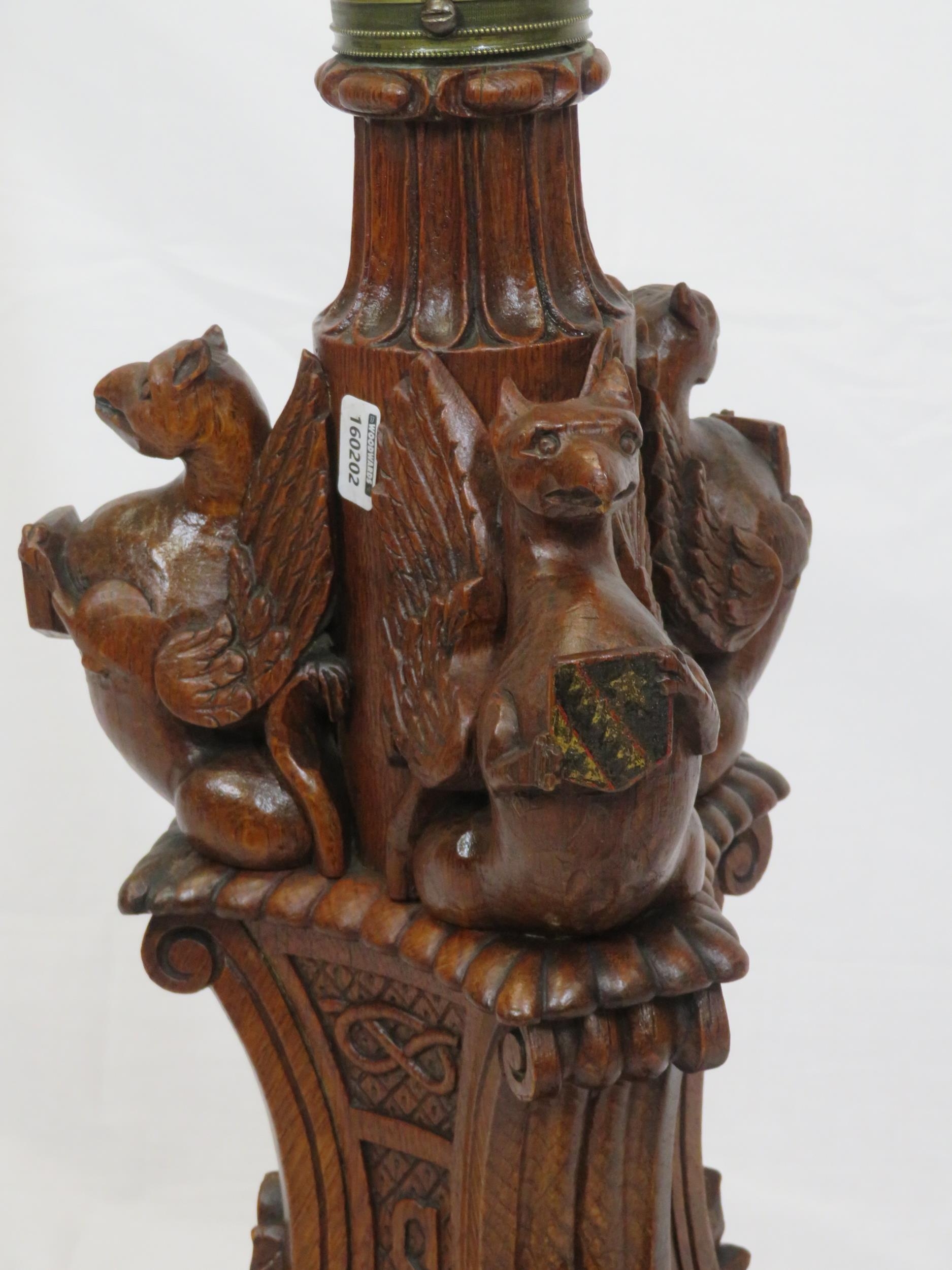 Pugin style brass & timber garment stand with adjustable top, carved gargoyles with shields, on shaped base with lionclaw feet