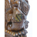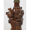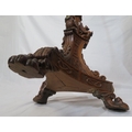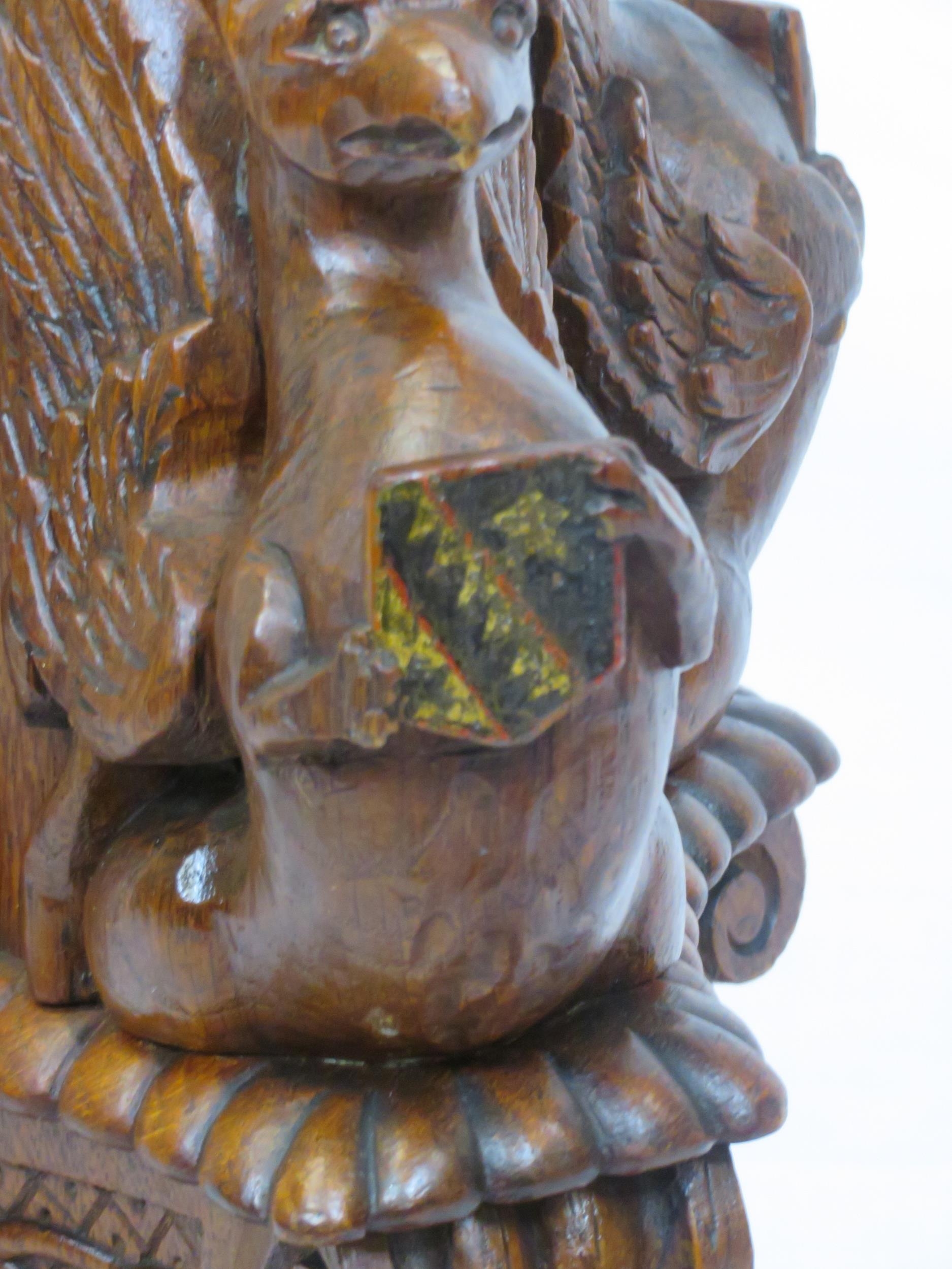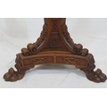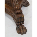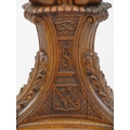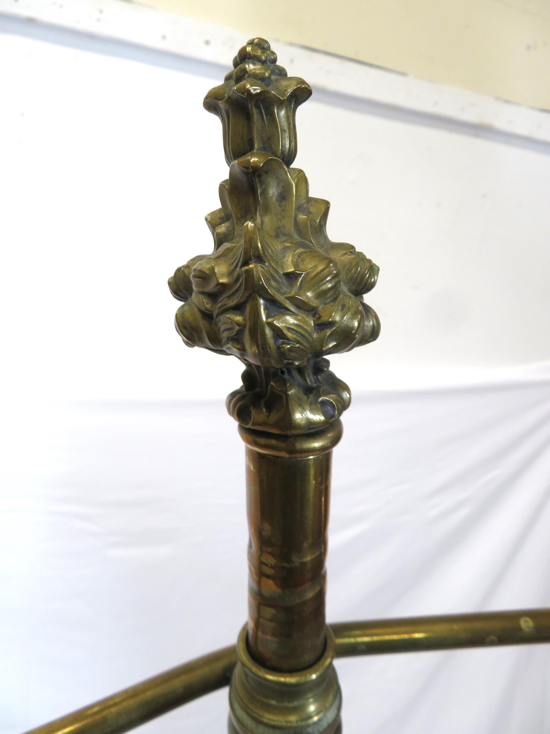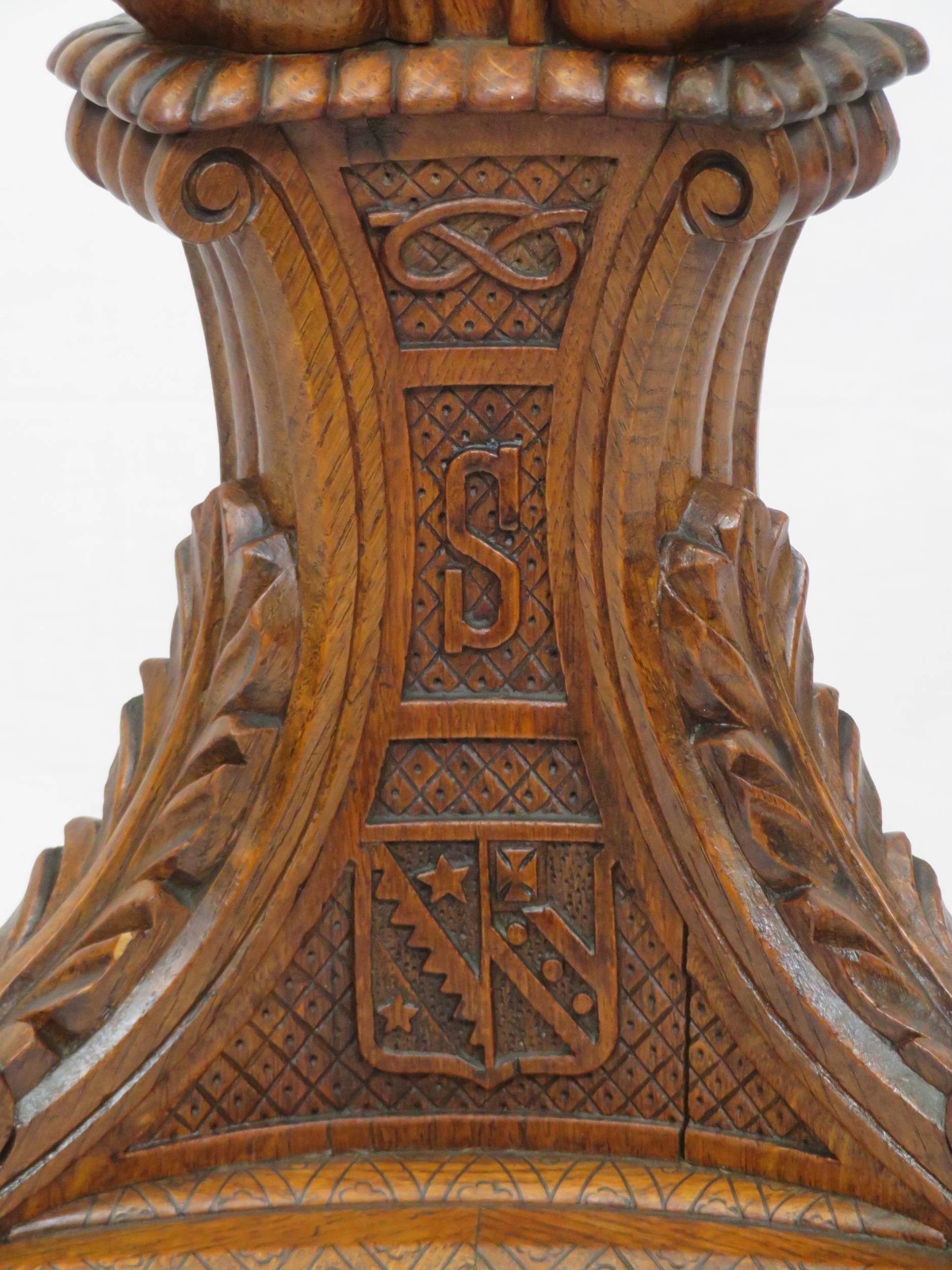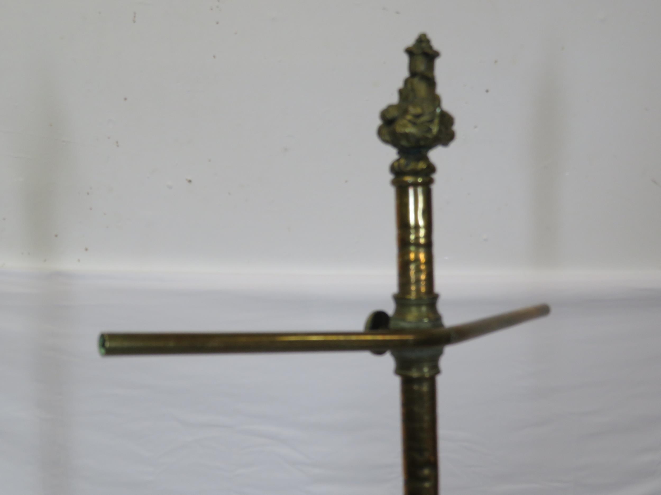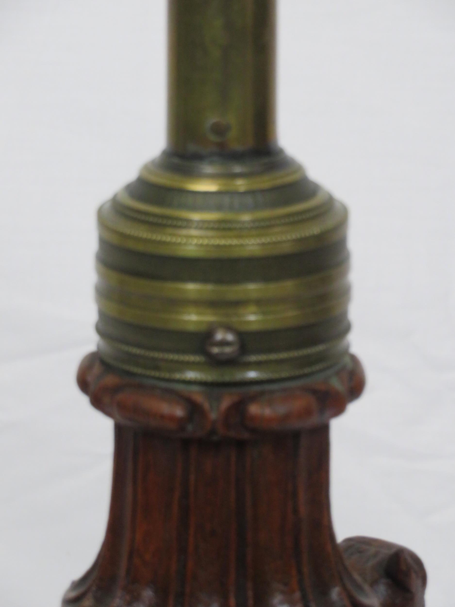 Pugin style brass & timber garment stand with adjustable top, carved gargoyles with shields, on shaped base with lionclaw feet