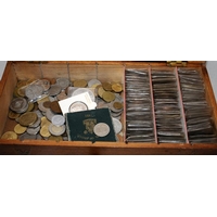 A small aluminium case containing a large quantity of carded coins, coin sets and commemoratives. Lot also includes a number of Royal Mail stamps presentation packs and first day covers