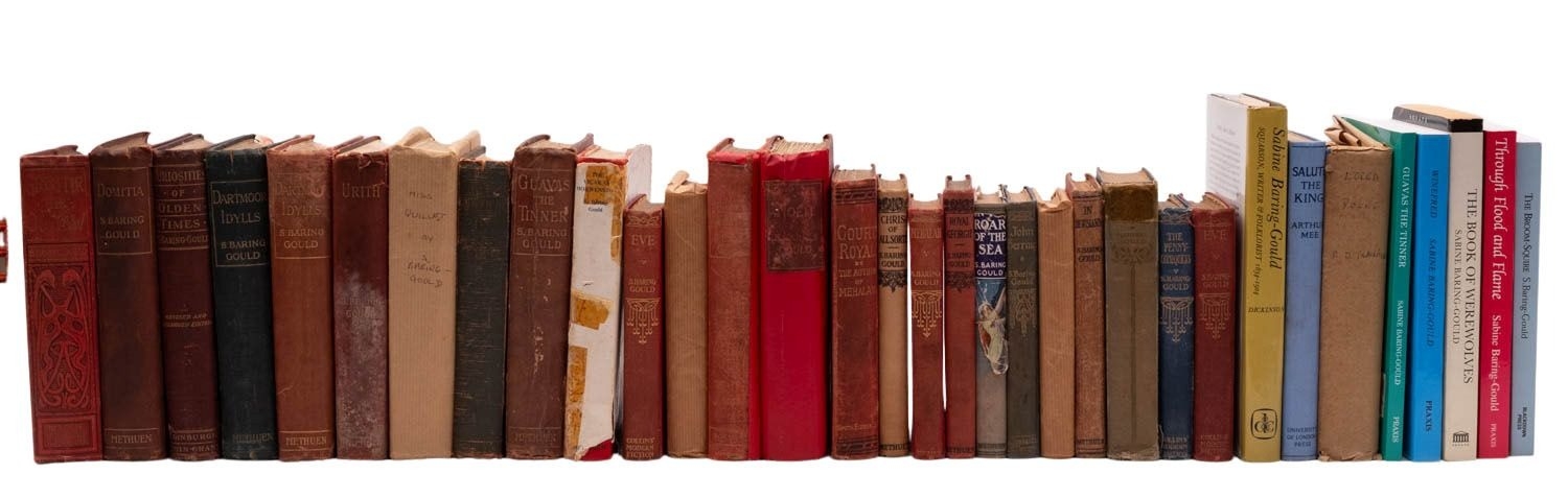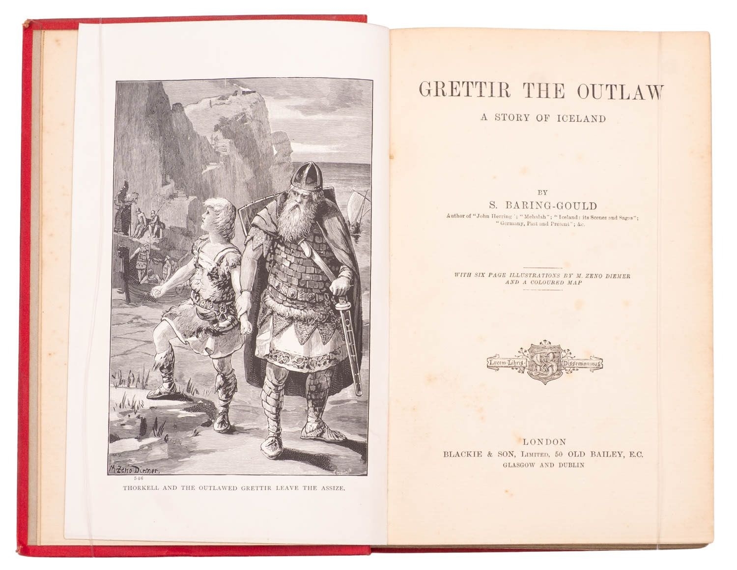BARING-GOULD, Sabine. A collection of volumes including: Grettir the Outlaw, A Story of Iceland, London: Blackie & Son, nd, frontis., map, plates by M. Zeno Diemer, some spotting, orig. pictorial red cloth scuffed, 8vo; IDEM. Dartmoor Idylls, London: Methuen & Co., 1896, orig. red cloth gilt stained/scuffed, 8vo., with another copy in green cloth; IDEM. Urith, A Tale of Dartmoor, ibid, 1891, red cloth distressed, 8vo; IDEM. Domitia, ibid, 1898, red cloth distressed, 8vo; IDEM; Curiosities of Olden Times, Edinburgh: John Grant, 1895, red cloth scuffed, 8vo; and 19 other works by Baring-Gould, various editions, mixed condition; ... together with 6 later vols related (5 pbk.), and two unrelated. (33)