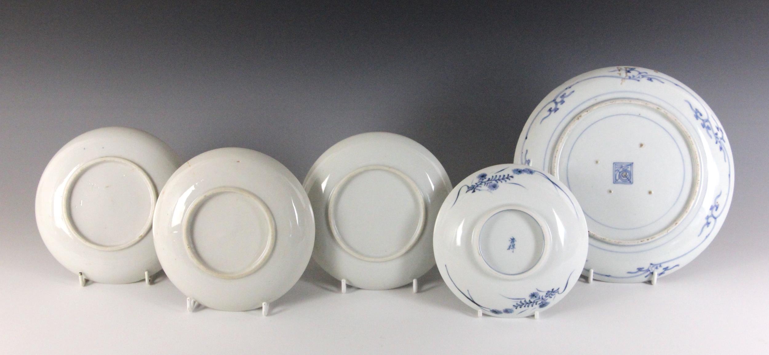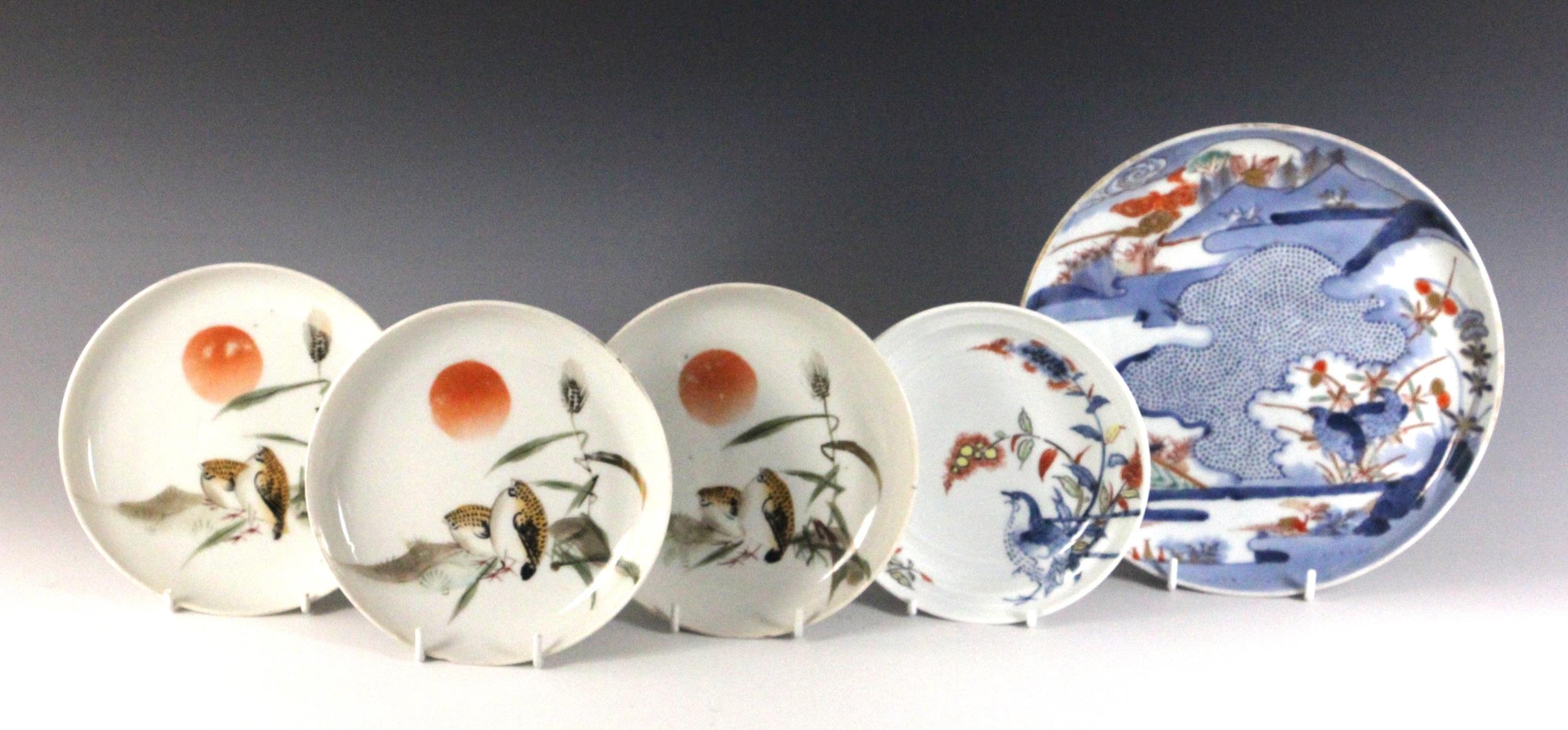 A Japanese porcelain Imari plate, Meiji Period (1868-1912), of circular form and painted with two quail amidst an extensive landscape, 21cm diameter, a set of three quail pattern plates, 15.5cm diameter, a smaller Japanese quail pattern plate, 14.3cm diameter (5)