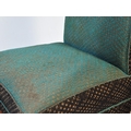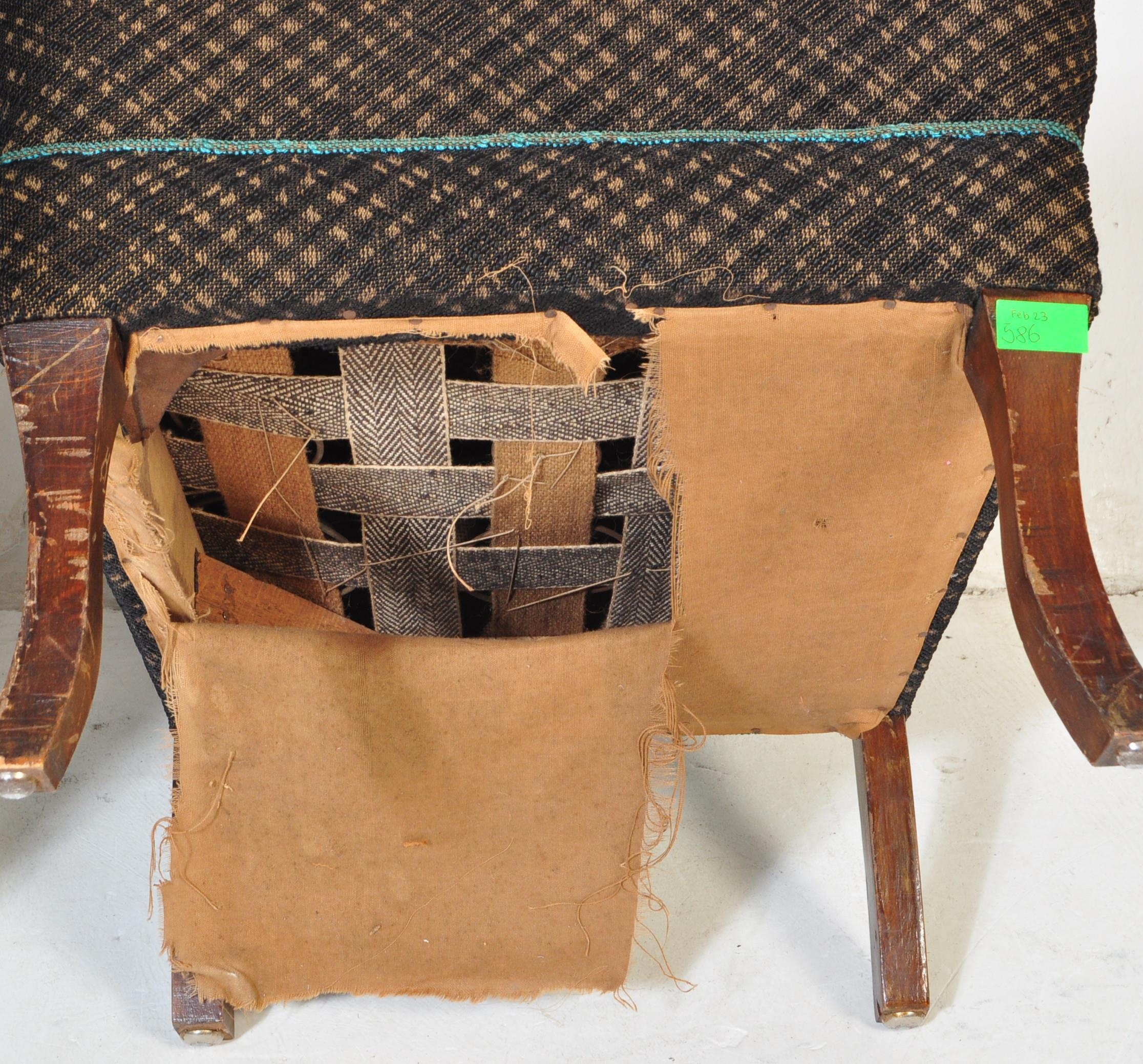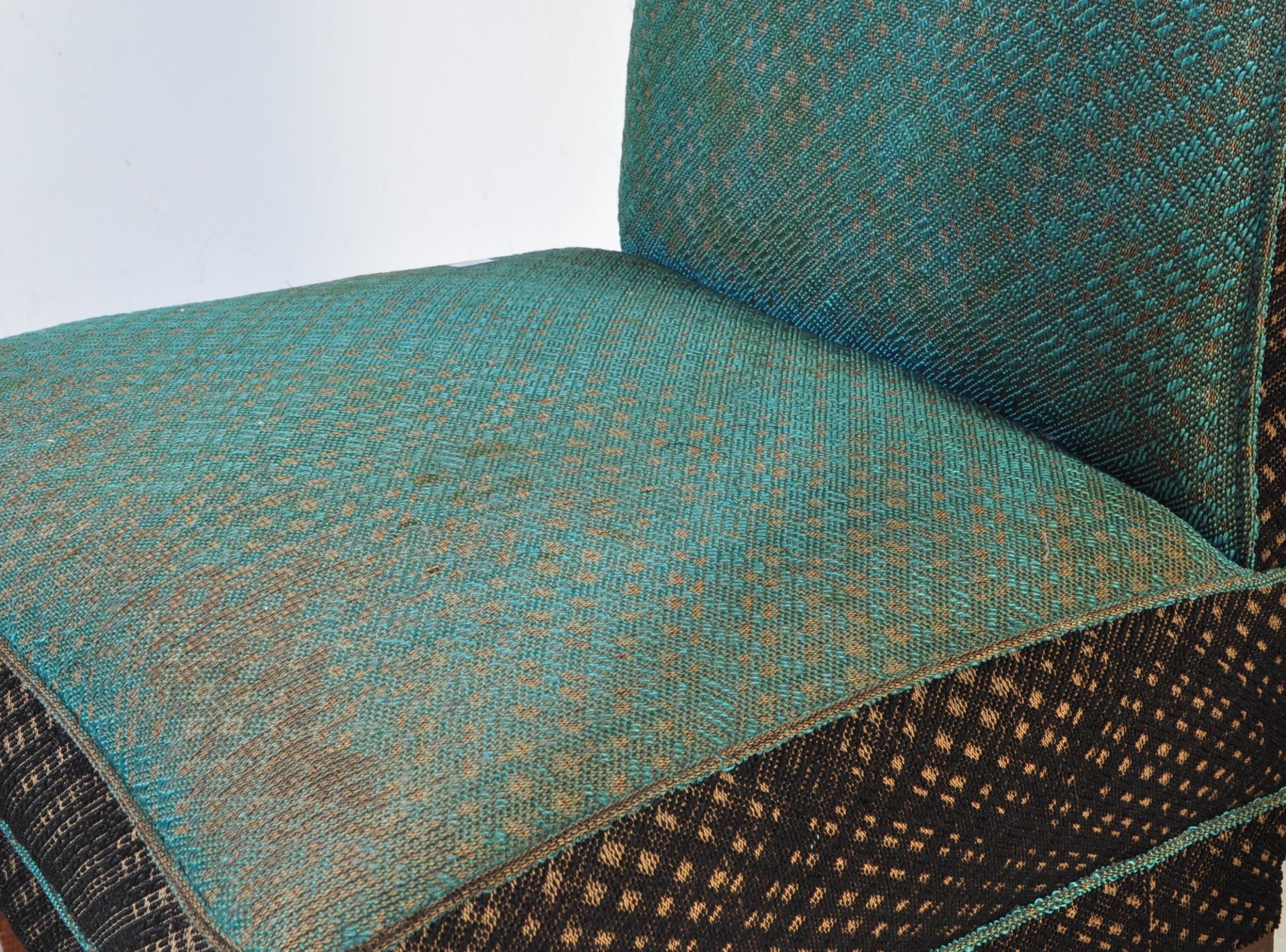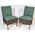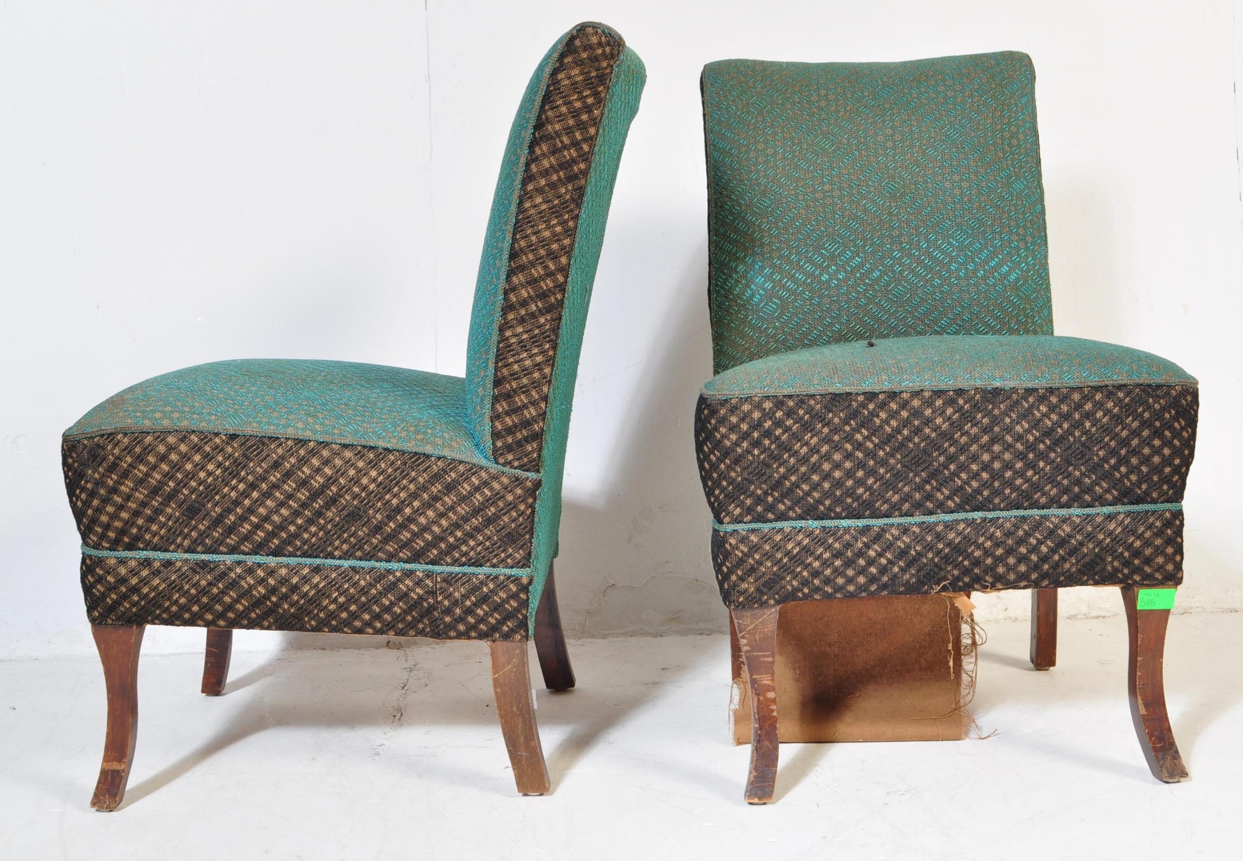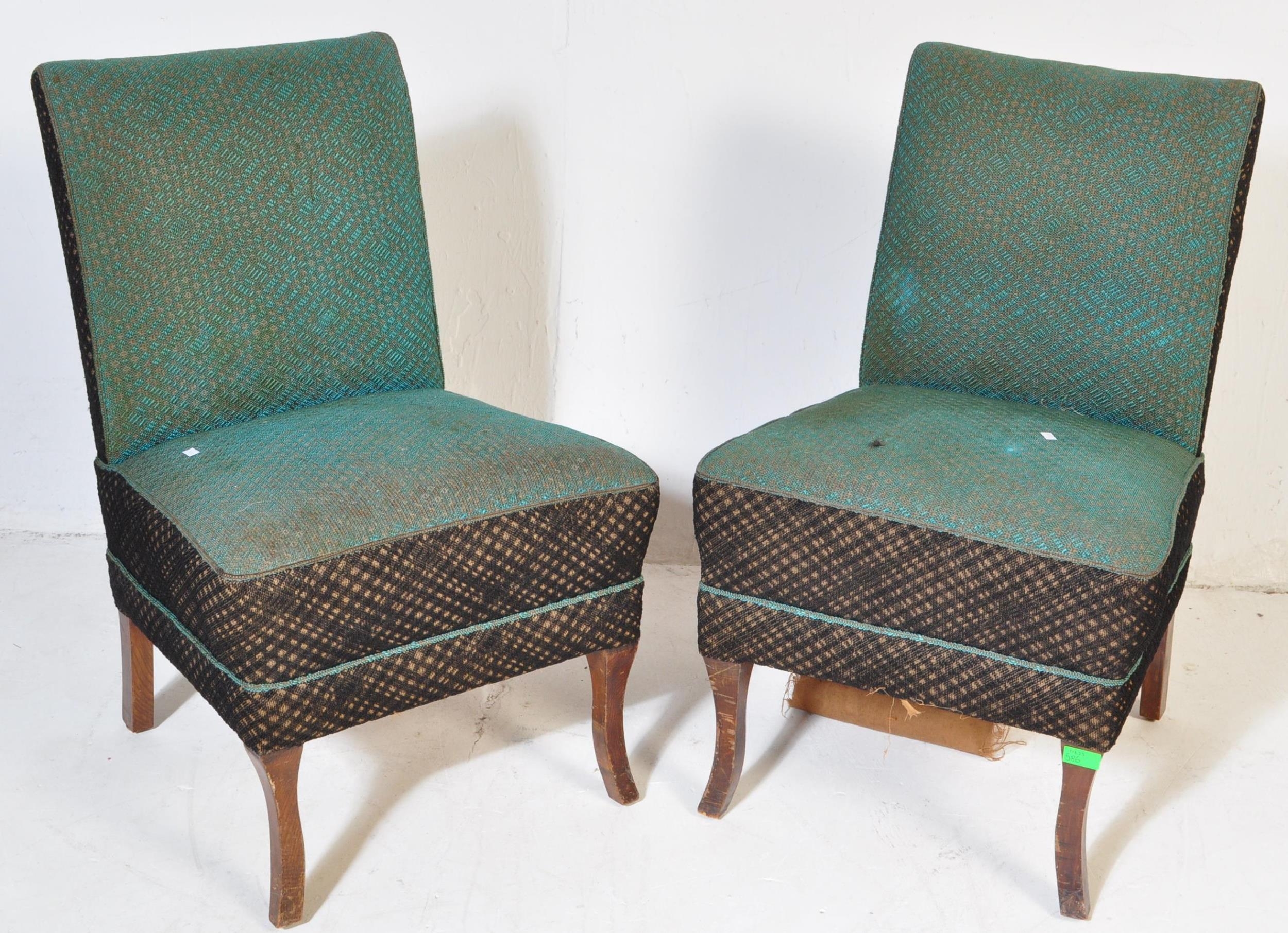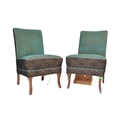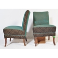 A pair of retro vintage mid 20th Century 1940s cocktail chairs. Having a upright backrest, with square upholstered cushioned seat, with curved square supports. Finished in a chequered green fabric. Measures approx. 77cm x 50cm x 56cm.