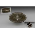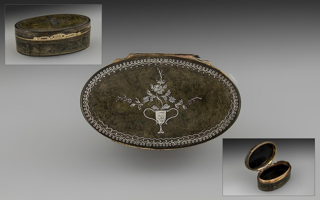 French 18th Century Magnificent Pressed Horn Lidded Snuff Box, of oval form, circa 1780. The interior with 9ct rose gold bands/rims. The cover with silver pique work to centre and border. Wonderful workmanship/condition. 3.25'' - 8.20 cm diameter. The cover closes tightly. Excellent condition, no repairs.