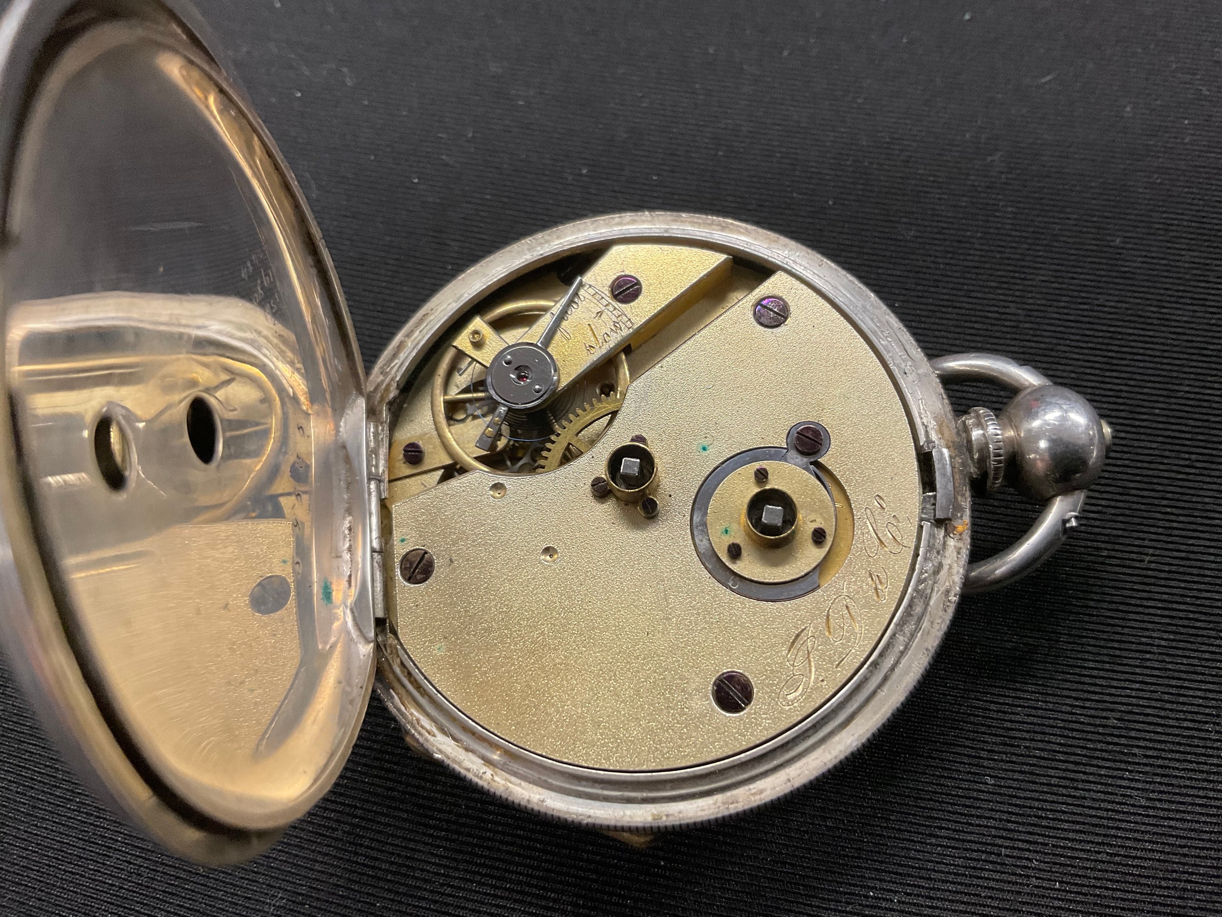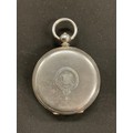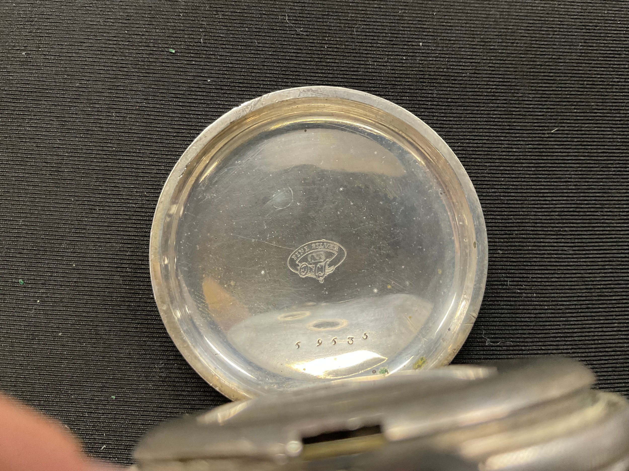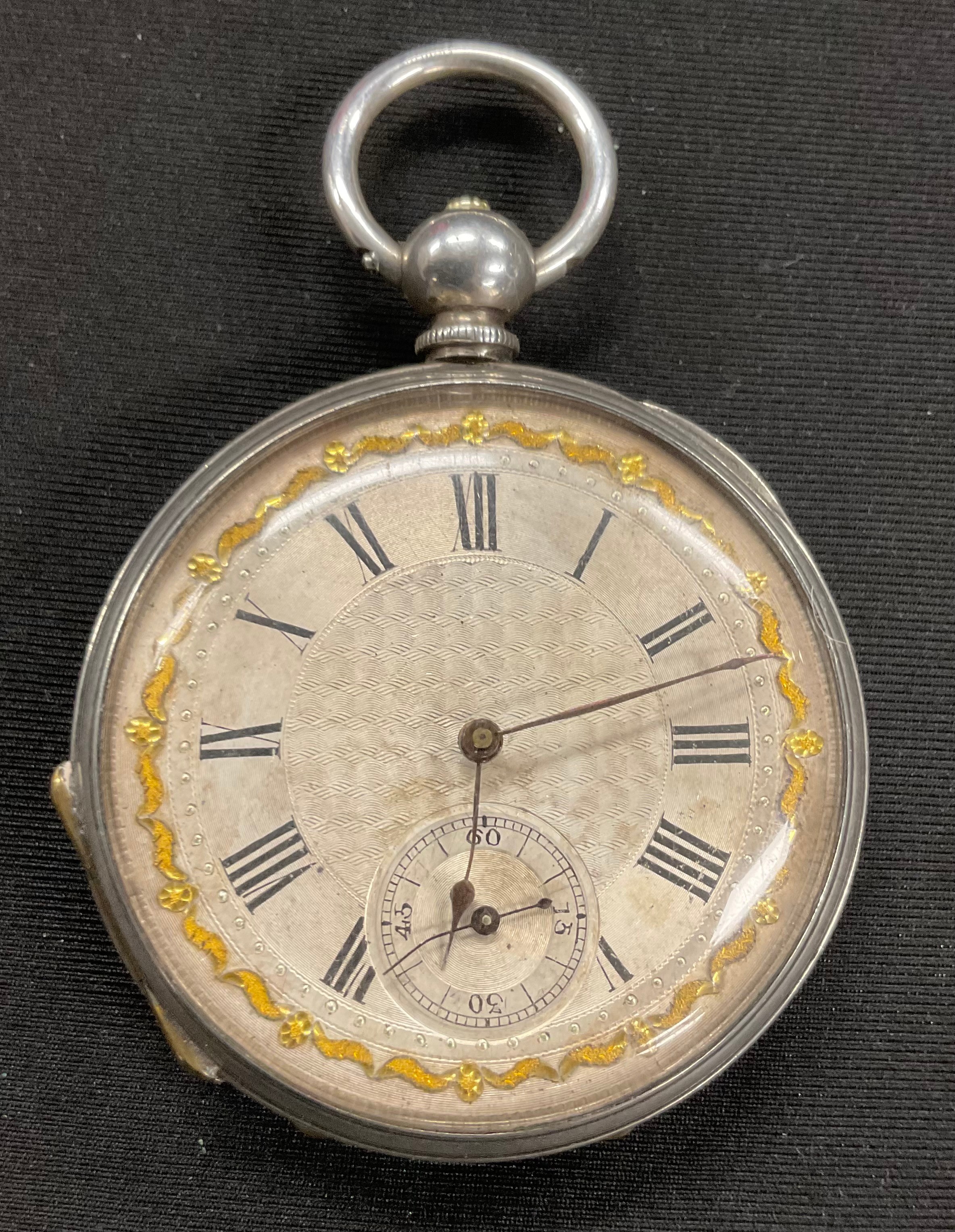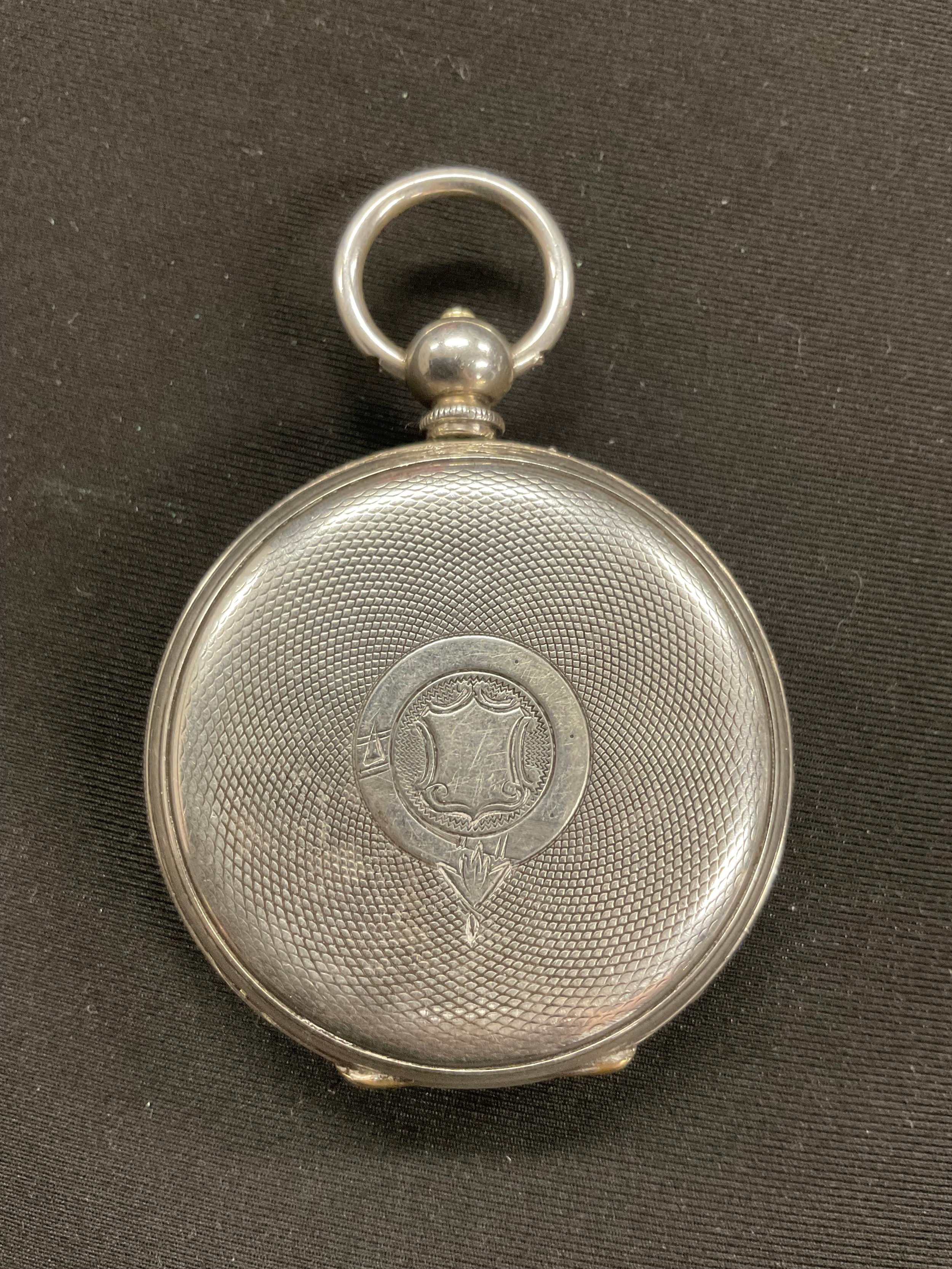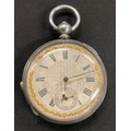 An ornate silver cased pocket watch, 47mm silvered face with secondary seconds dial, Roman numerals, serial no. 59635, marked ‘fine silver’