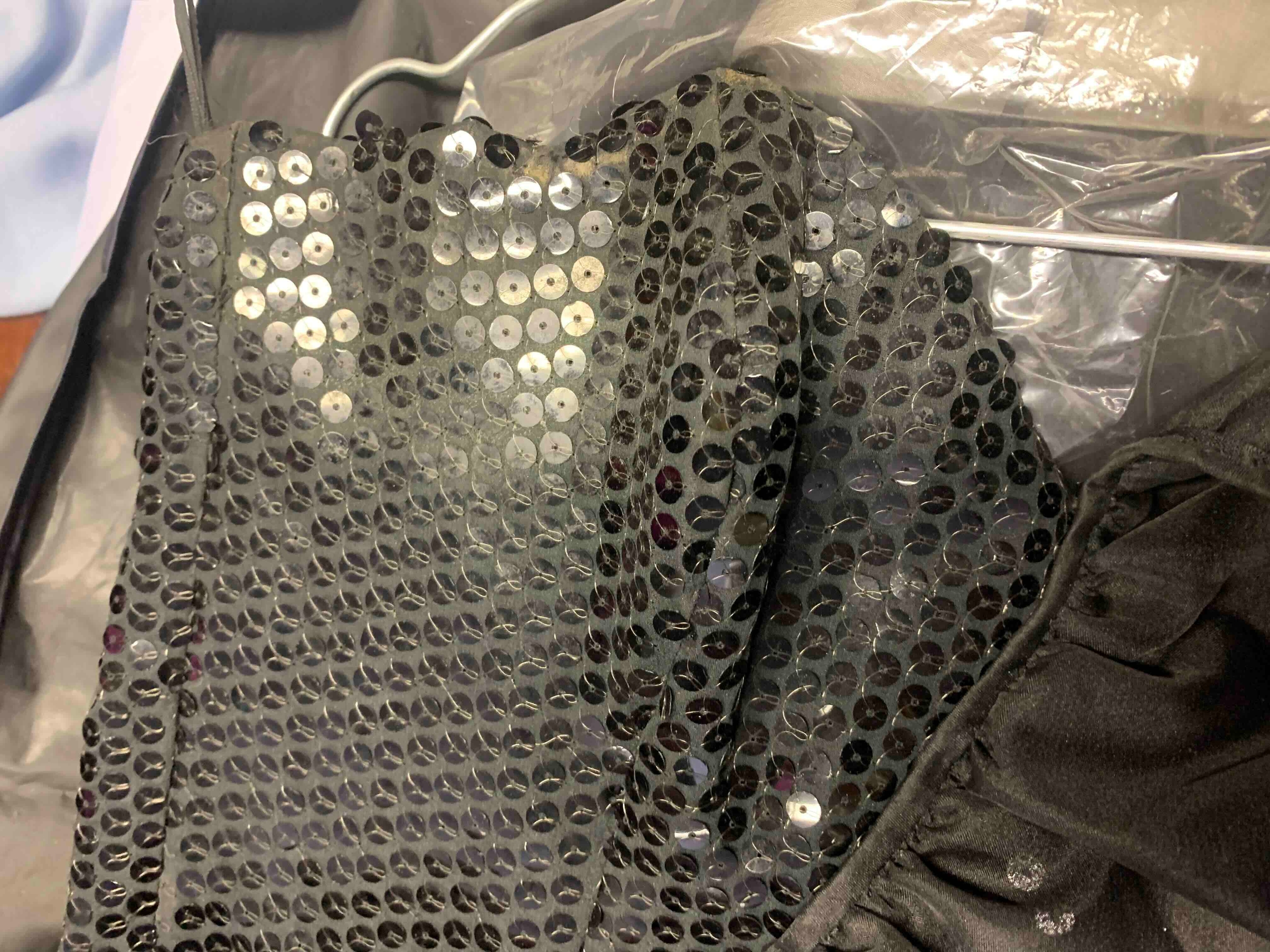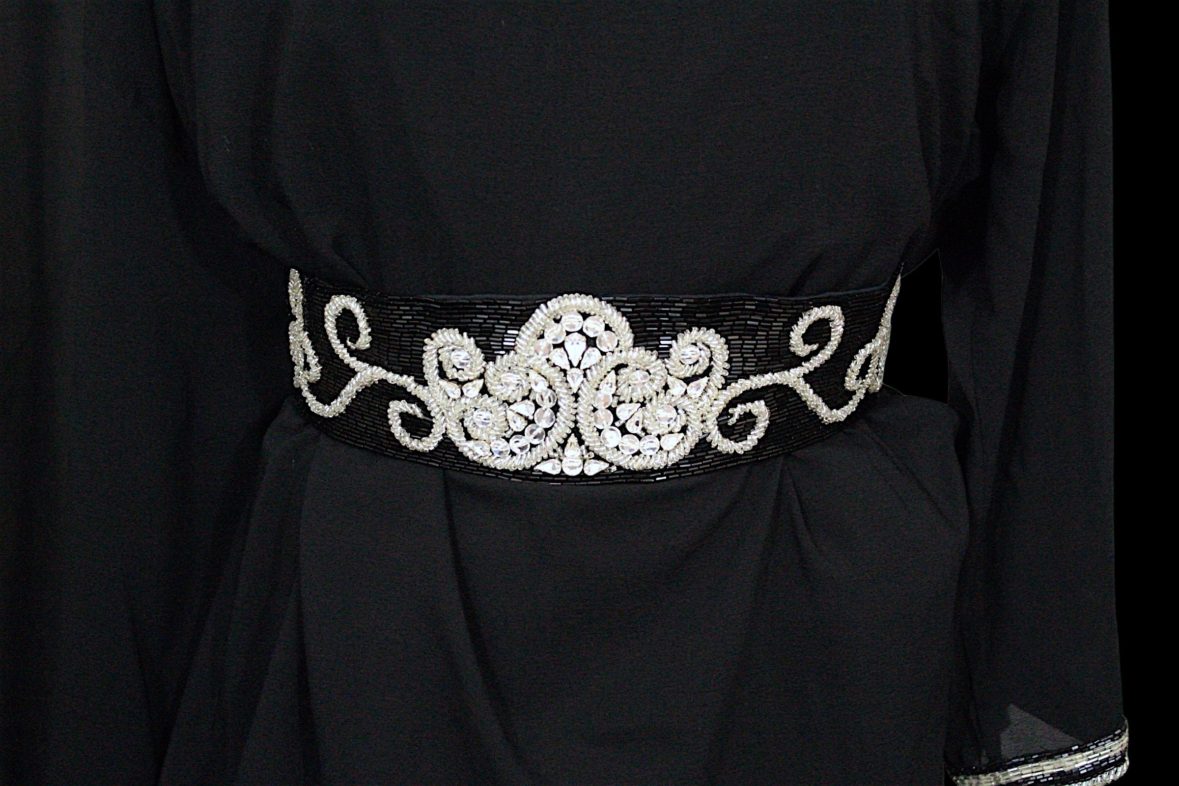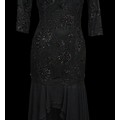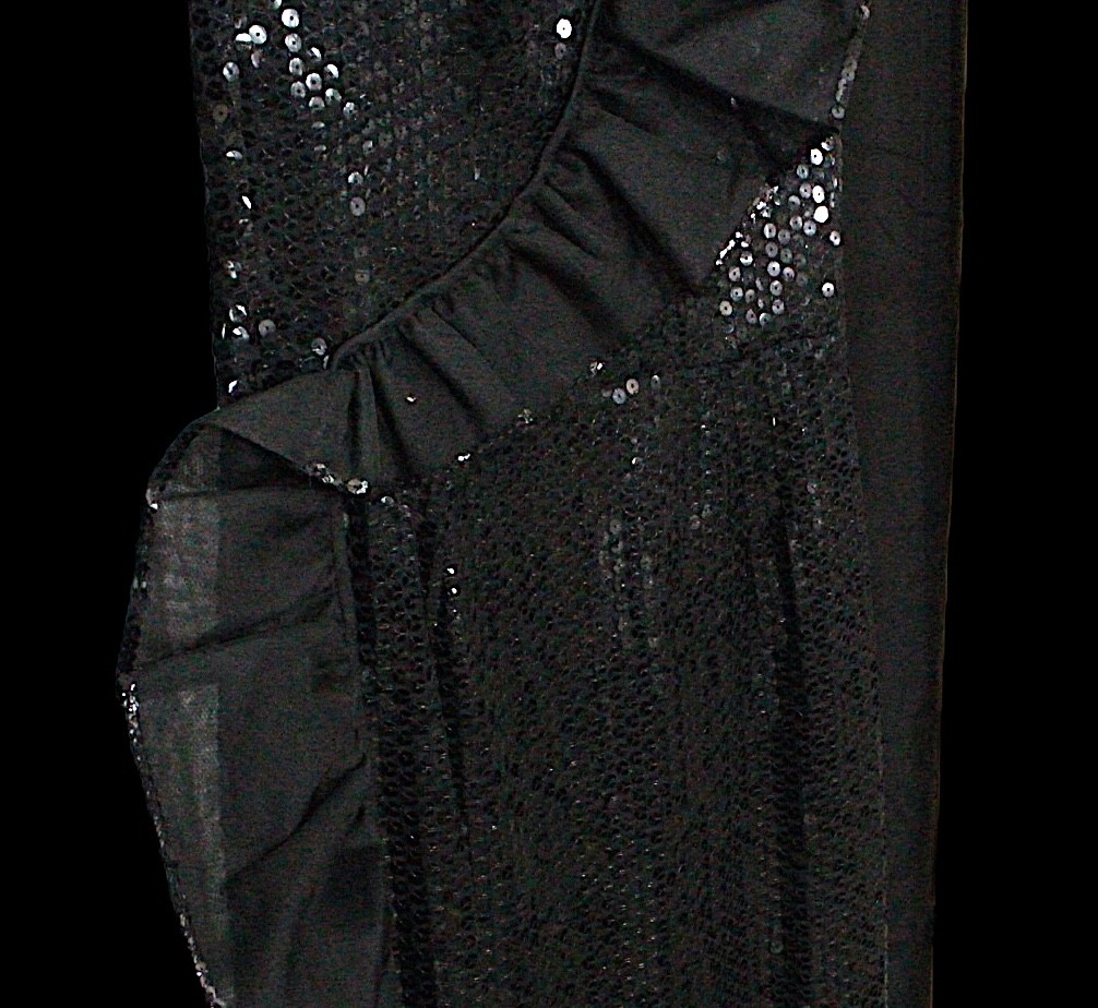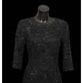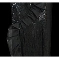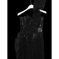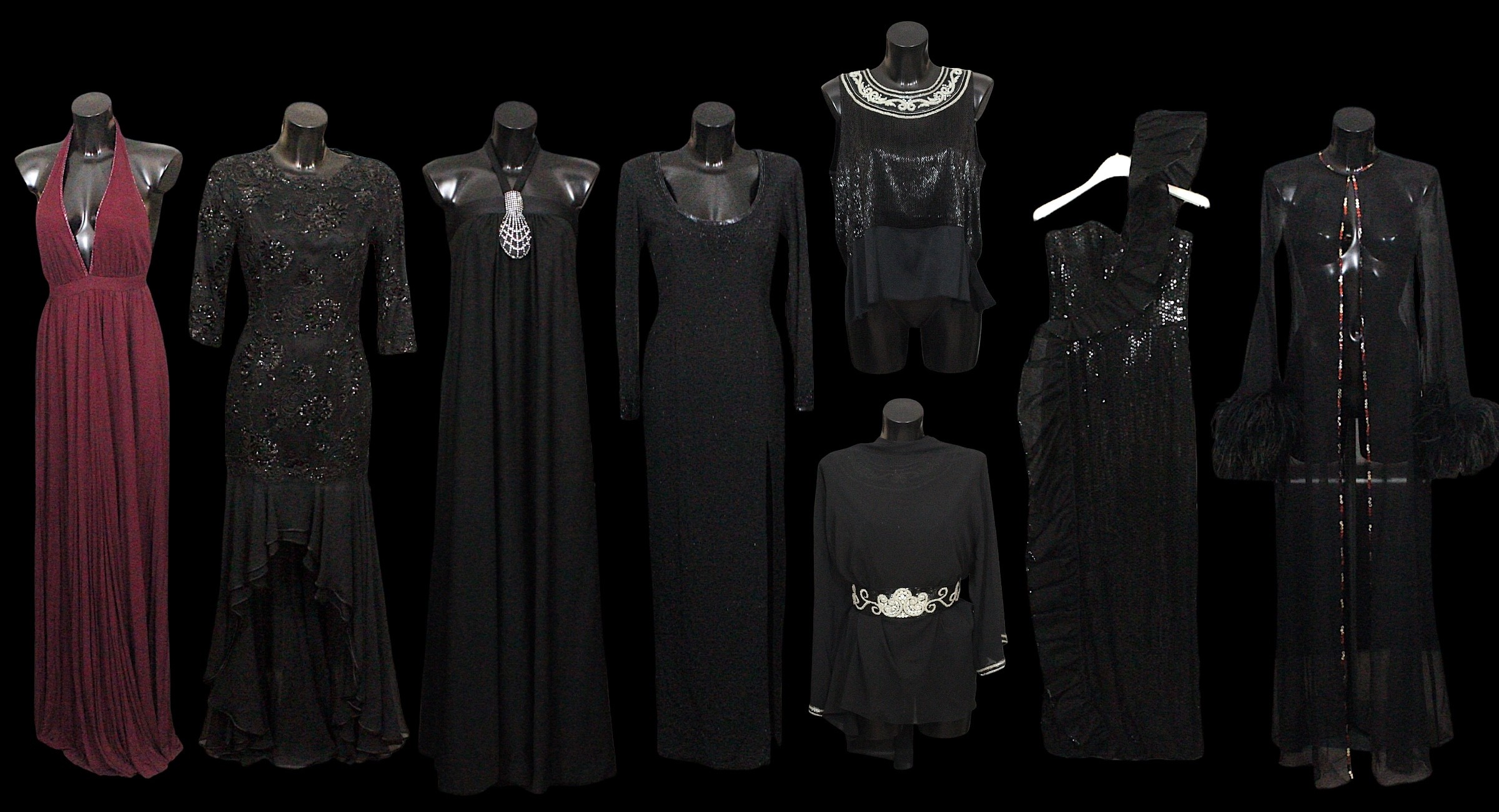 including: a burgundy maxi dress, halter neck with beaded trim, under bust 30cm flat measurement; a black sequin gown, strapless, full length with ruffle detail, waist flat 33cm approximately; a black full length gown, 3/4 length sleeves, chiffon type skirts embellished with black sequins, waist flat approximately 37cm; a black strapless maxi dress/ skirt, with rhinestone detailing to front; a sheer black evening coat, trimmed with multi coloured sequins and with feather cuffs; a black sleeveless top, embellished with black and silver beads, press stud front, together with a matching belt and sheer blouse with beaded cuffs; a full length gown, long sleeved, embellished with black beads, waist flat 36cm approximately (9)
