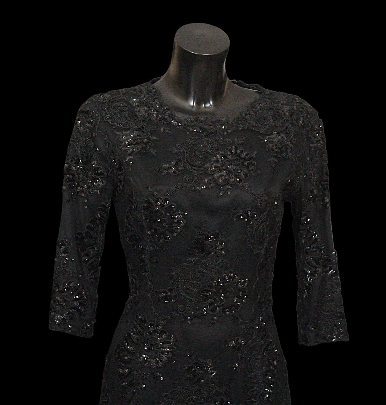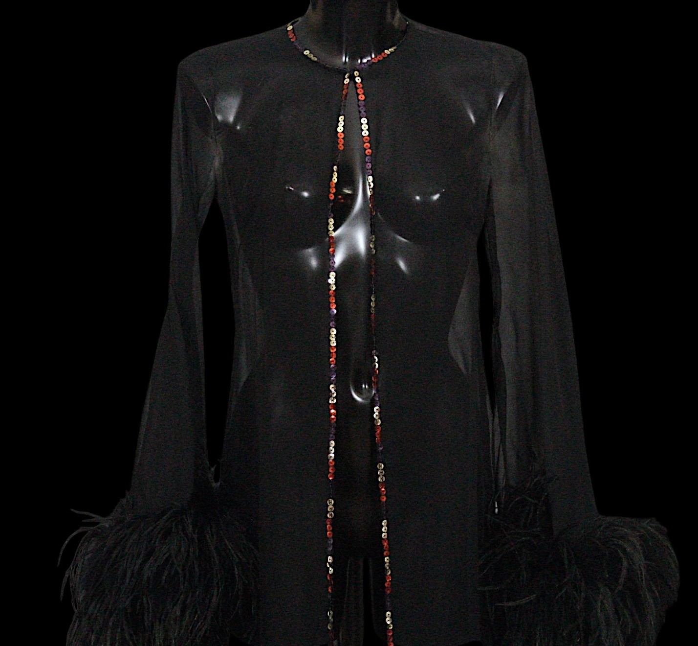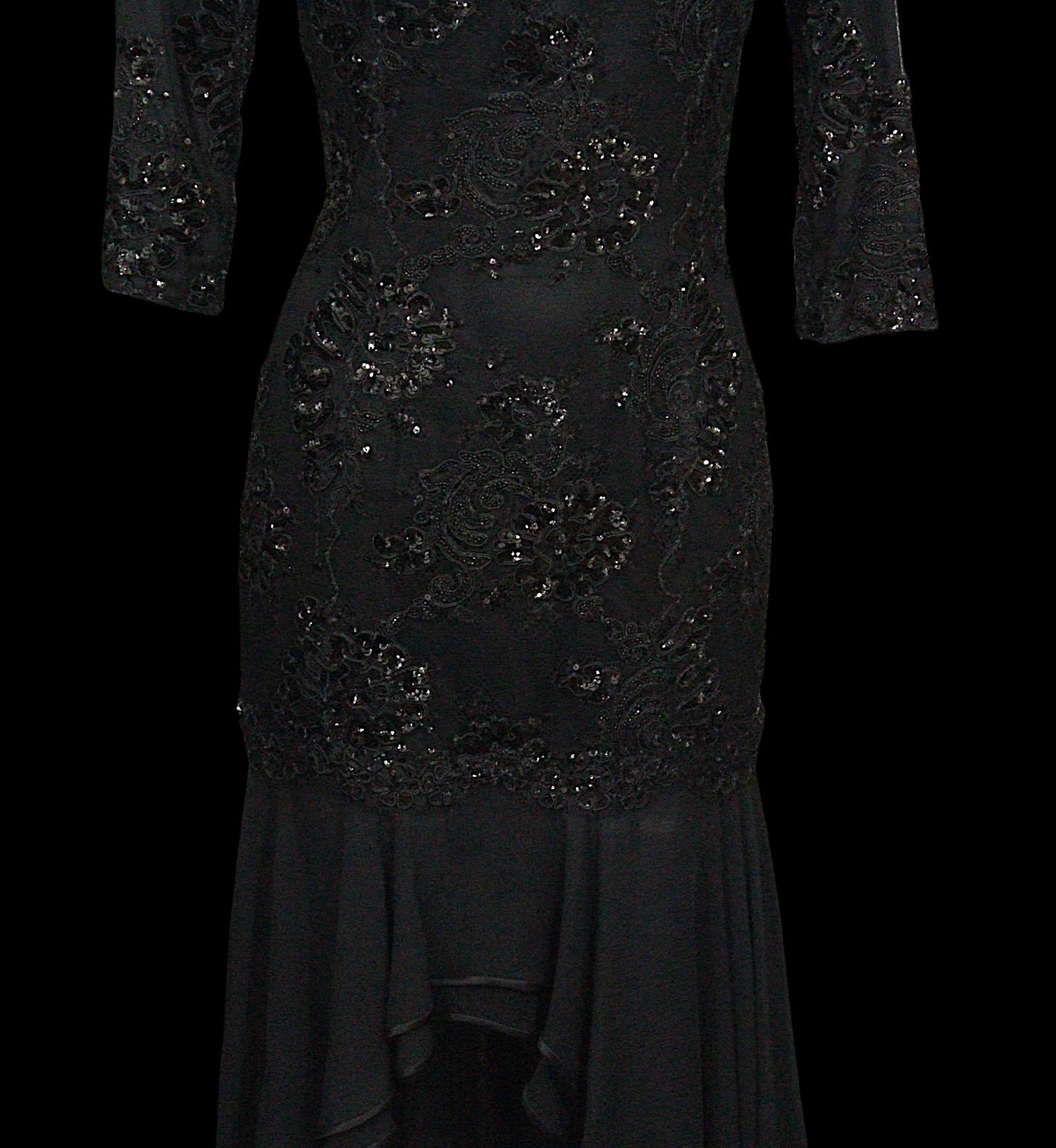 including: a burgundy maxi dress, halter neck with beaded trim, under bust 30cm flat measurement; a black sequin gown, strapless, full length with ruffle detail, waist flat 33cm approximately; a black full length gown, 3/4 length sleeves, chiffon type skirts embellished with black sequins, waist flat approximately 37cm; a black strapless maxi dress/ skirt, with rhinestone detailing to front; a sheer black evening coat, trimmed with multi coloured sequins and with feather cuffs; a black sleeveless top, embellished with black and silver beads, press stud front, together with a matching belt and sheer blouse with beaded cuffs; a full length gown, long sleeved, embellished with black beads, waist flat 36cm approximately (9)