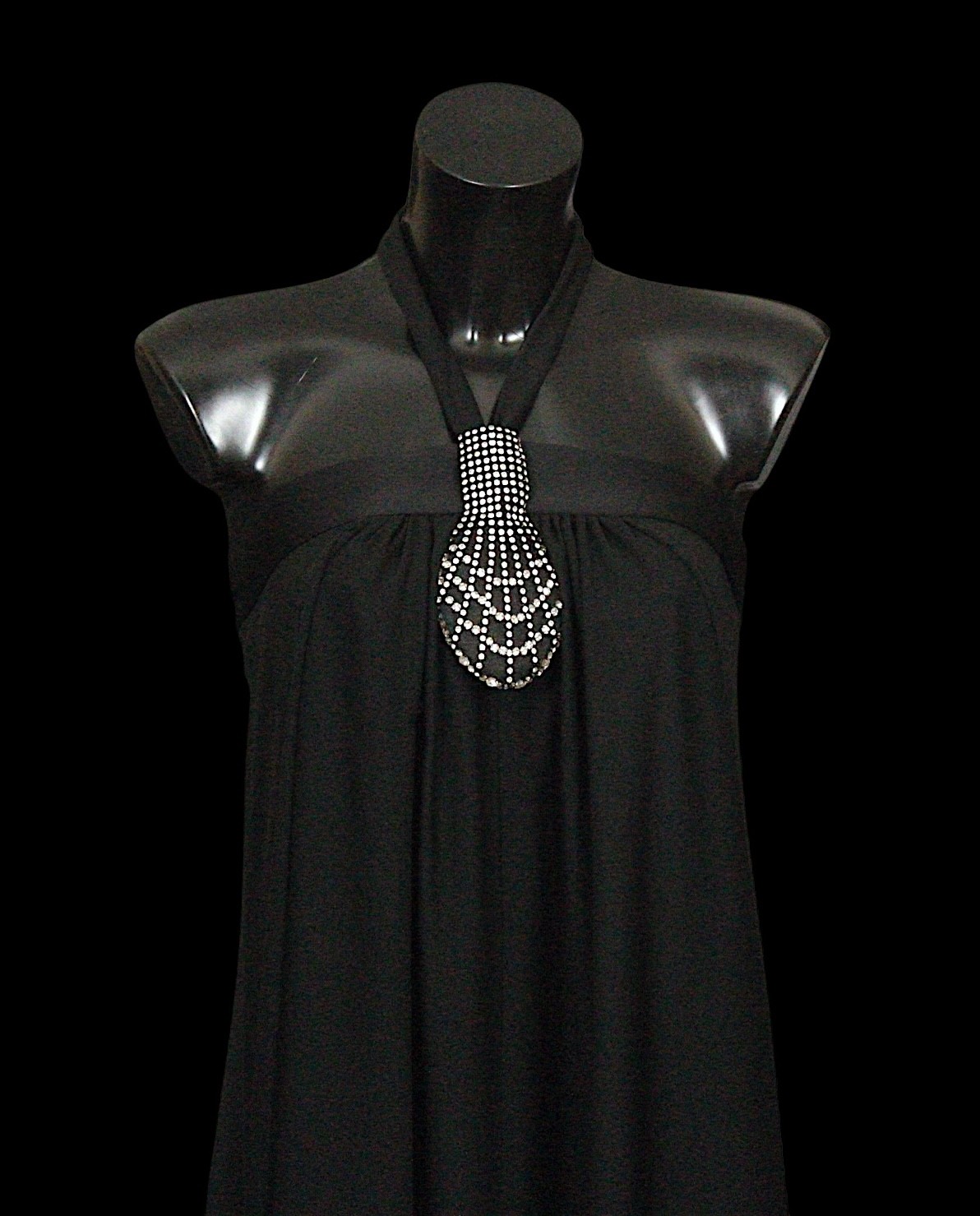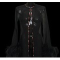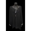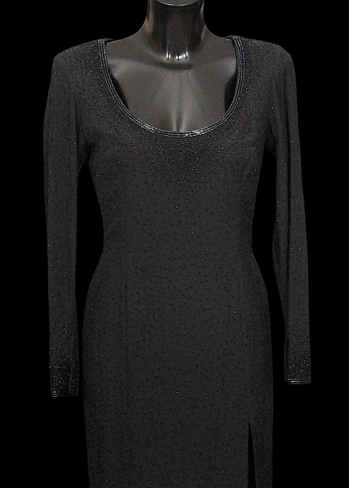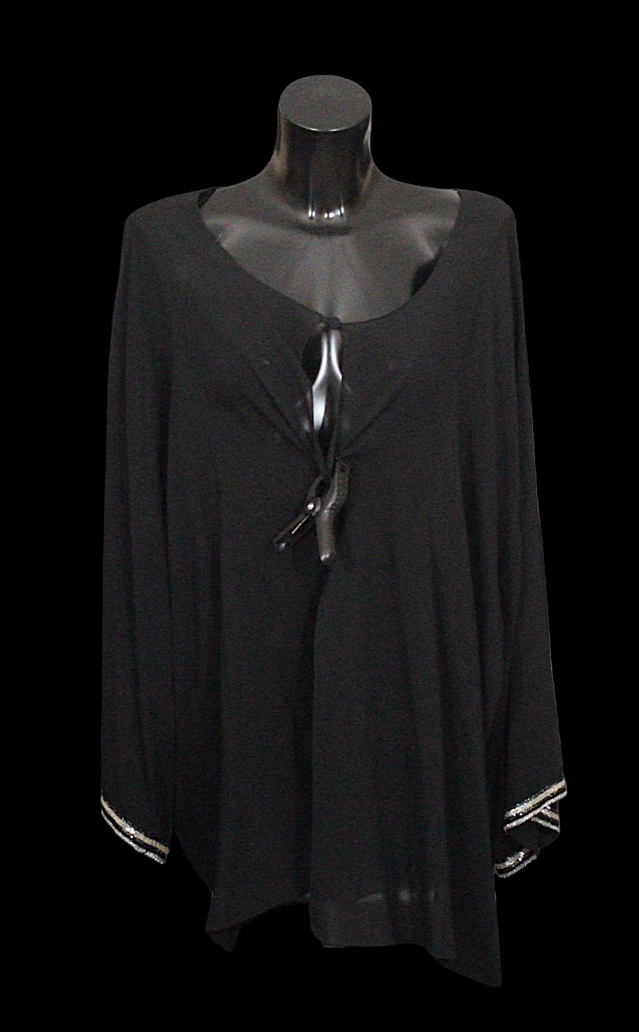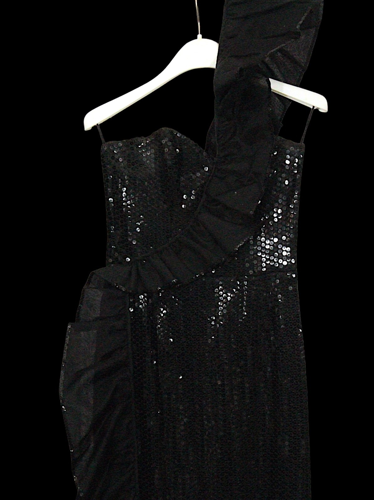 including: a burgundy maxi dress, halter neck with beaded trim, under bust 30cm flat measurement; a black sequin gown, strapless, full length with ruffle detail, waist flat 33cm approximately; a black full length gown, 3/4 length sleeves, chiffon type skirts embellished with black sequins, waist flat approximately 37cm; a black strapless maxi dress/ skirt, with rhinestone detailing to front; a sheer black evening coat, trimmed with multi coloured sequins and with feather cuffs; a black sleeveless top, embellished with black and silver beads, press stud front, together with a matching belt and sheer blouse with beaded cuffs; a full length gown, long sleeved, embellished with black beads, waist flat 36cm approximately (9)