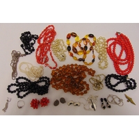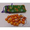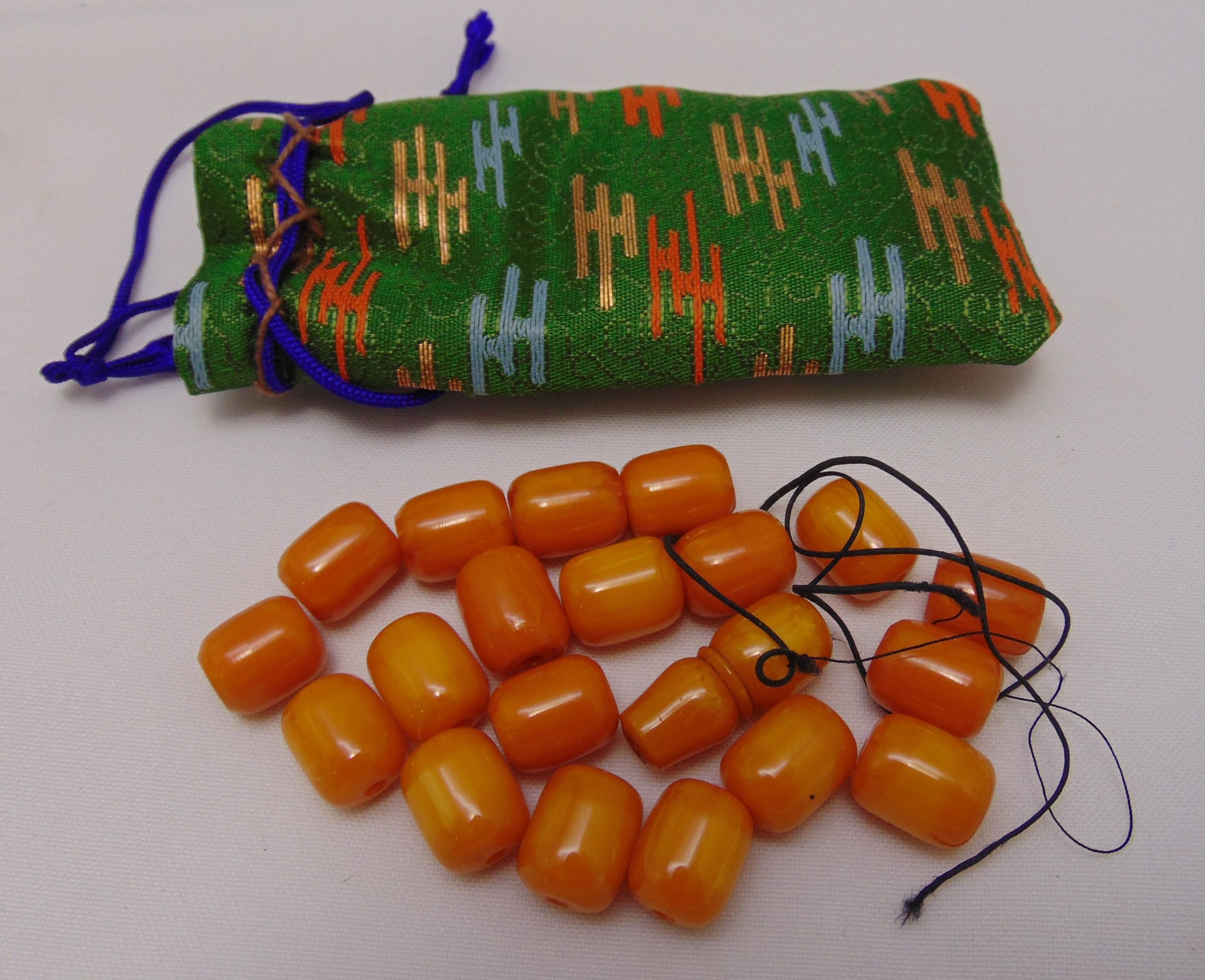 A quantity of loose butterscotch amber beads in green silk pouch