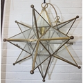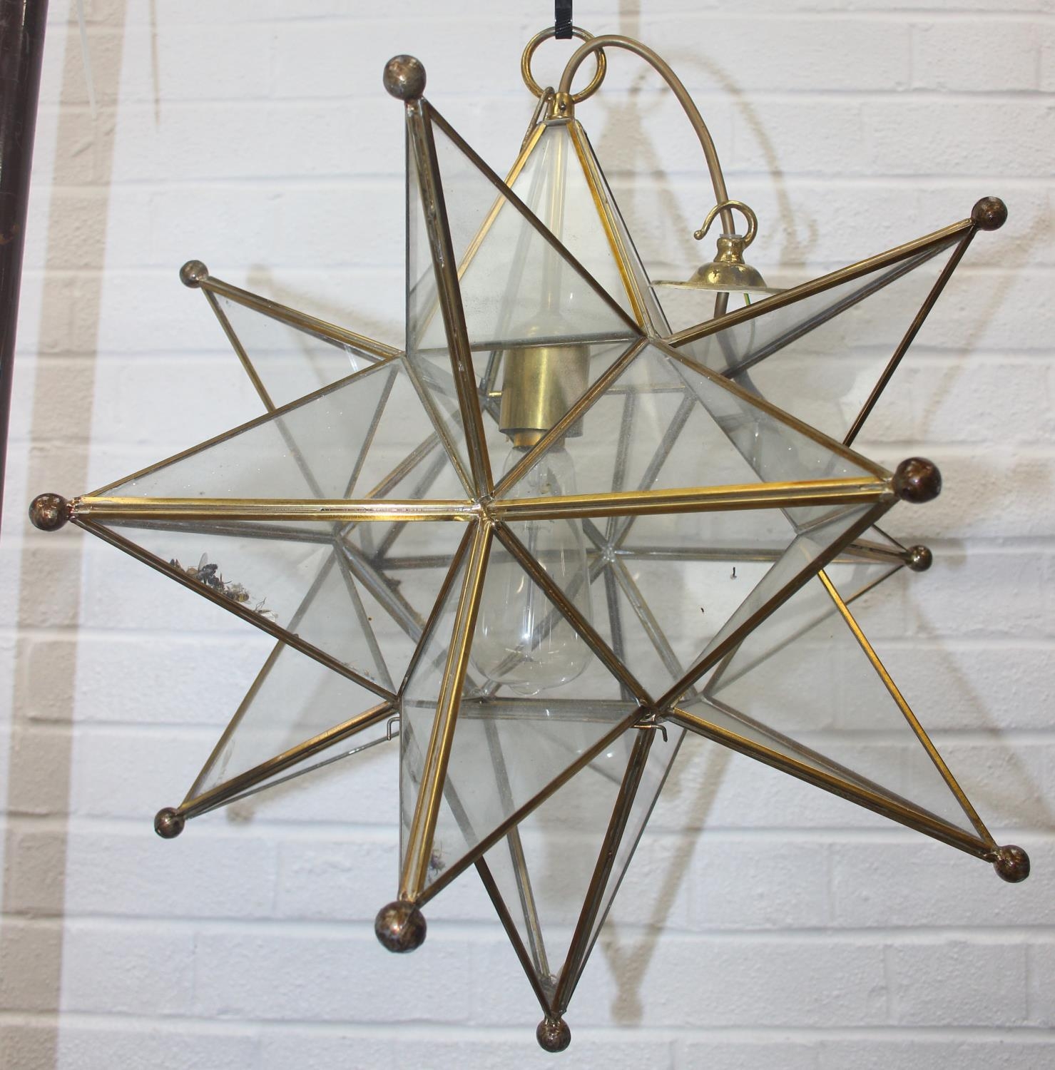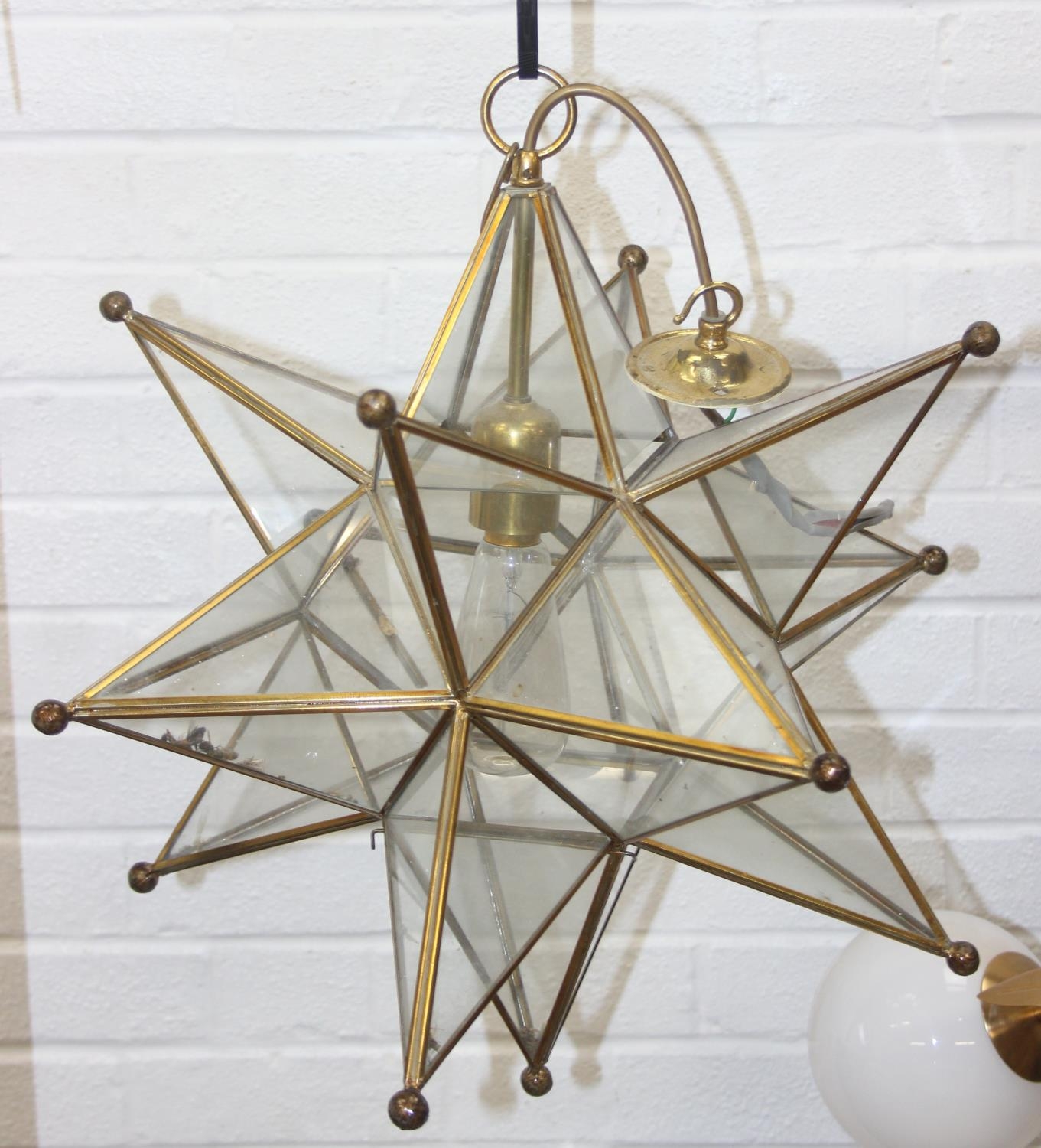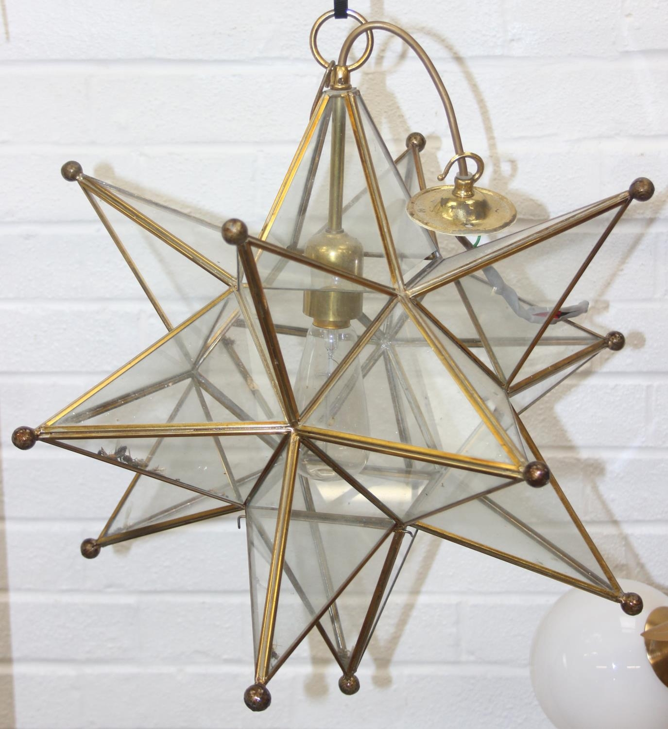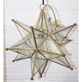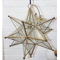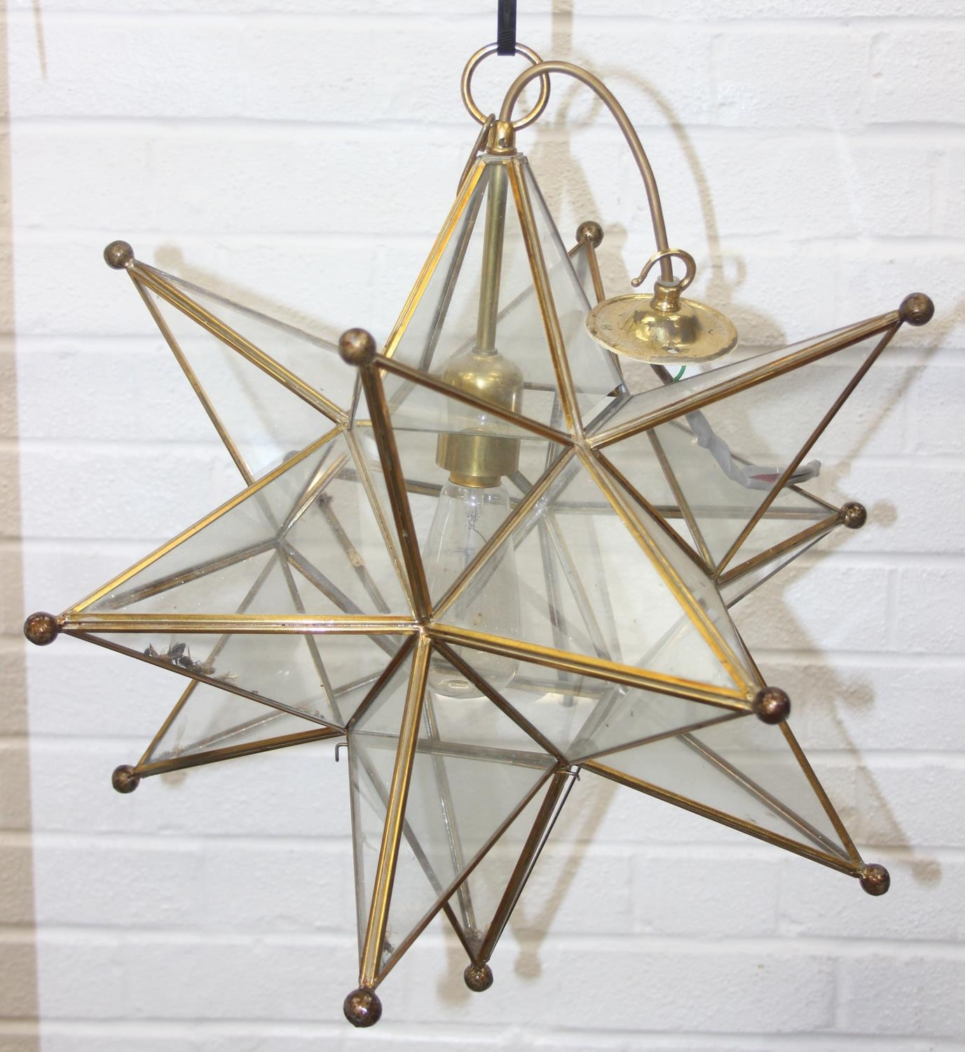 Vintage brass and glass dodecahedron star shaped ceiling pendant with ball finials to points, 50cm