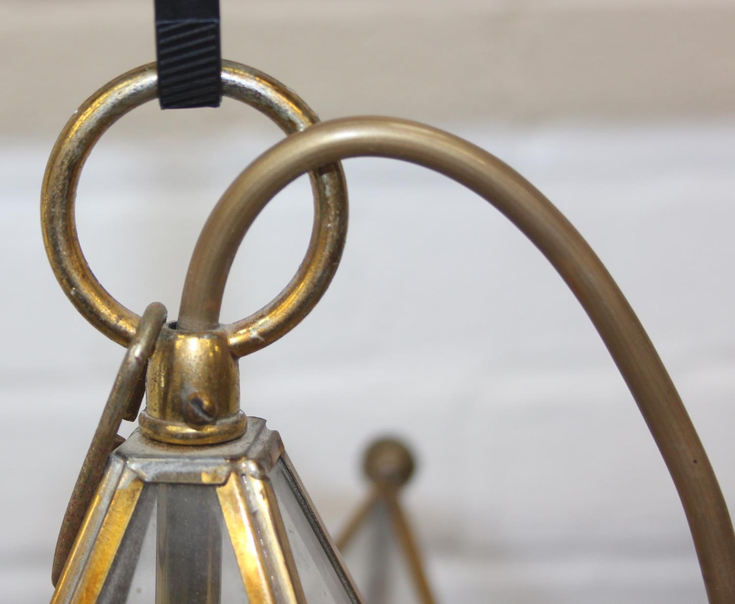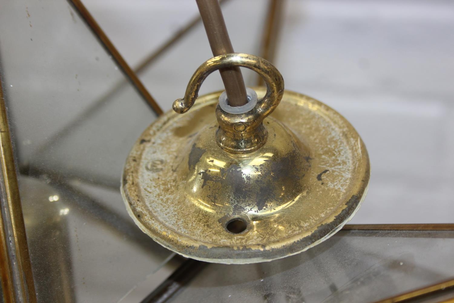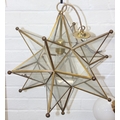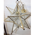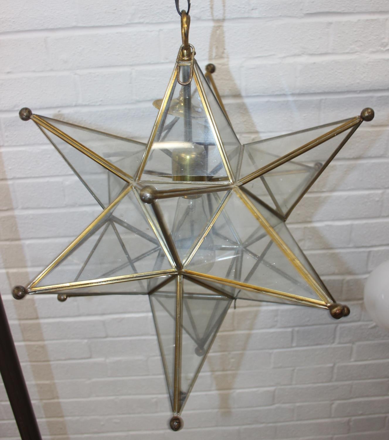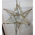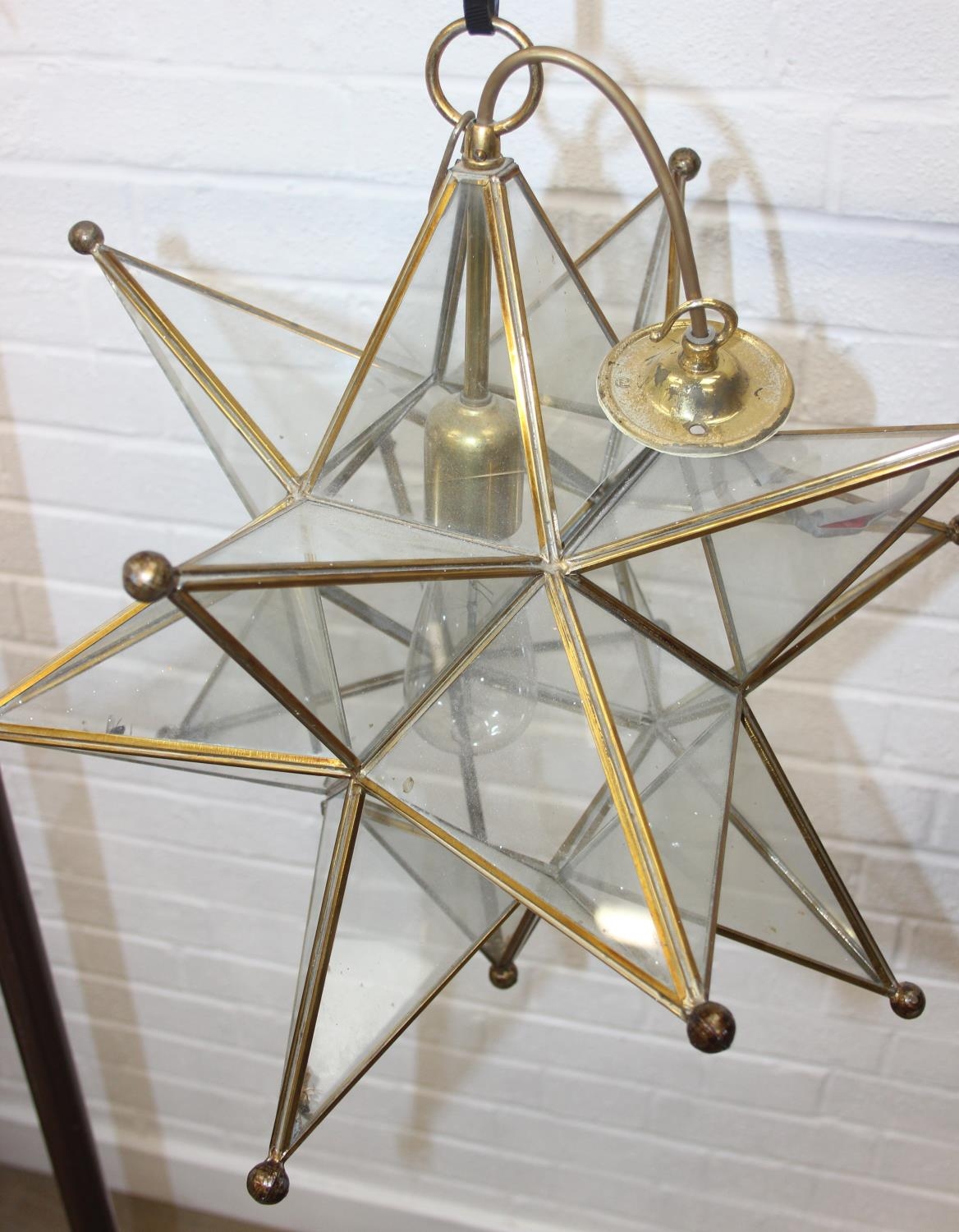 Vintage brass and glass dodecahedron star shaped ceiling pendant with ball finials to points, 50cm