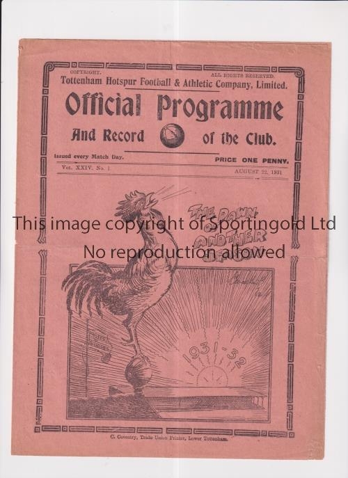 TOTTENHAM HOTSPUR Programme for the Practice Match 22/8/1931, slightly creased and slight split at the top of the spine. Fair to generally good