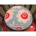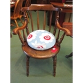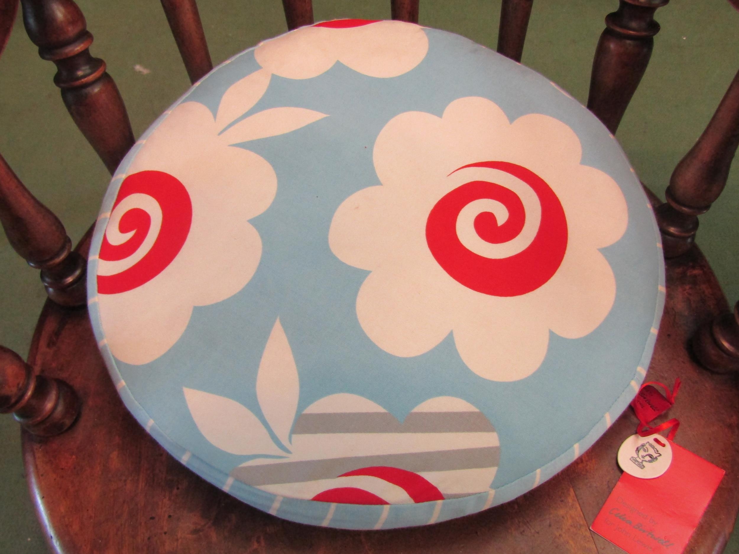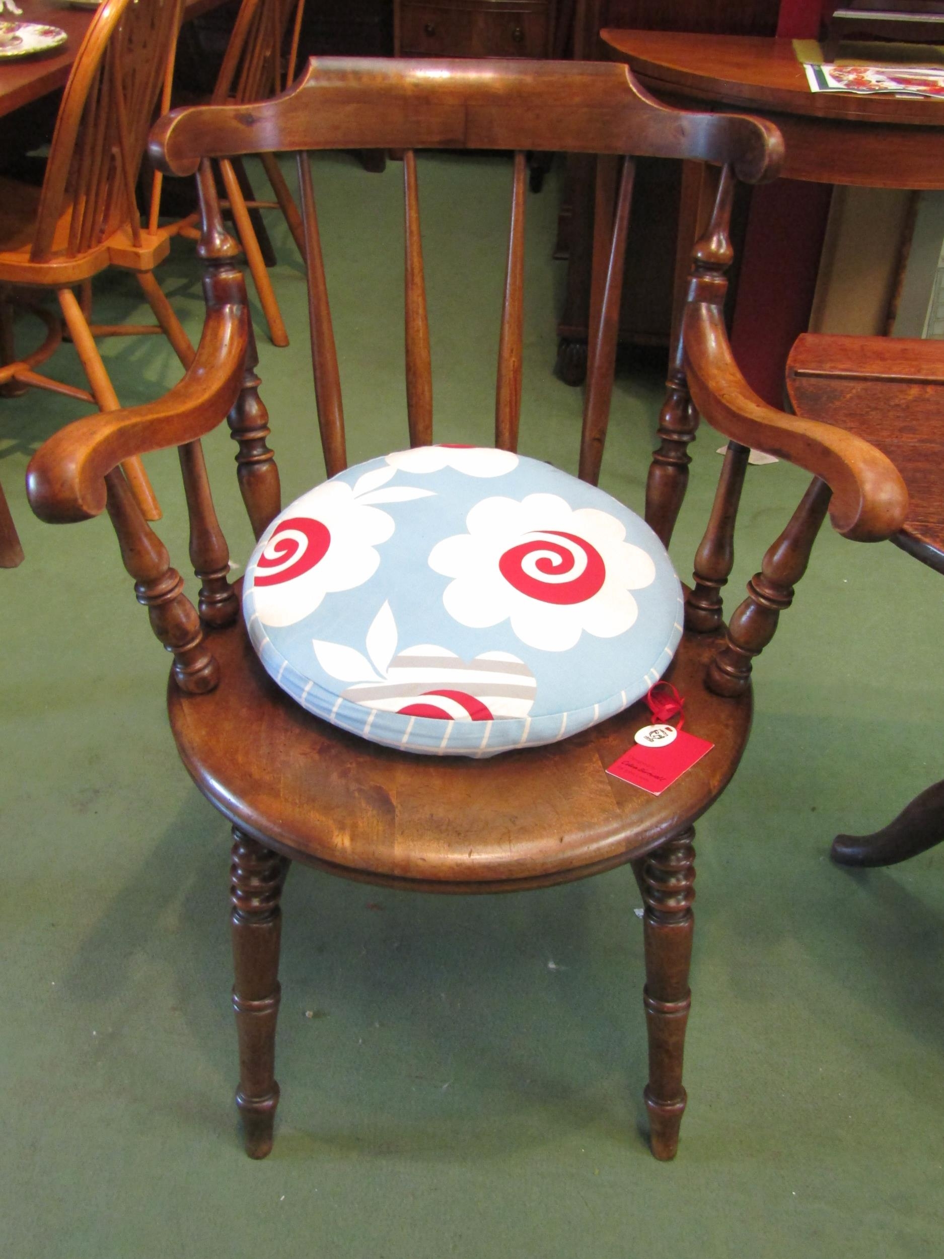 A Victorian beech penny seat open armchair the stick back rest and scroll arms over a round seat on turned and tapering legs, united by an "H" stretcher (with a "Celia Birtwell" circular cushion)