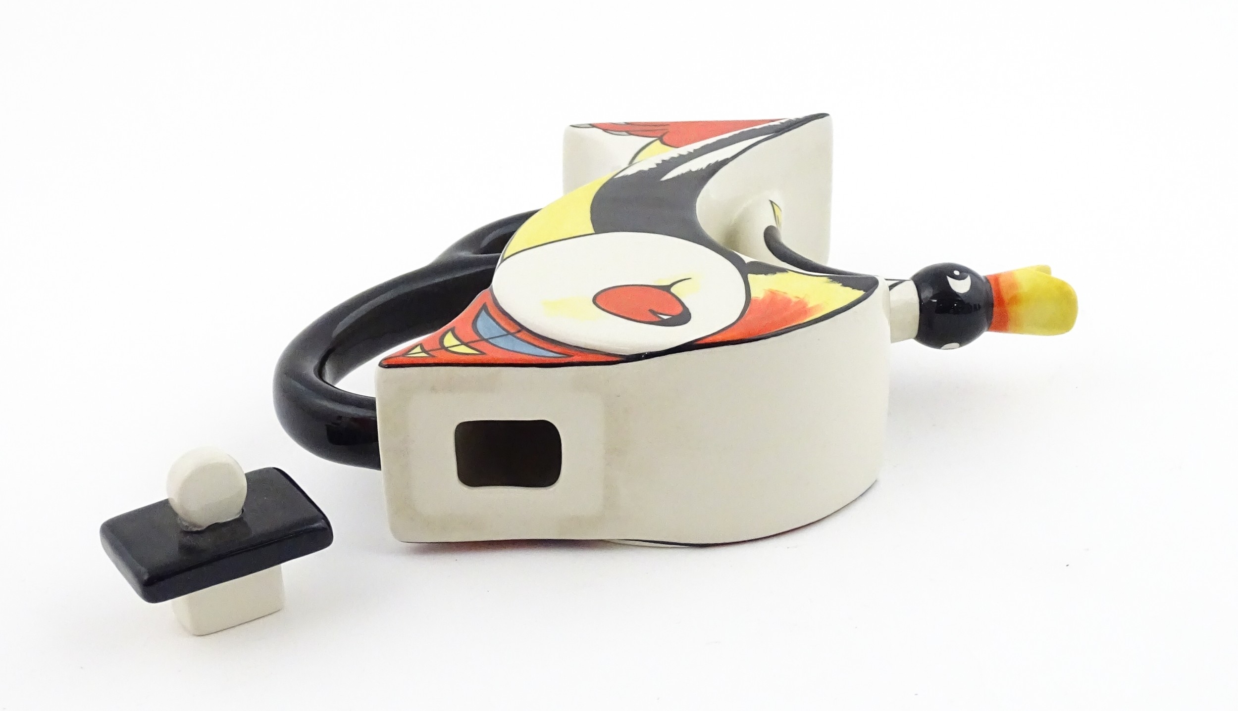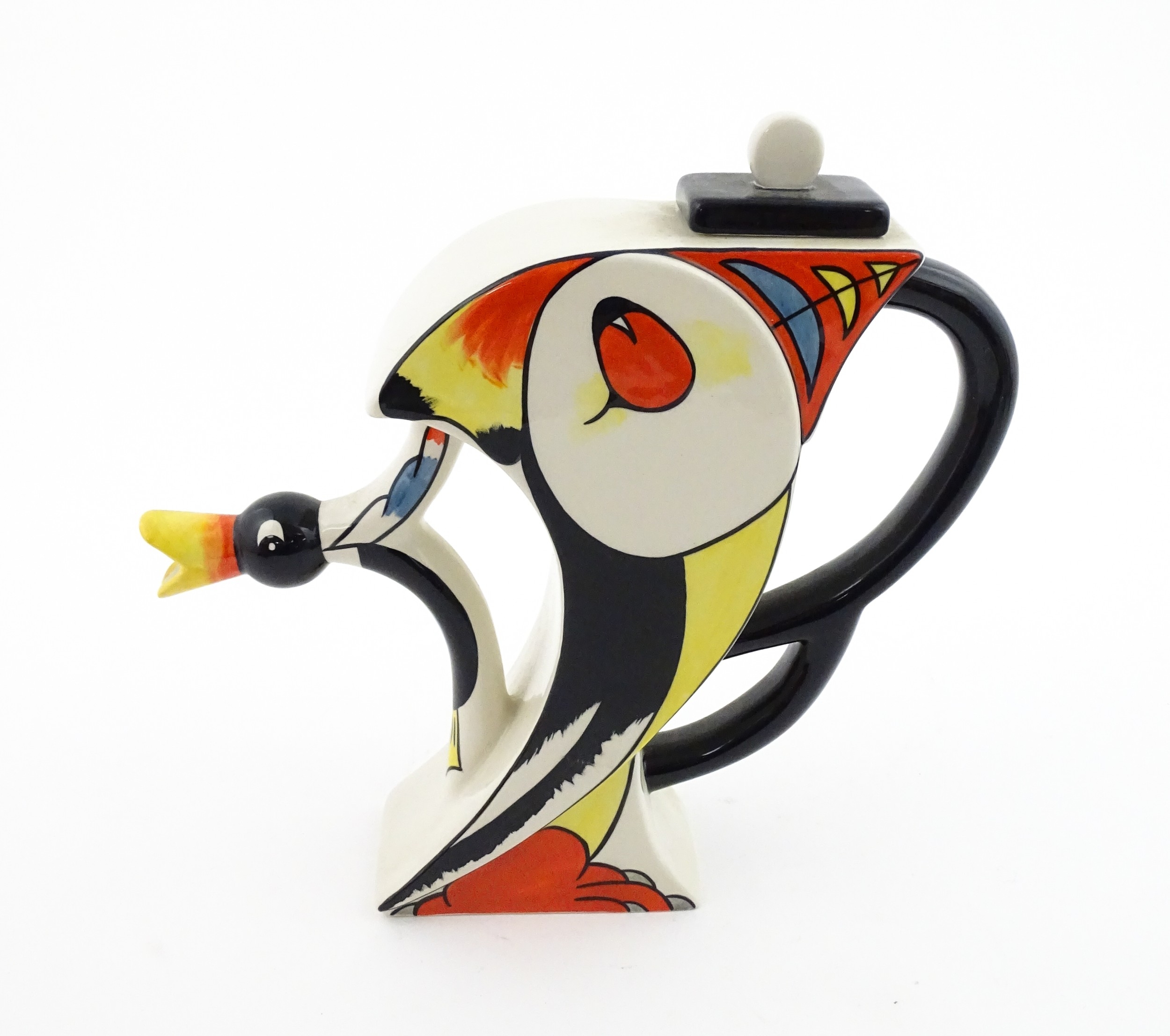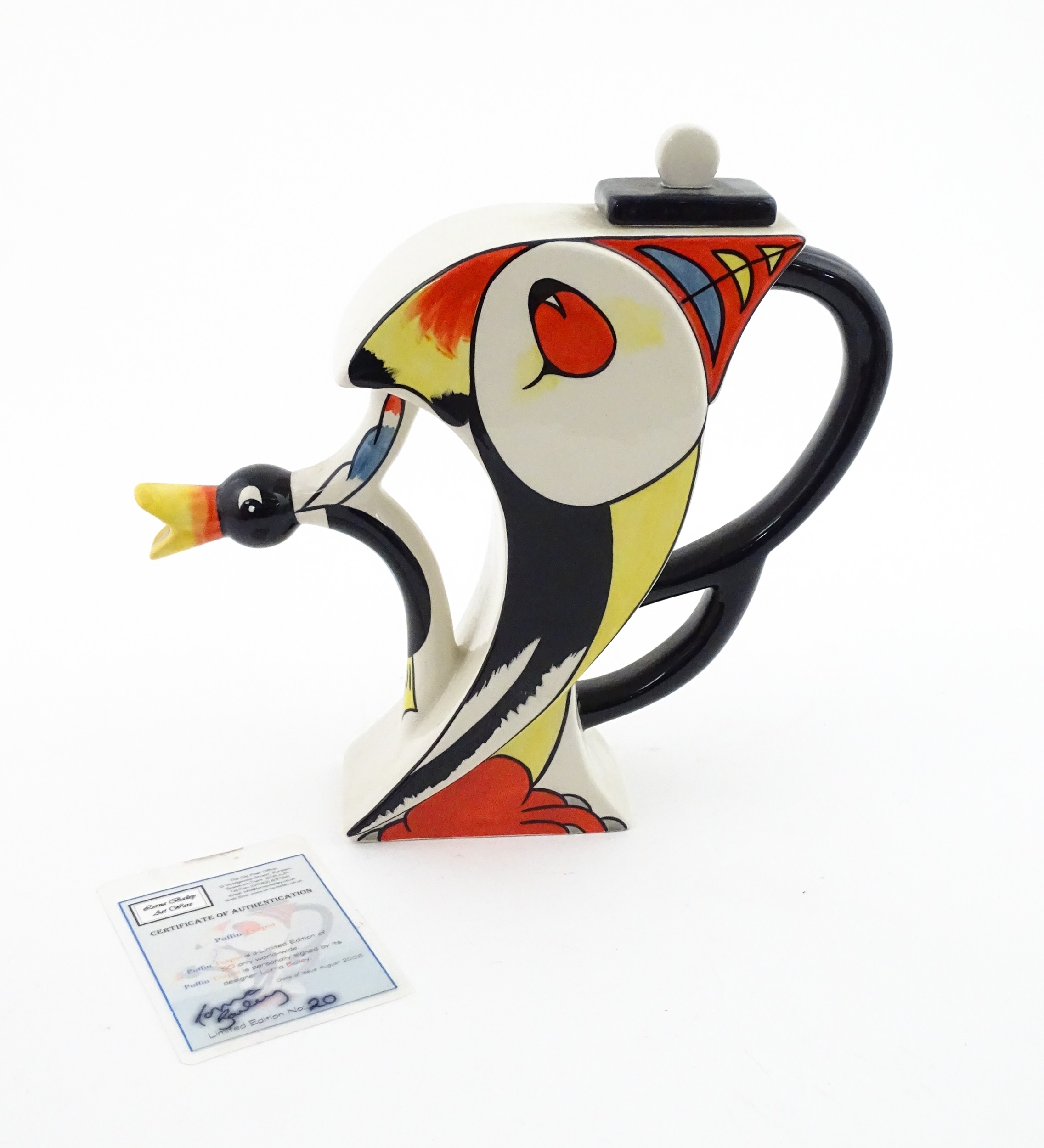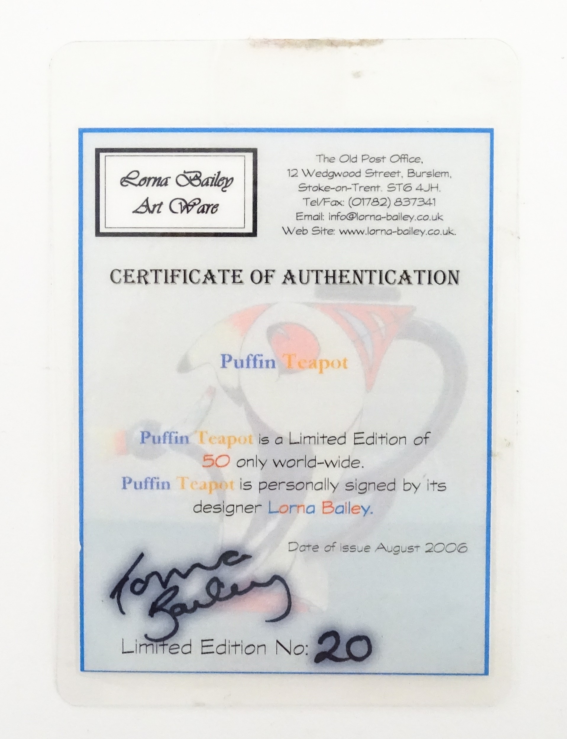 A Lorna Bailey limited edition Puffin teapot. Marked and signed under, and numbered 20 / 50. With certificate of authentication. Approx. 8 3/4" high