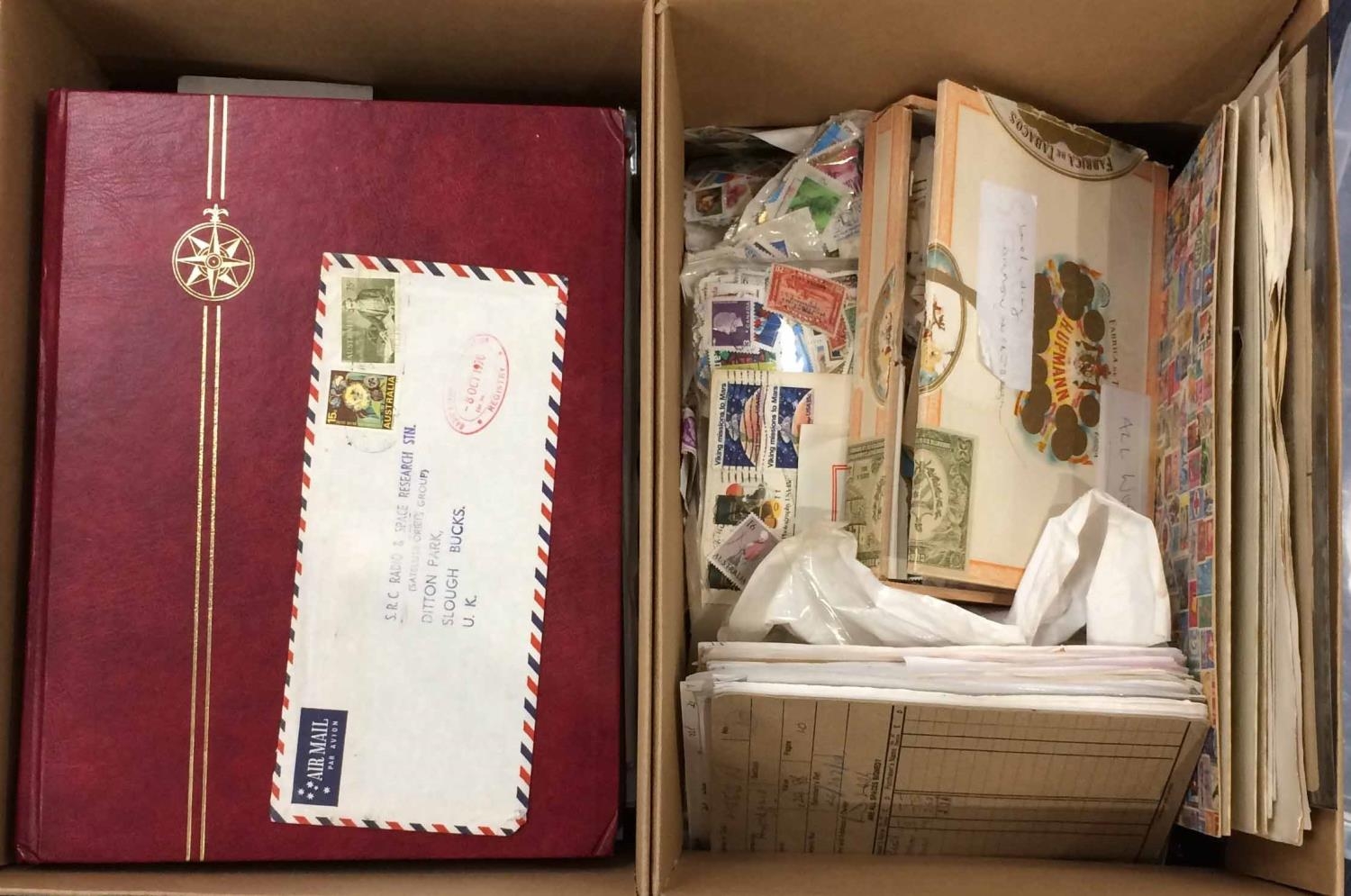 AUSTRALIA & WORLD MIXTURE IN TWO CARTONS - Australia with duplicated mostly used range in three stockbooks inc. some useful roos to 2/- & KGV heads, £1 robes and £2 arms, and loose in bags etc. plus FDCs group (c300, 1984-2005) and a few c1970 commercial covers mostly to UK inc. Oct. 1970 triple rate env. with 75c navigator & 15c flower. The world mixture with group (c120) of world commercial covers all c1970, and loose in bags etc. (Qty.) Cross Reference: AUSTRALIA, FIRST DAY COVERS