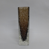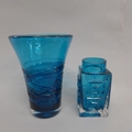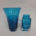 Two Whitefriars glass vases; a Greek key vase no.9815 and a flared vase with random strapping, both designed by Geoffrey Baxter circa 1972 in kingfisher blue, tallest 16cm
