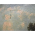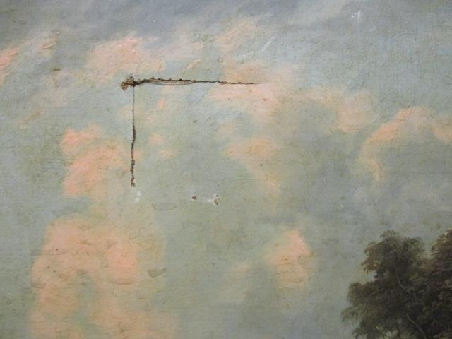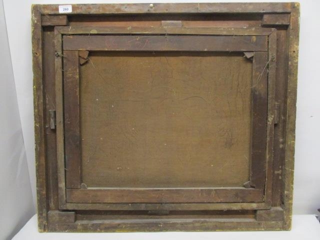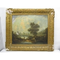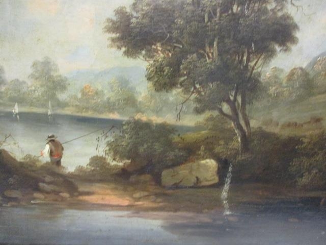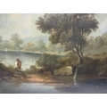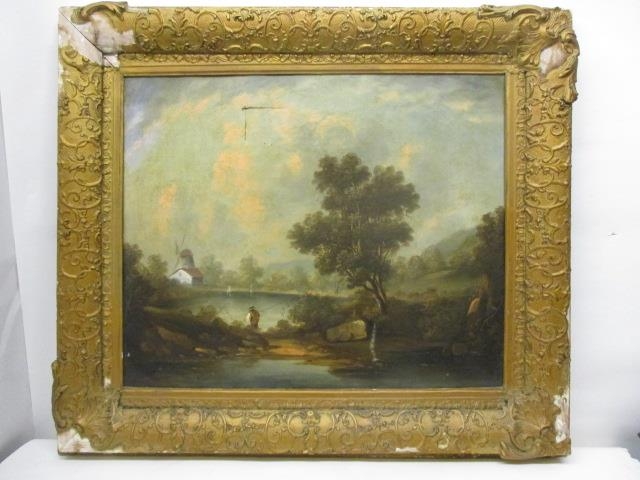 Mid 19th Century School - a rural scene with a fisherman, boats, a windmill, a building and hills beyond, oil on canvas, 20" x 25", in a gilt frame