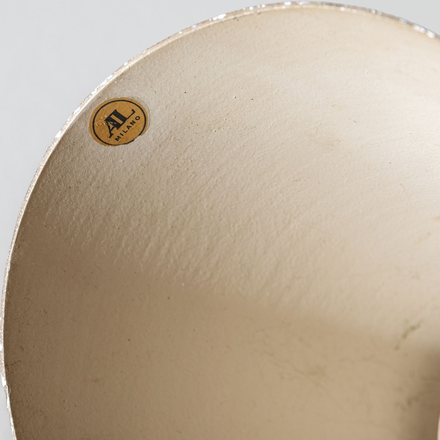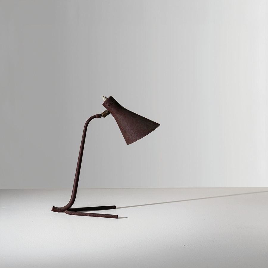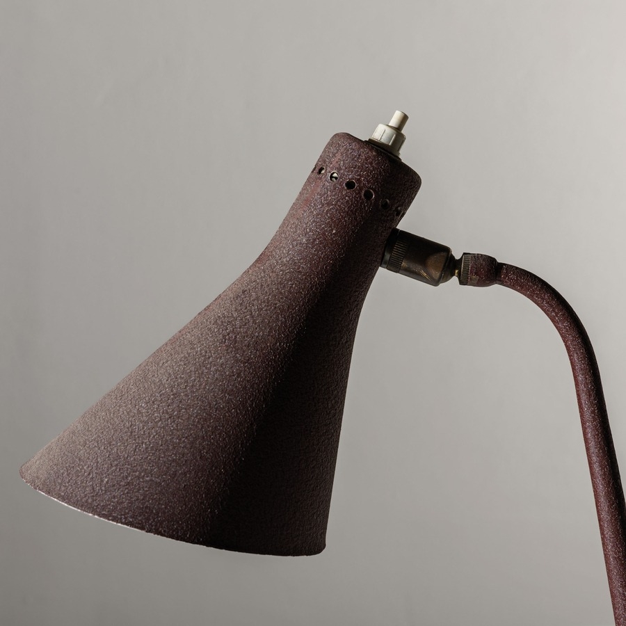 Lampada da tavolo. Metallo goffrato, alluminio verniciato. Produzione Arteluce, anni '40. Decalcomania del produttore.