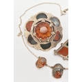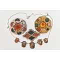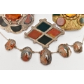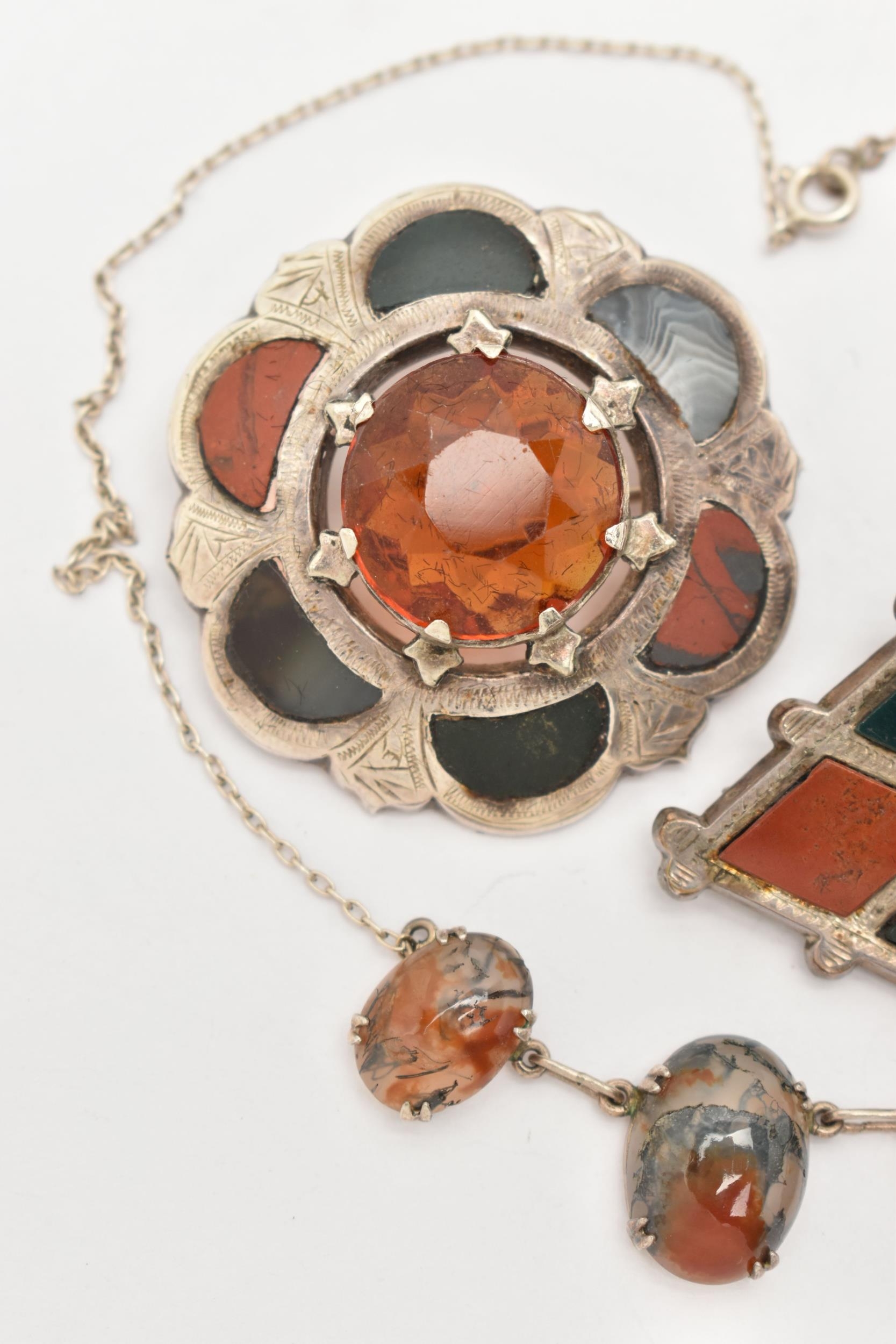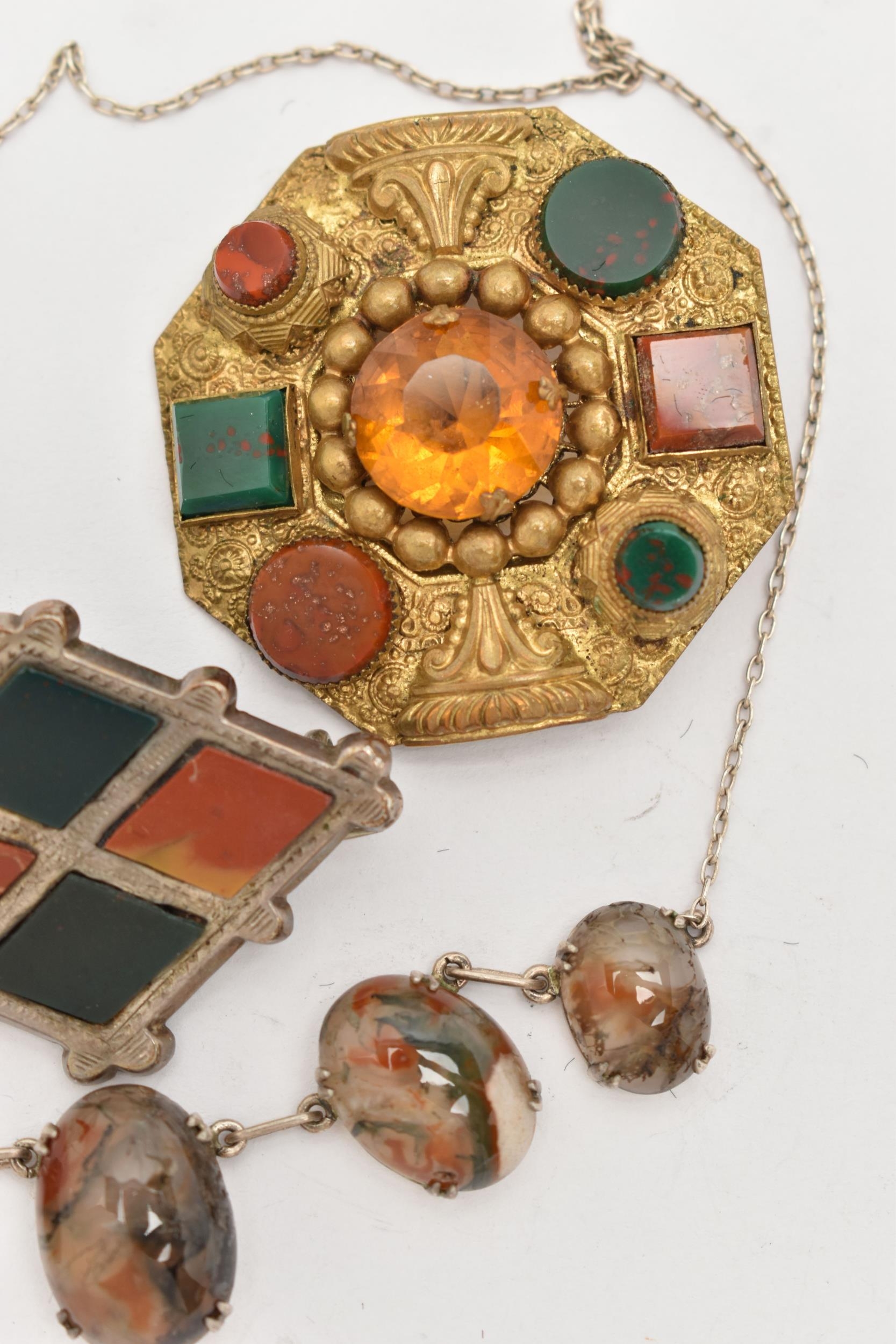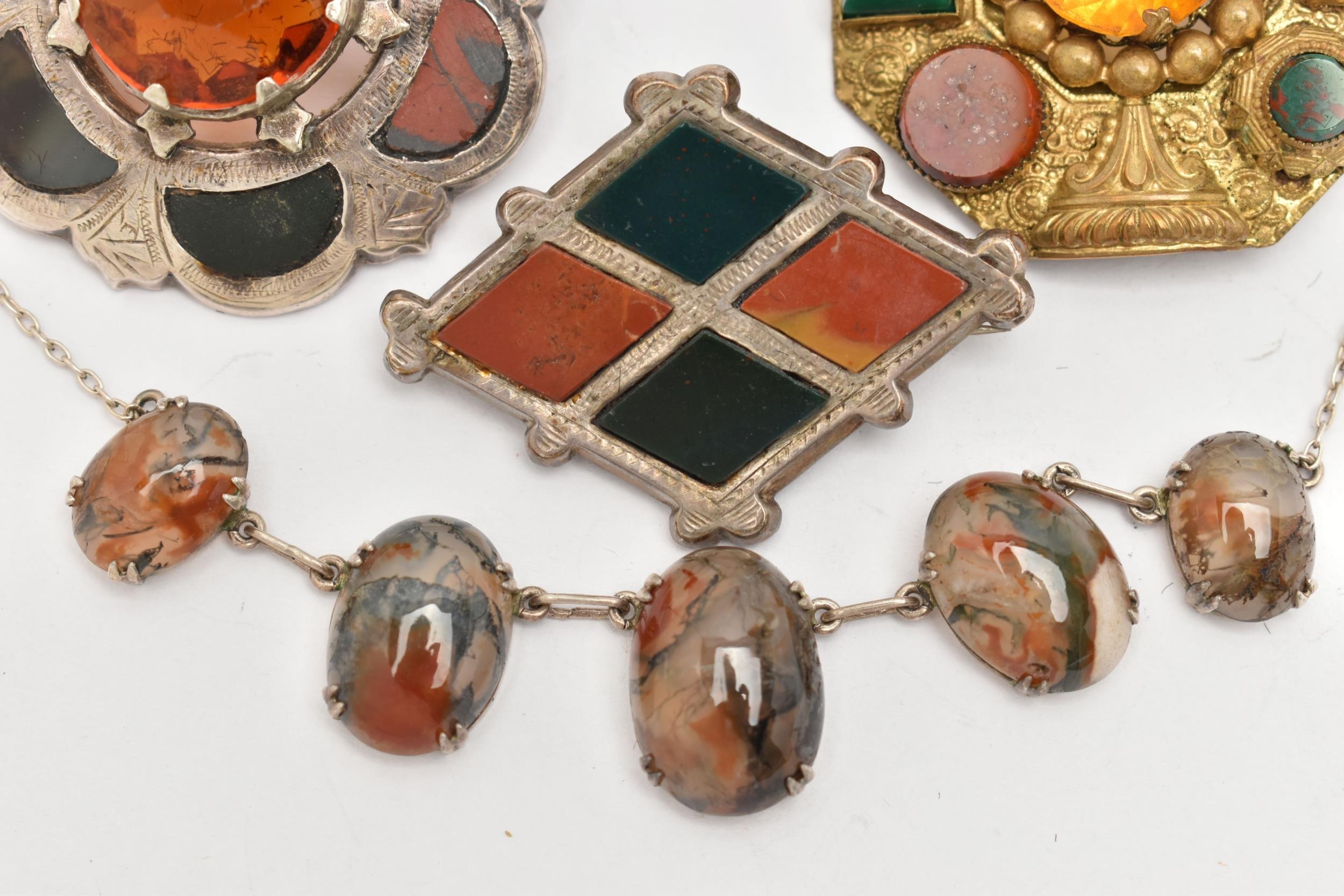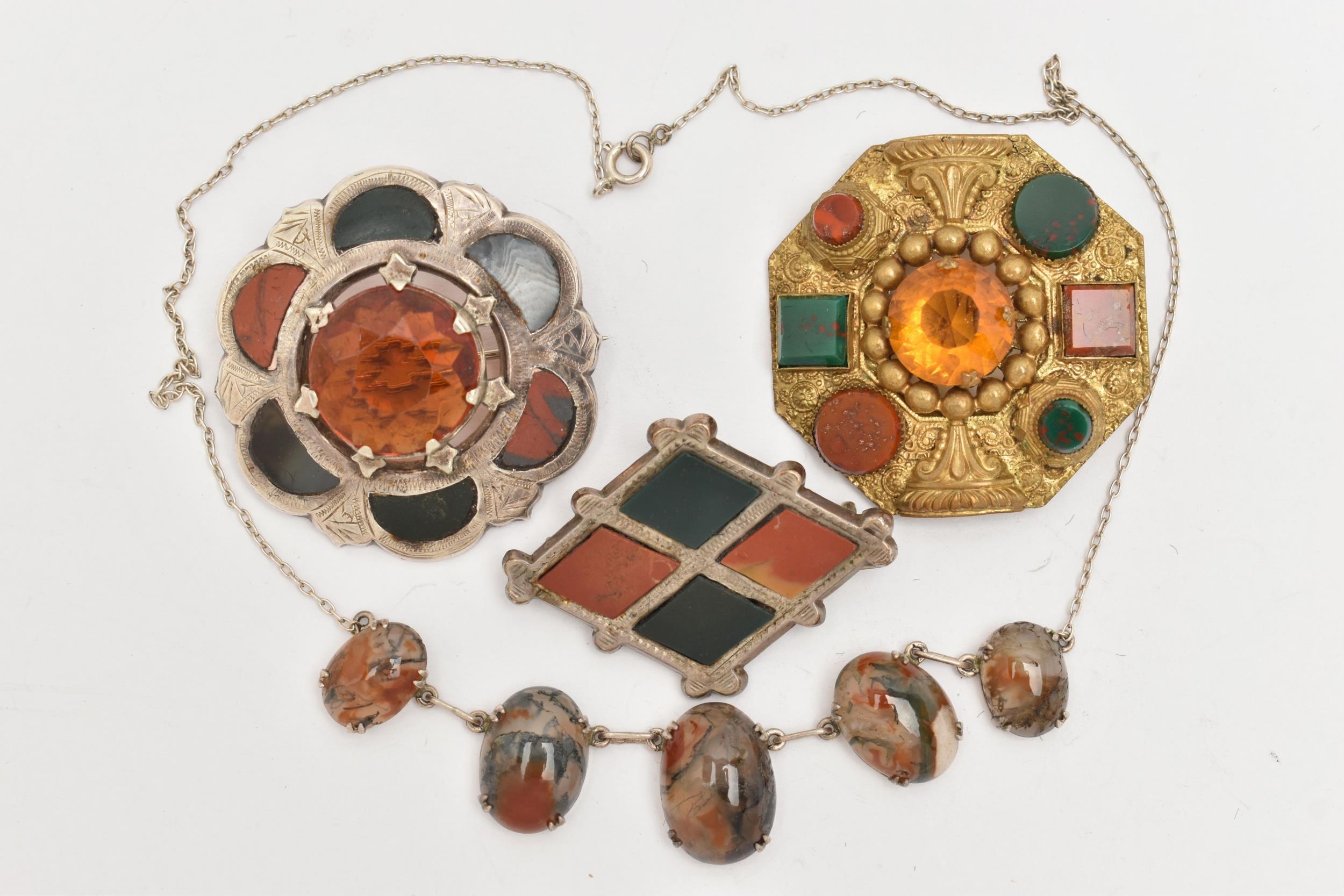 FOUR ITEMS OF JEWELLERY, to include a Scottish white metal hardstone and orange paste set brooch, fitted with a brooch pin and C clasp, stamped 'Sterling', another white metal diamond shape brooch set with hardstone, fitted with a brooch pin and C clasp, unmarked, a gilt metal brooch set with hardstone and orange paste, unmarked, together with a moss agate cabochon necklace, fitted with a fine trace chain and spring clasp, rubbed mark to the chain, length 380mm