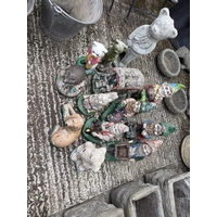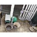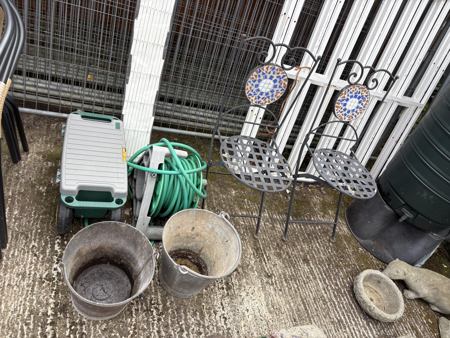 Two galvanised buckets, two folding chairs, hose on reel and work trolley