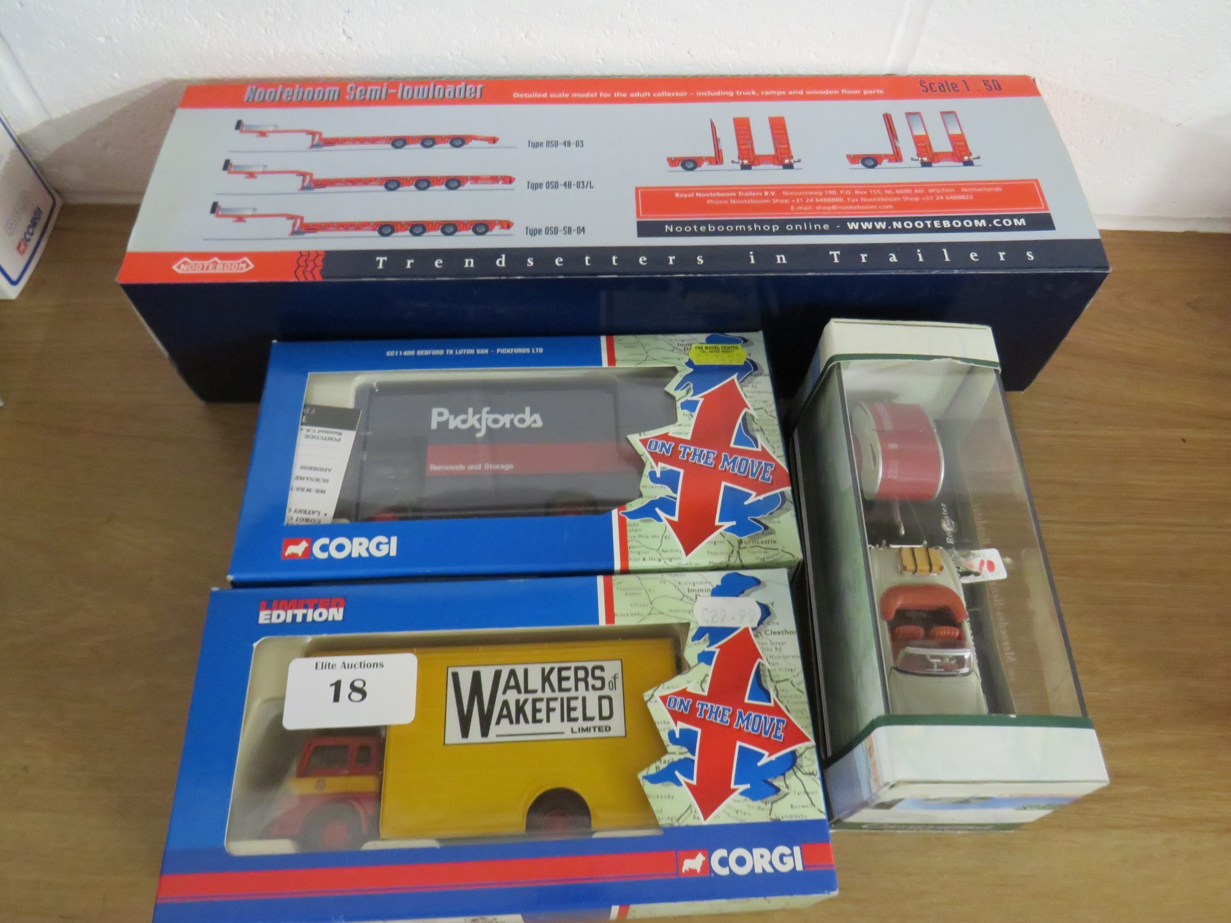 Four boxed model diecast to include two Corgi on the move, Cararama and Noteboom semi-lowloader - also inlcudes Walkers of Wakefield