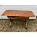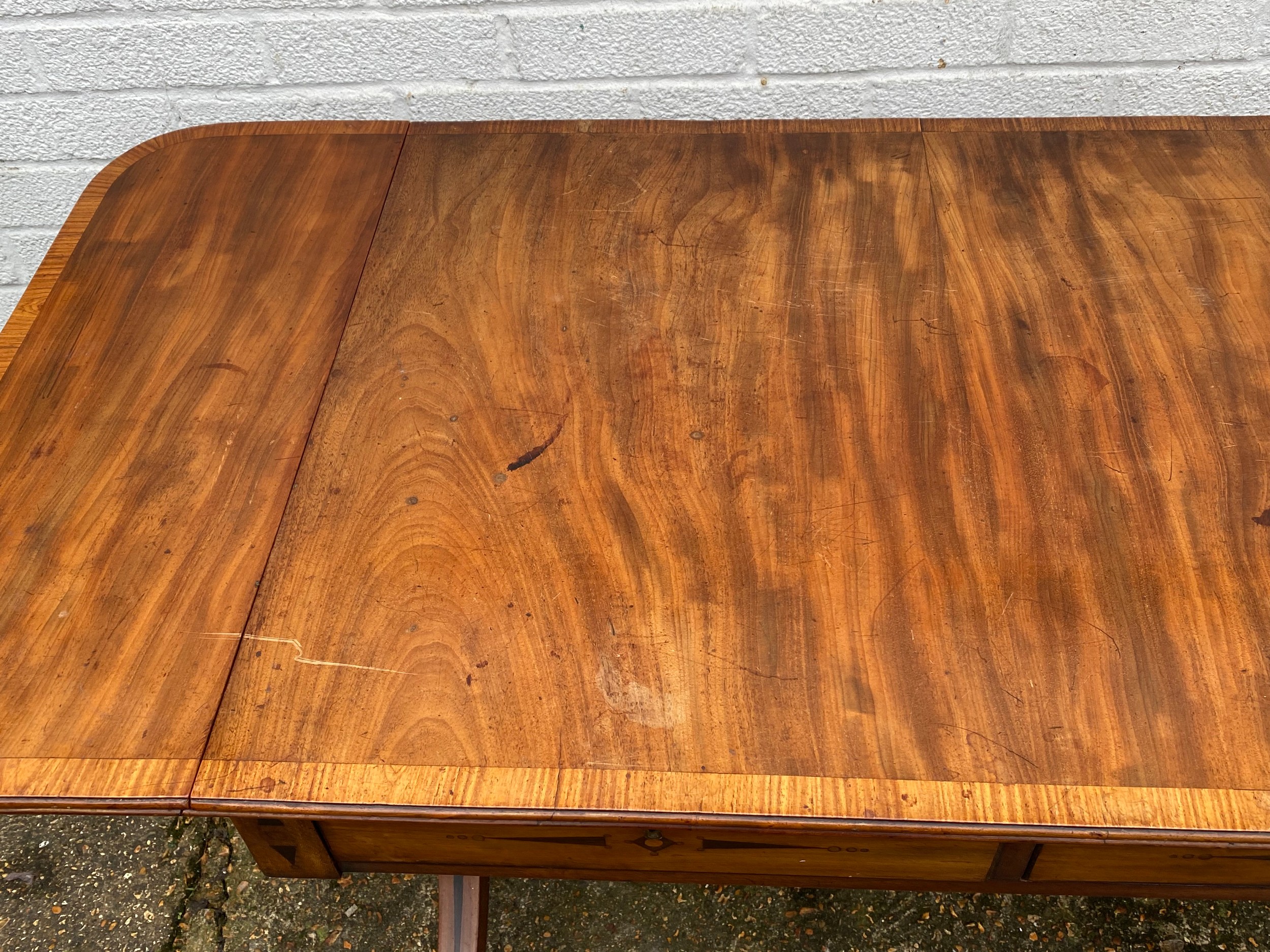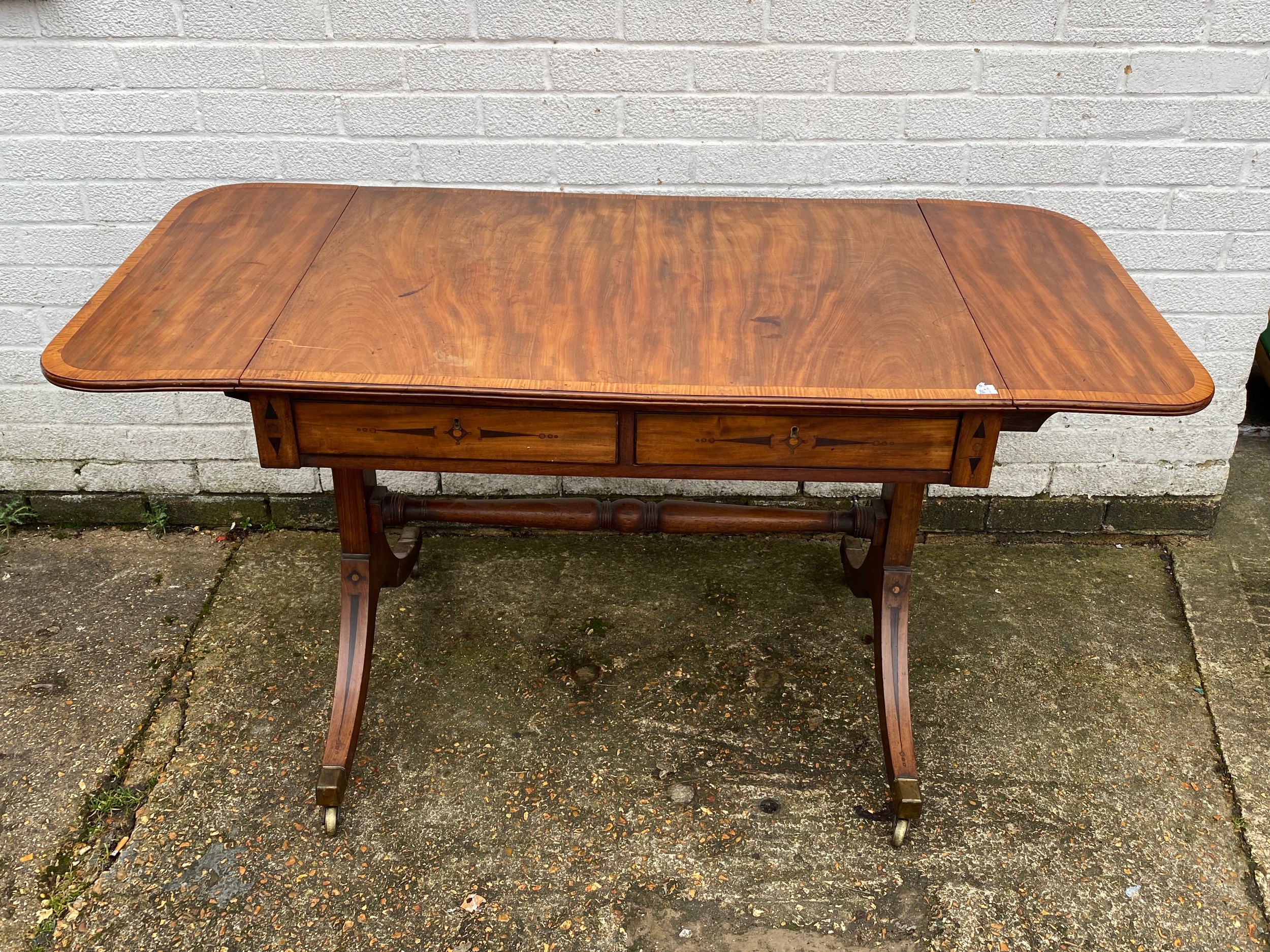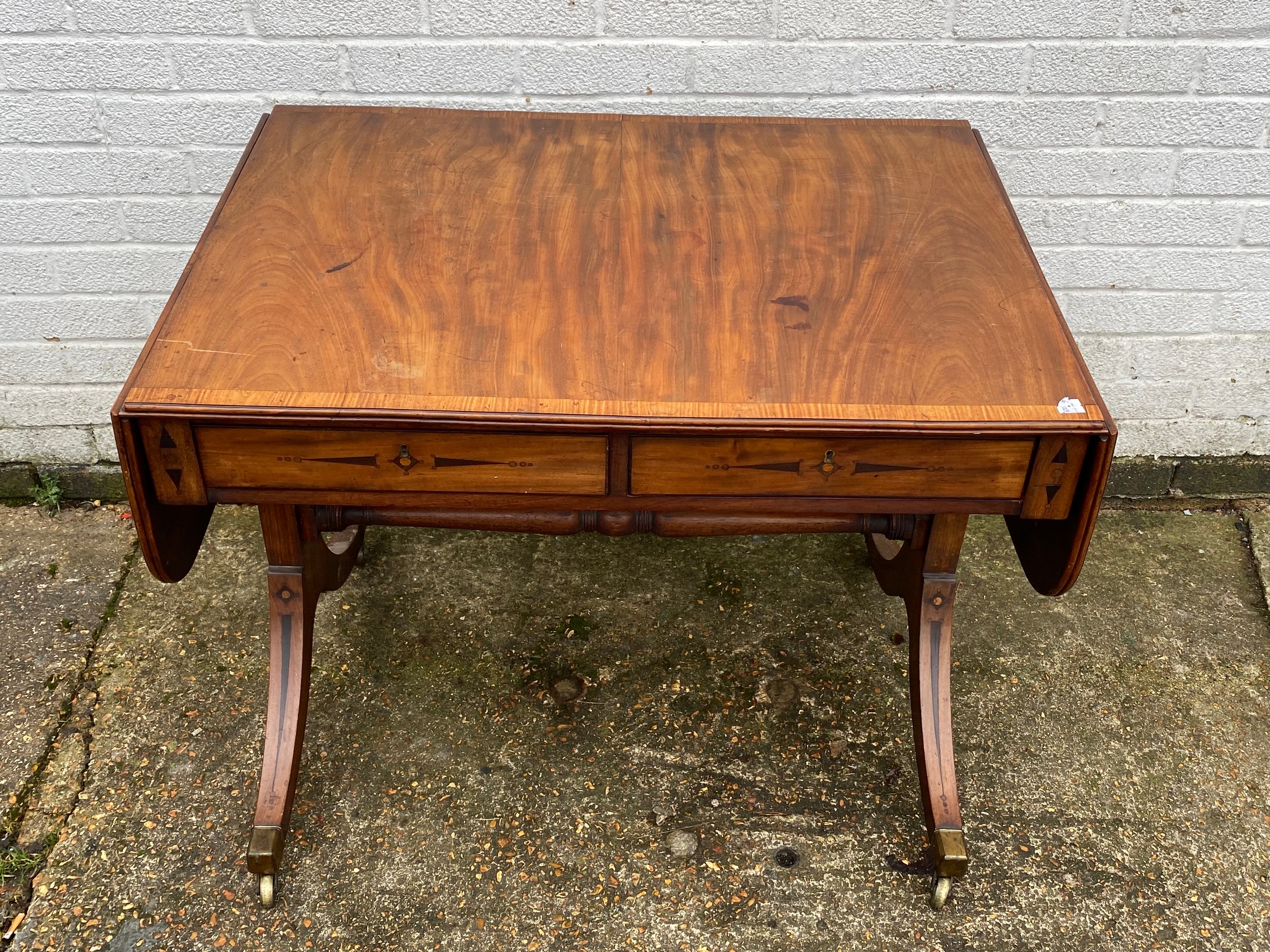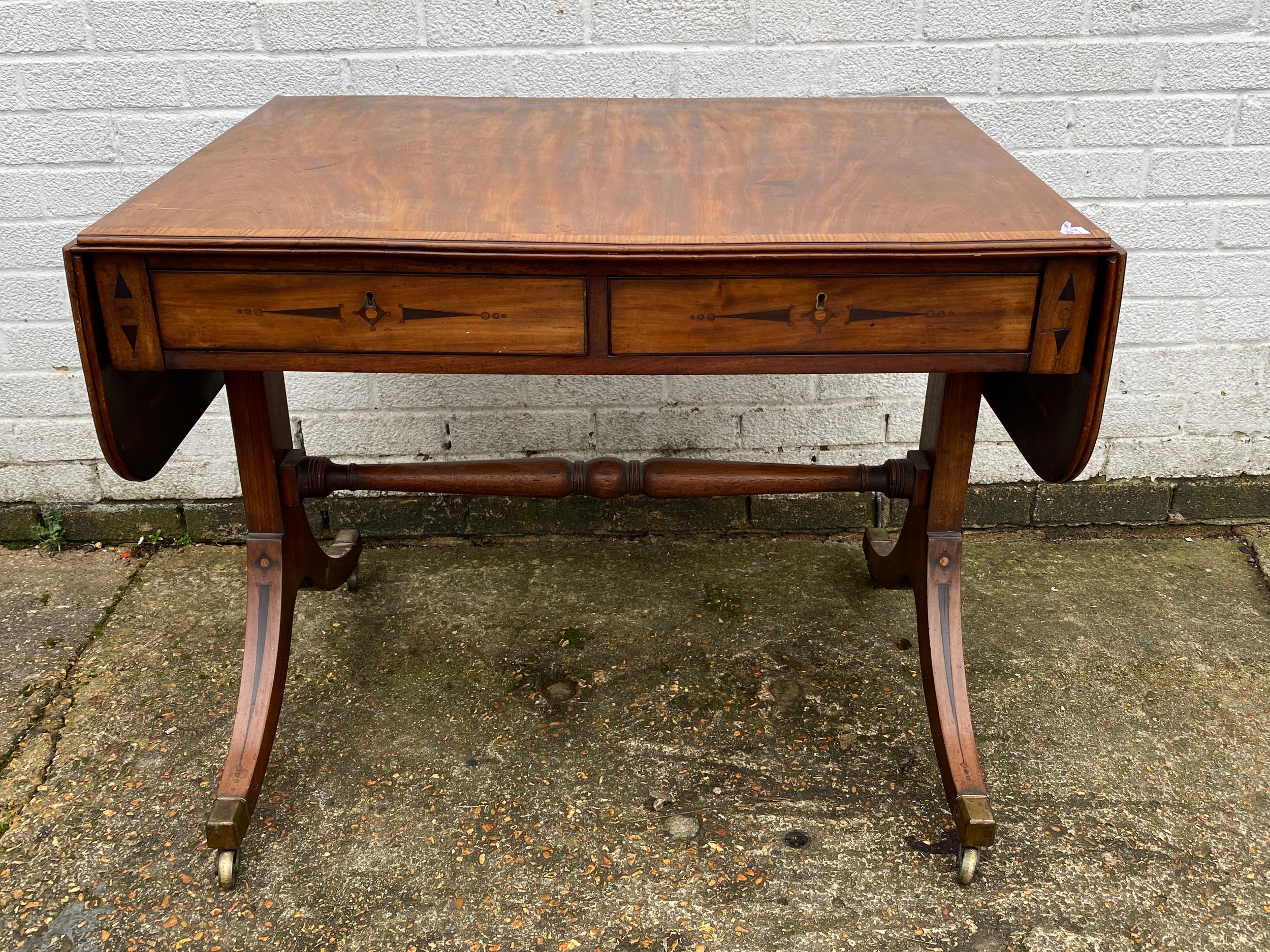 A Georgian style mahogany and crossbanded sofa table, with inlaid detail, with typical drop ends and drawers over end supports linked by a pole stretcher -