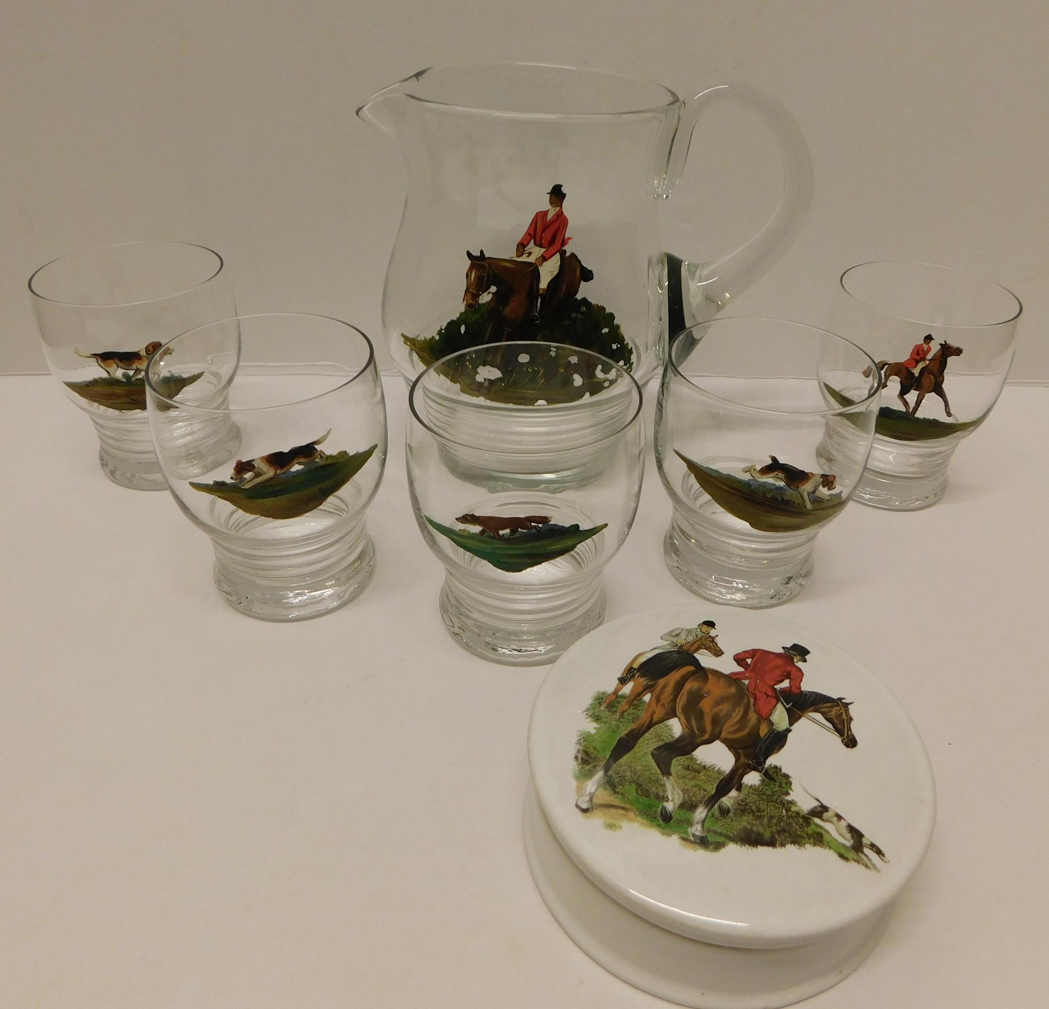 Hunting themed - jug/glasses & lidded dish