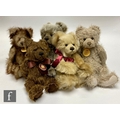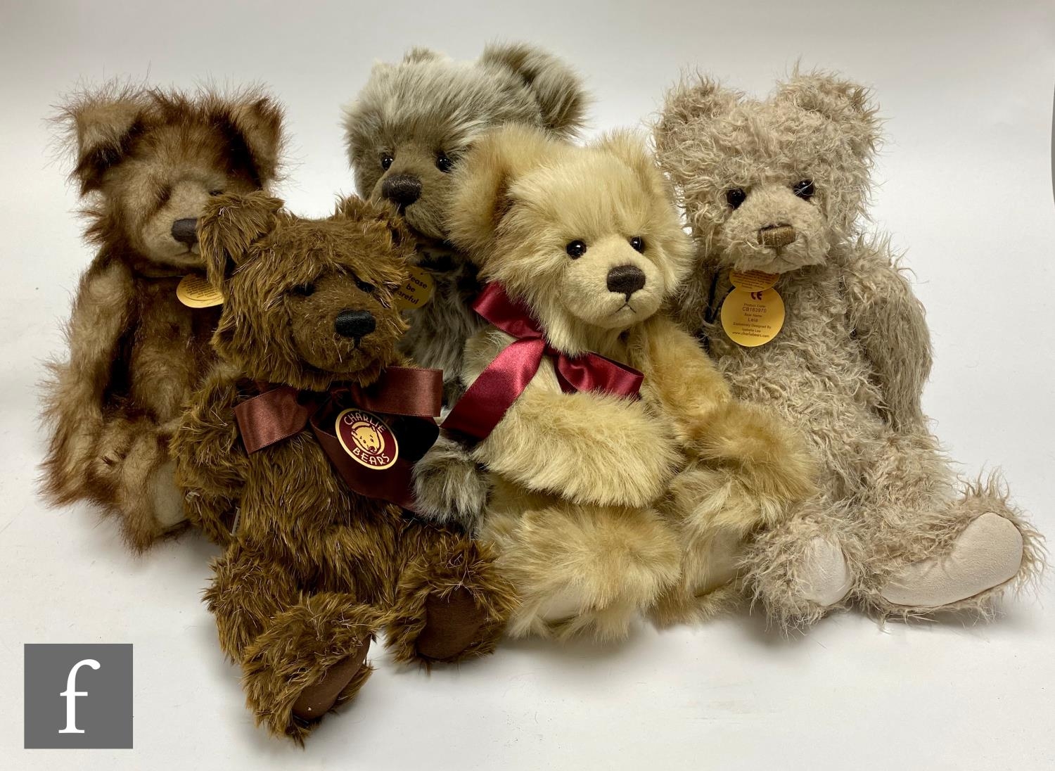 Five Charlie Bears teddy bears, Mason (CB094334), brown plush with frosted tips, height 38cm, Daisy (CB183926), beige long pile plush with darker tips, Theo (CB094083), mink plush with darker tips, Maddison (CB183925), brown plush and Leia (CB183970), beige plush, all with swing tags. (5)